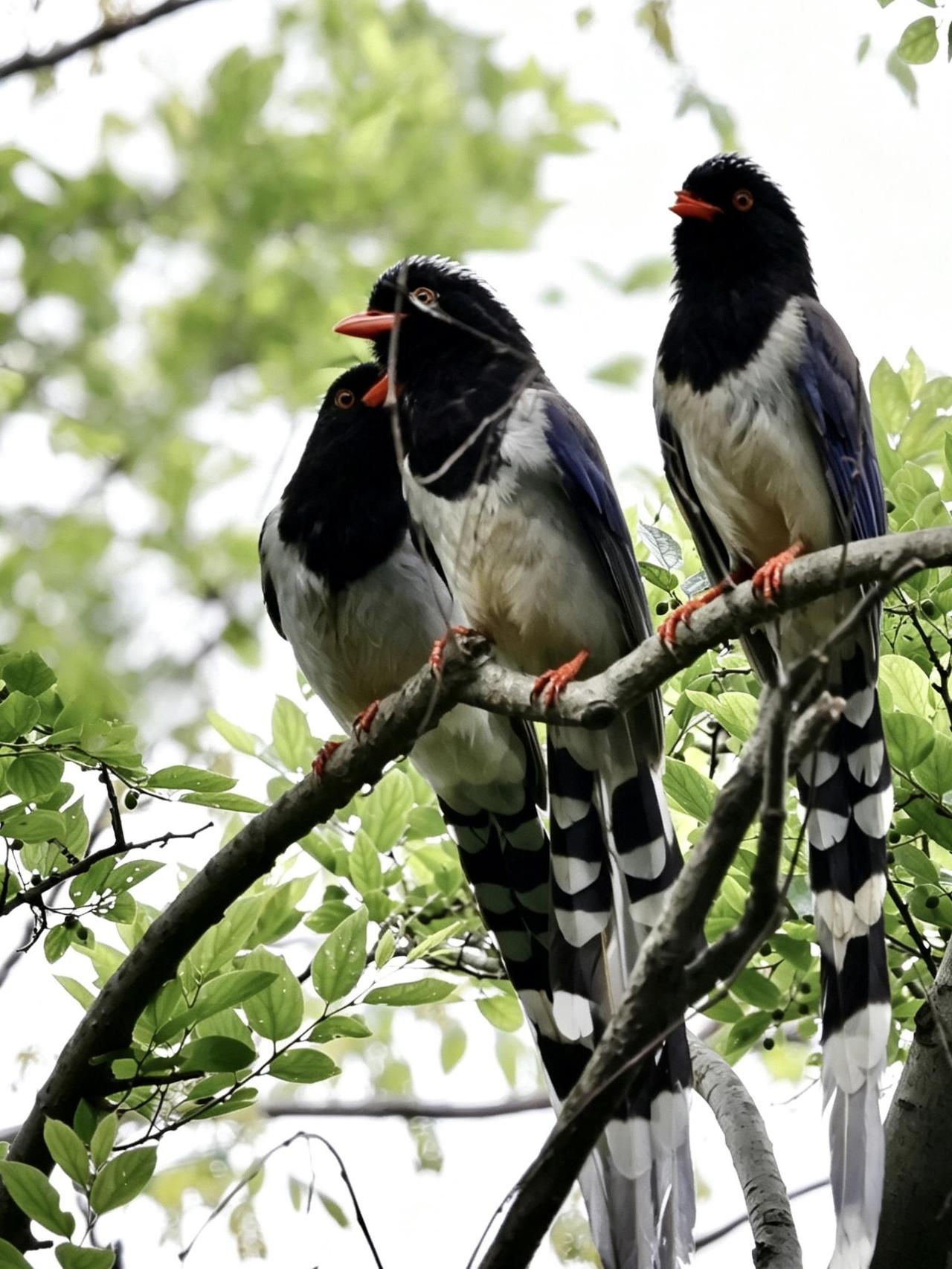 浐灞国家湿地公园遇见不喜欢单独活动的红嘴蓝雀。 (根据多项权威公开资料,红嘴蓝鹊通常成对或结成3–5只、甚至10余只的小群活动,性格活泼而嘈杂,常在树林间跳跃飞行,群体协作觅食,繁殖期还会共同护巢。)