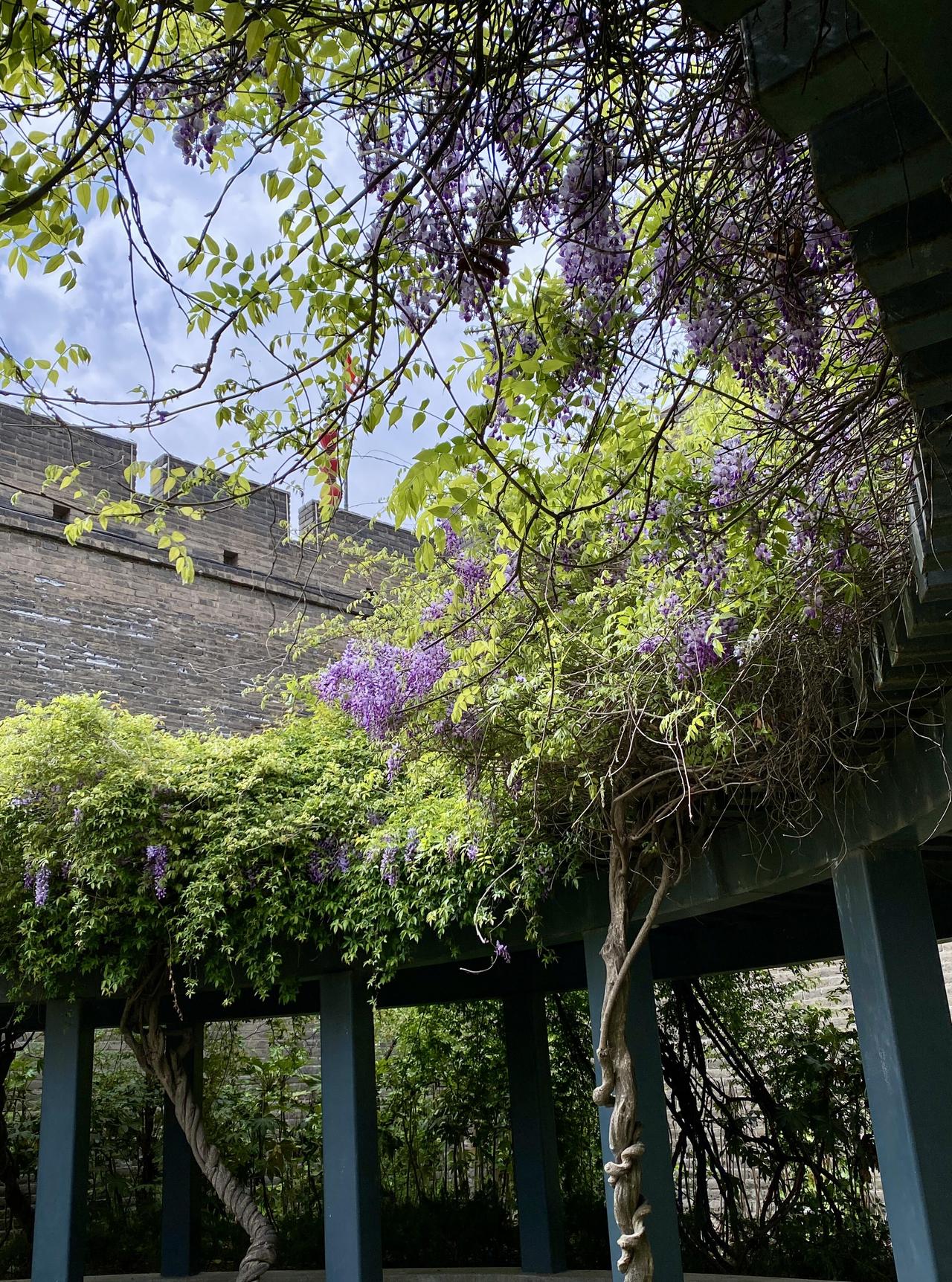 忽然想起李白写的“紫藤挂云木,花蔓宜阳春”,那是写山中的紫藤,自由自在地攀在高树上。可我觉得,城墙上、护城河边的紫藤,另有一种味道。它挨着这六百年的城墙,傍着这千百年的河水,像是懂得些历史的。你看那虬结的藤干,比我的胳膊还粗,扭着、缠着,皮都裂开了,露出褐色的筋骨。该是长了几十年了吧?它见过多少晨昏,经过多少风雨?