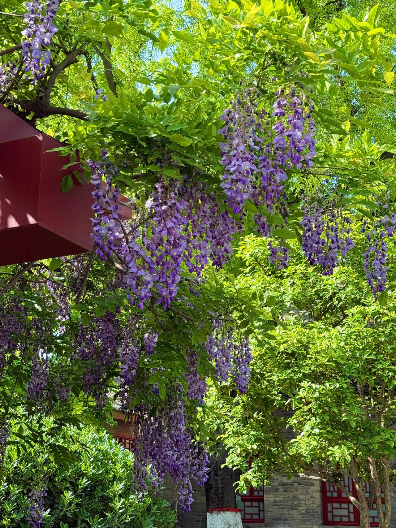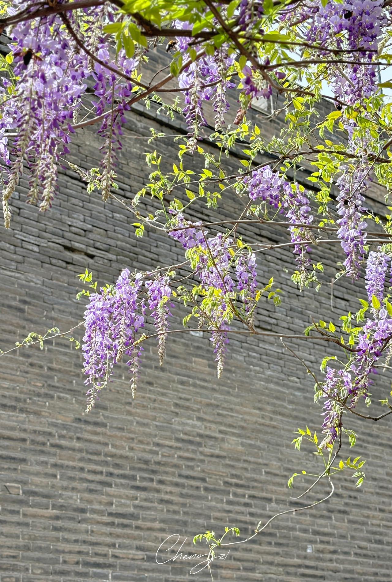 老人走了,我又独自站了一会儿。阳光渐渐斜了,从花穗的缝隙里漏下来,在地上印出细碎的光斑,随着风轻轻地晃。有几片花瓣飘下来,落在我的肩上,又滑下去,无声无息地。我想,花总是要落的,但明年还会开。城墙会一直在这里,河水会一直流着,紫藤也会一直开着。