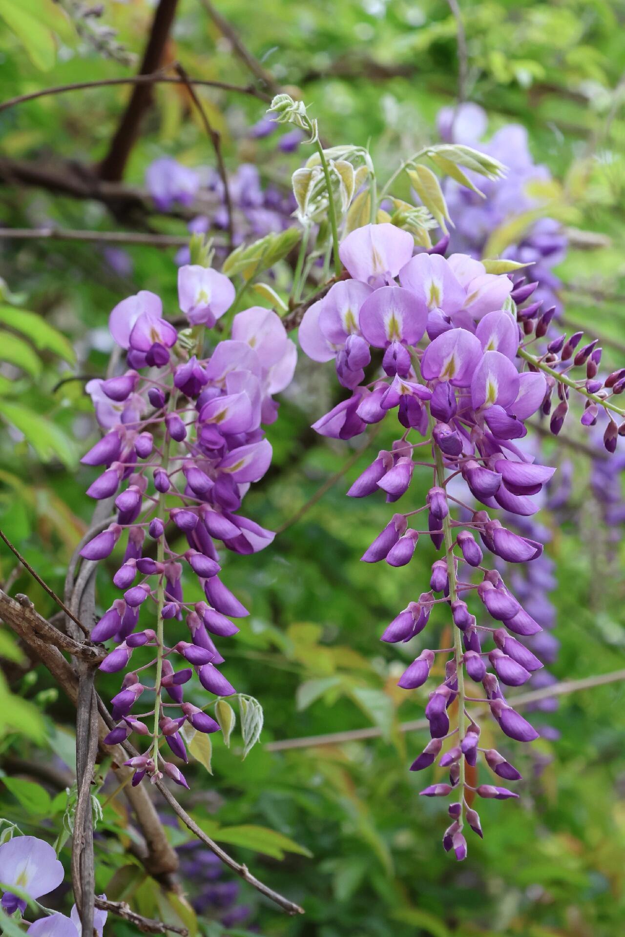 微风吹过,满架的花穗轻轻摇曳,像风铃般洒落淡淡的幽香。阳光透过花隙,洒下斑驳的光影,把地面染成了梦幻的紫色。成串的蝶形花朵,密密匝匝地挤在一起,又像一群依偎着的蝴蝶,随时准备振翅飞舞。