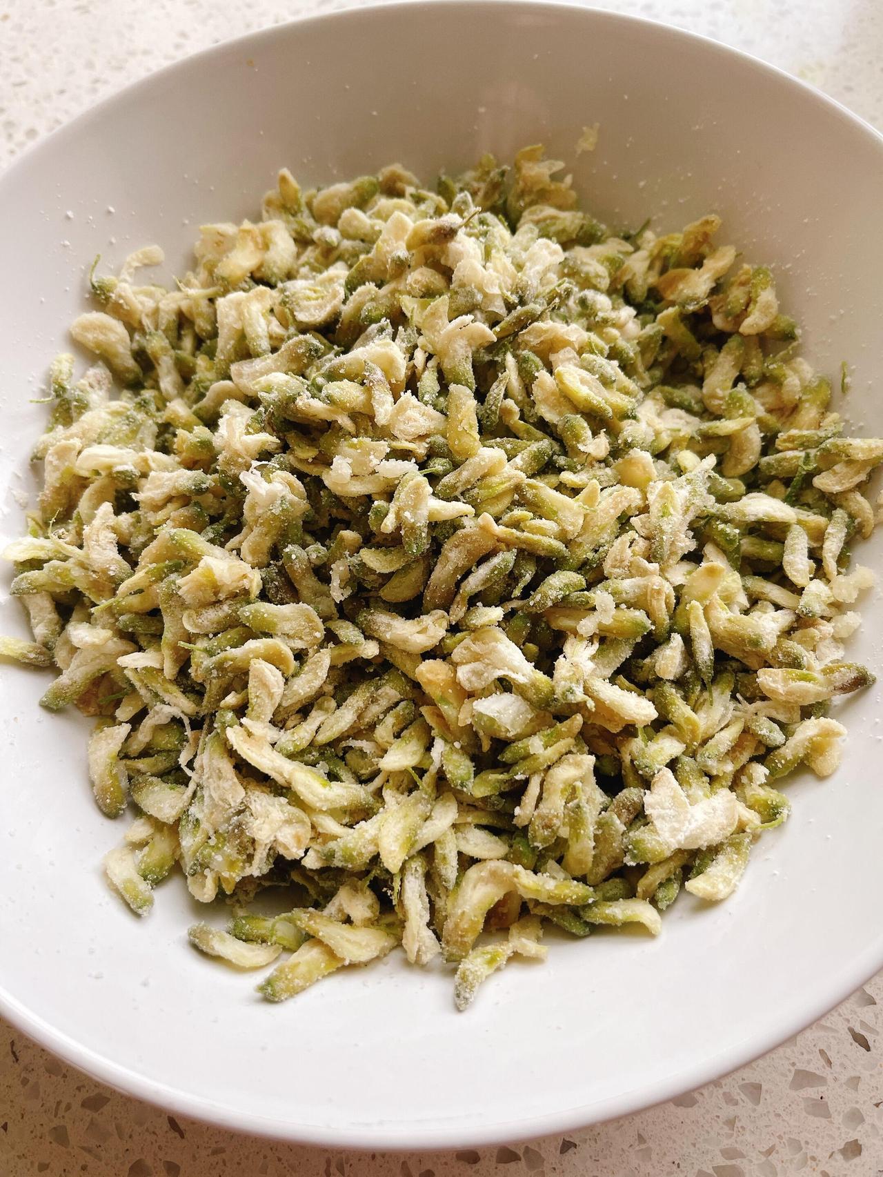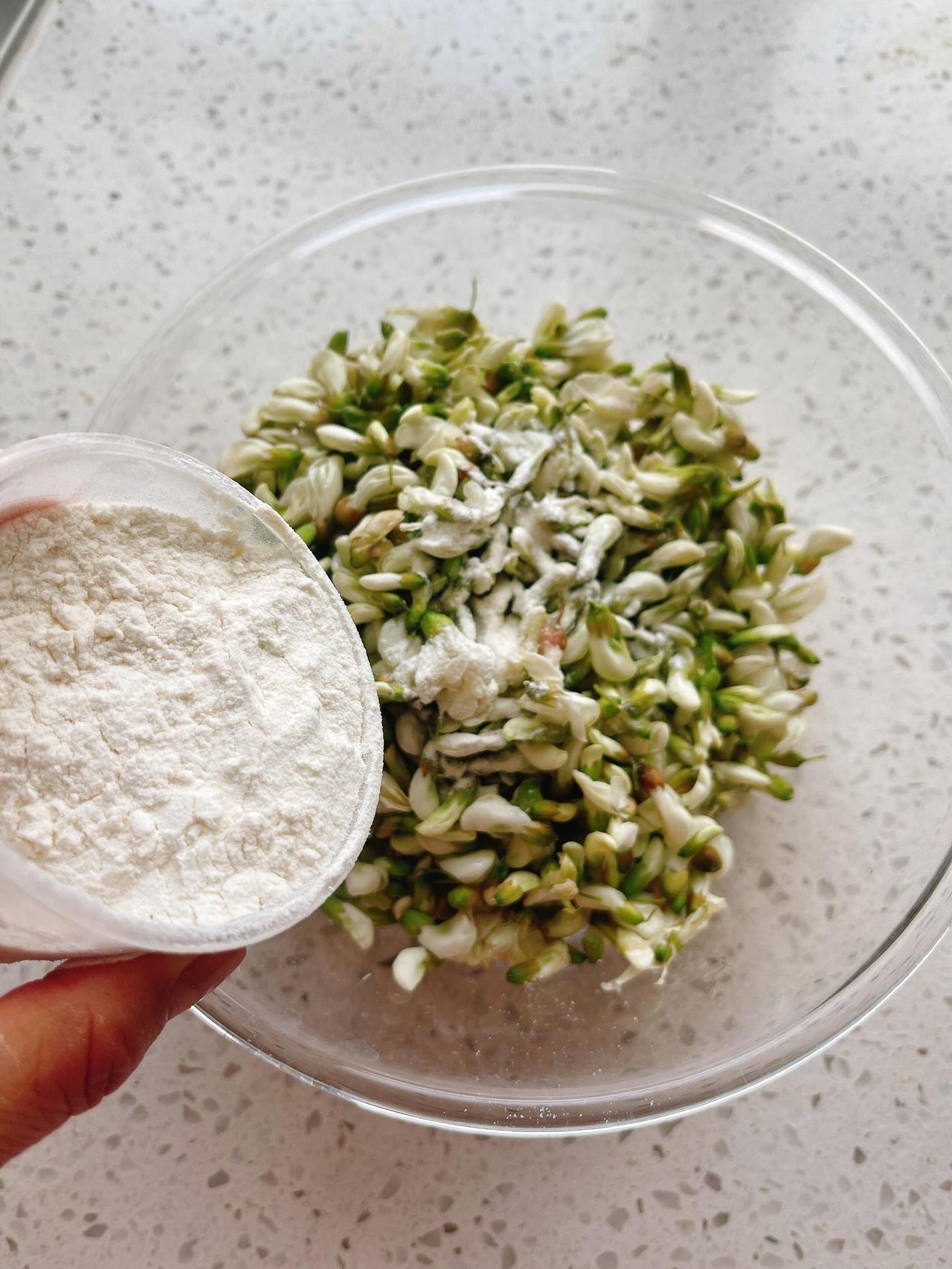 面粉一点点撒进去,用手轻轻翻拌。奶奶以前做这个,从来不用量杯,凭的是手上感觉——面粉多了太硬,少了粘不成团。我也学着她的手势,让每一朵花都均匀裹上一层薄粉。花瓣裹住面粉的瞬间,白里透着浅绿,仿佛把四月的阳光和风都揉了进去。
