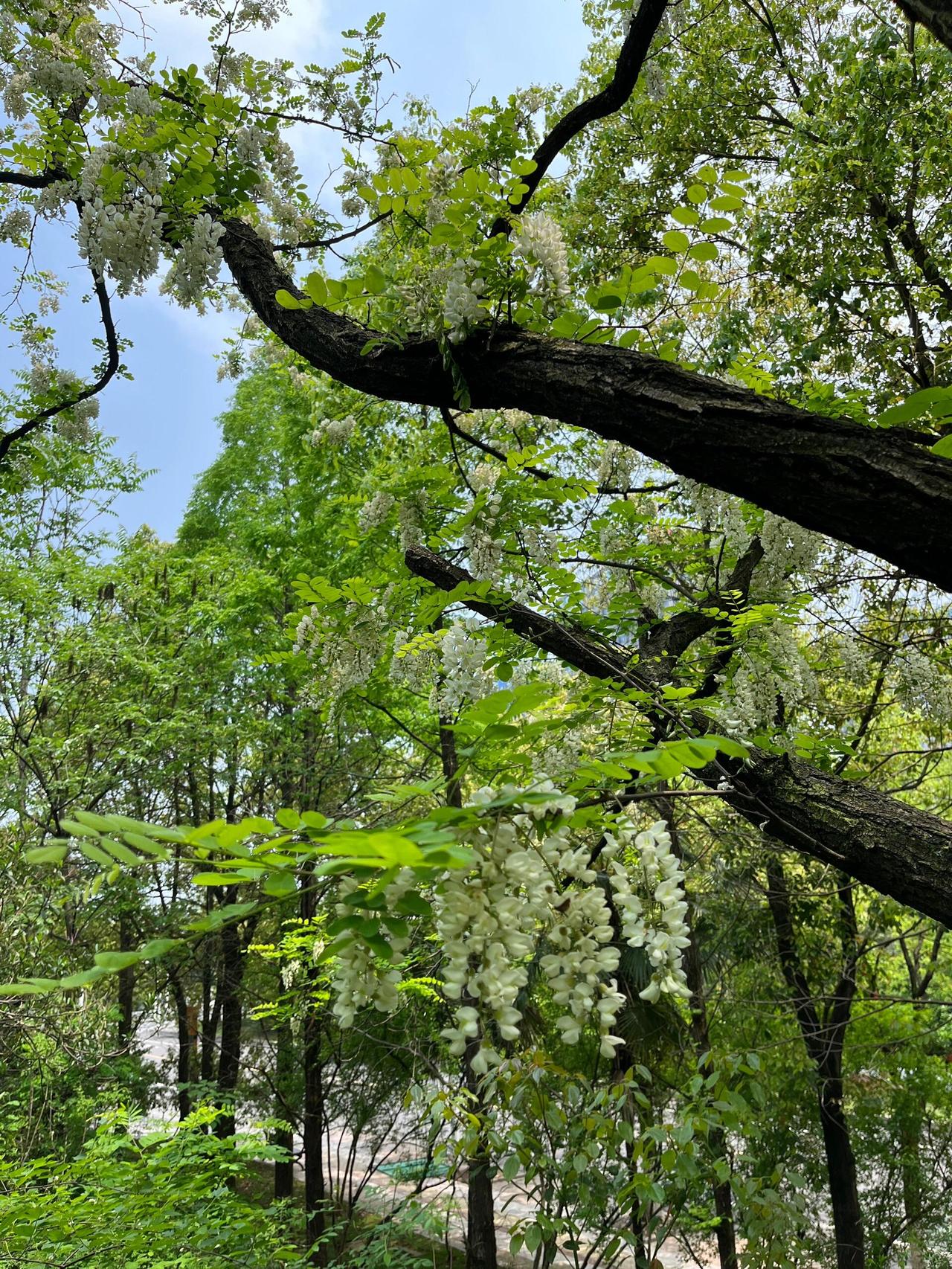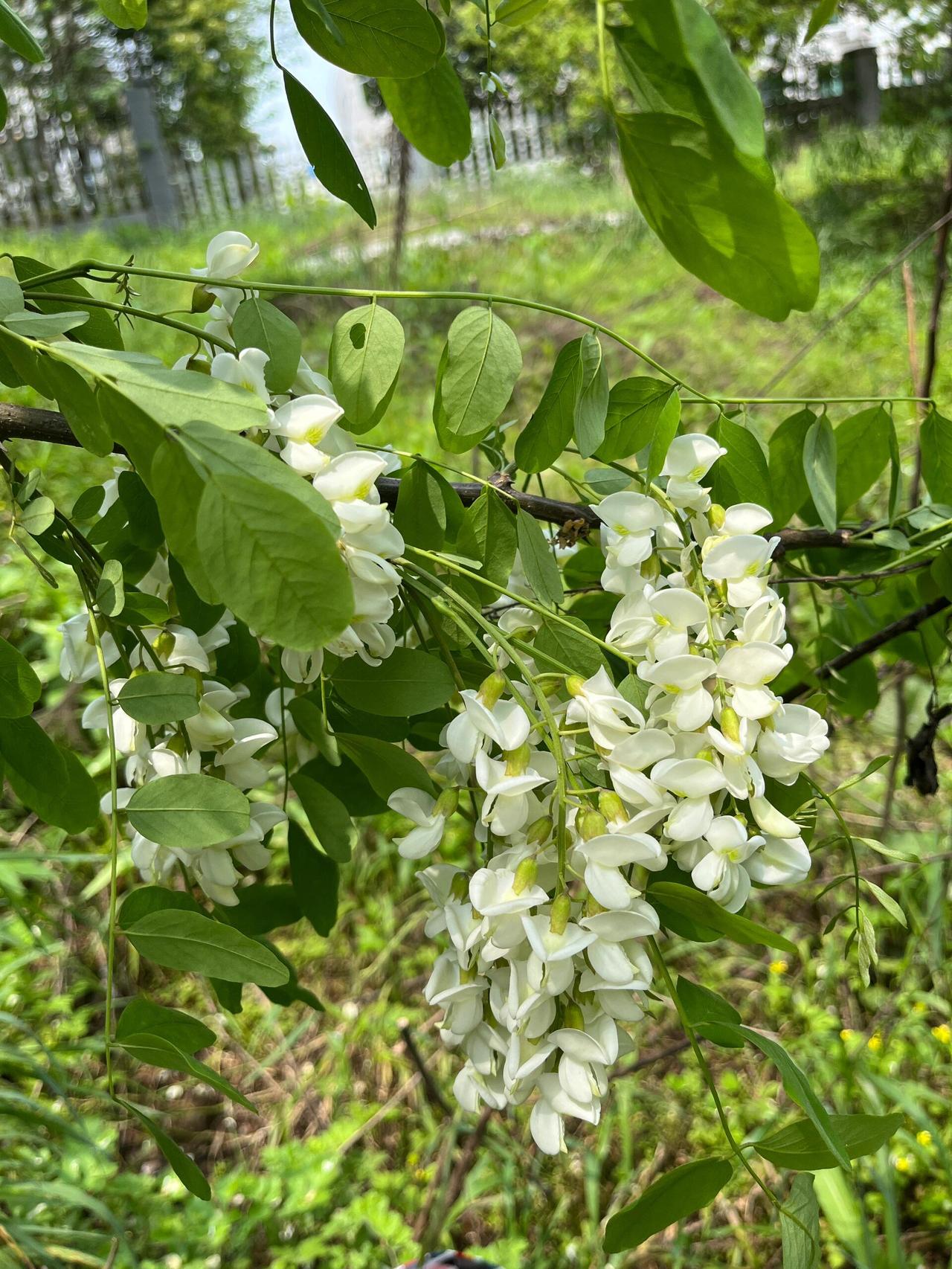 那几棵洋槐开得正好,花瓣上挂着细密的水珠,在初升的阳光下亮晶晶的。有人举着竹竿在够,地上铺了一层刚打下来的槐花串,白生生的,像刚落的薄雪。