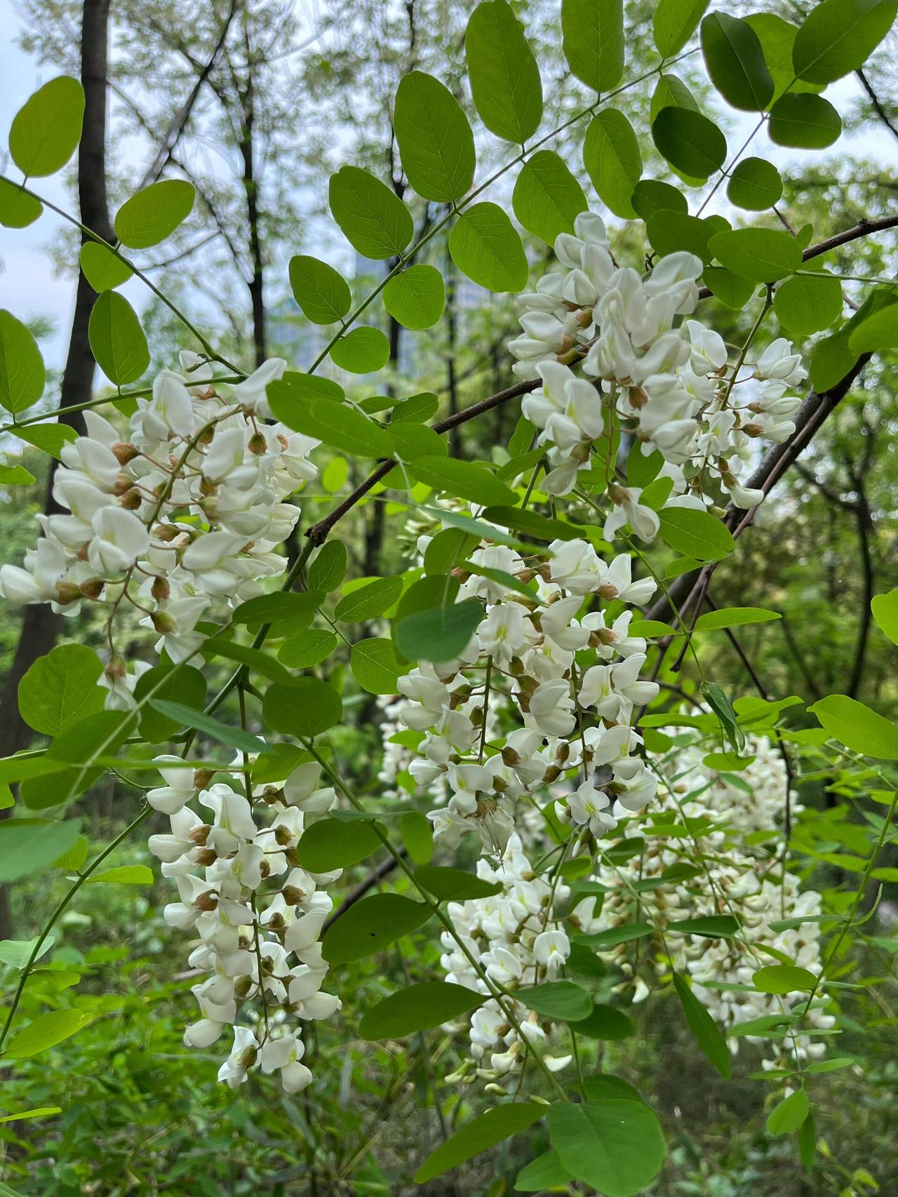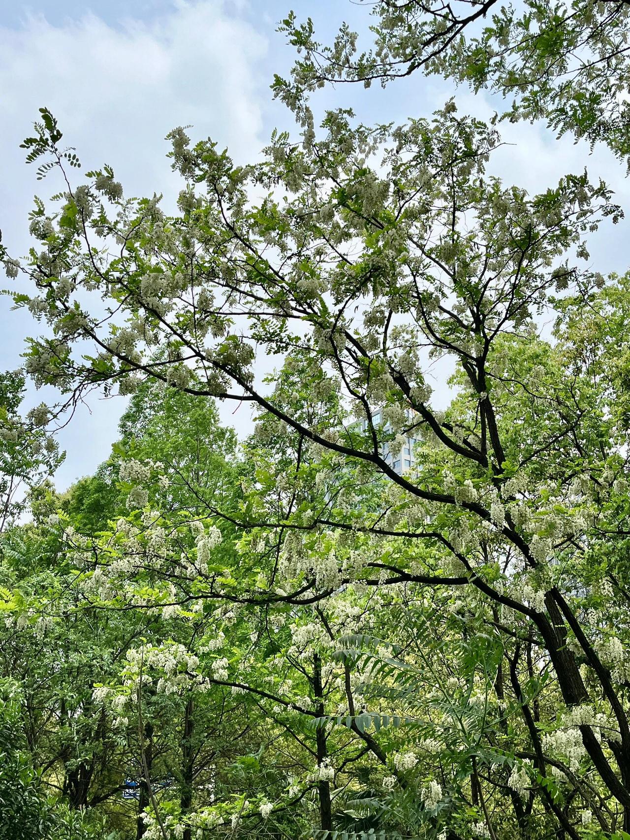 清晨跑步到大明宫遗址公园,整个公园都飘着槐花甜丝丝的味道。太液池向南五百米处有一片槐树林,我循着香气走过去,晨露还没散尽,树下已经窸窸窣窣响起了竹竿声。