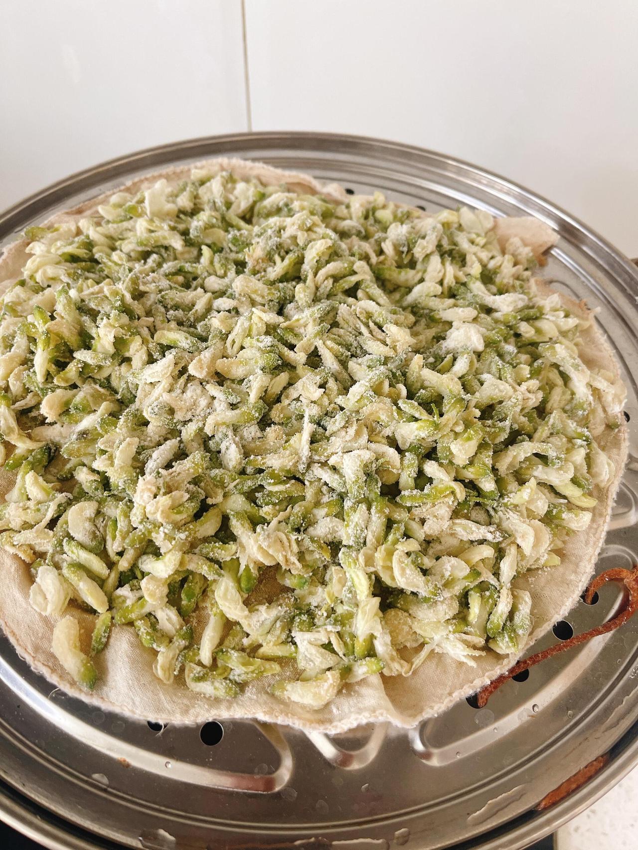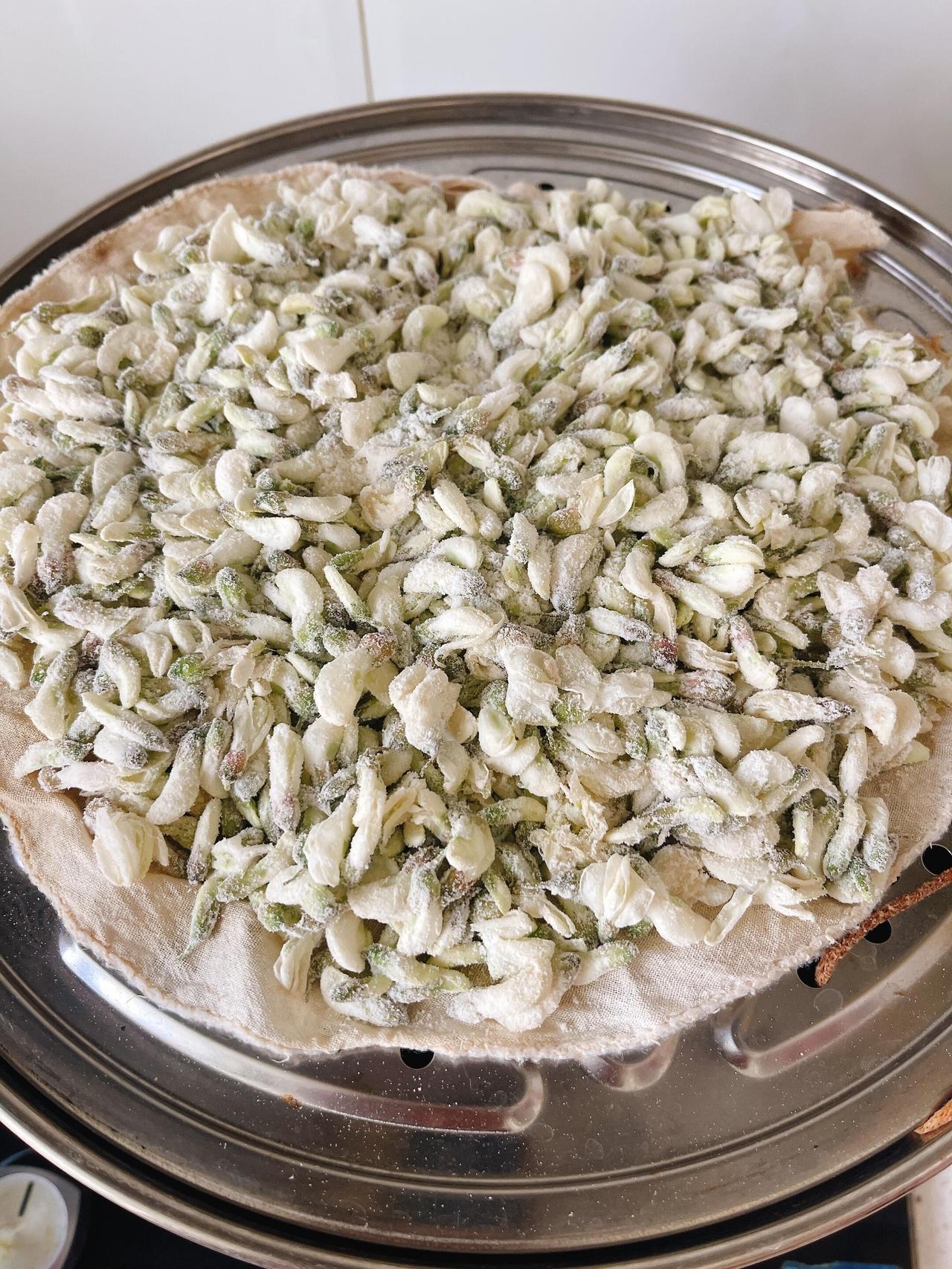 掀开锅盖那一瞬,热气扑面而来,带着槐花特有的清香,比生的时候更柔和、更温厚。麦饭的颜色却不大好看——面粉蒸熟后泛着灰白,花瓣缩水了,颜色发暗,卖相实在算不上精致。有的地方面多了结成疙瘩,有的地方花瓣还露在外面,歪歪扭扭地堆在盘子里,像一床没铺平的薄被。
