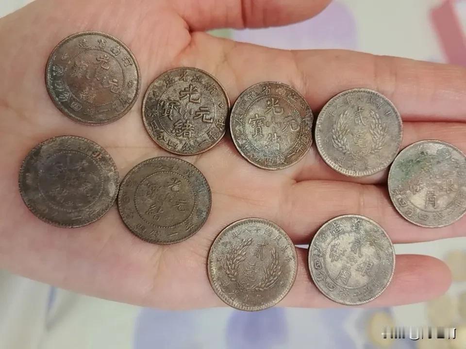 谁能帮忙看一下这是真假啊,在我家有十几年时间,亲戚当年送给孩子的,光绪元宝,有浙江省造,有云南省造,还有河南省造,江南省造,后背都是龙,就是有的图案清晰,有的不清晰,底下写着库平一钱四分四厘,还有一个写两角银币,那个是民国二十一年,那个是真的银子吗