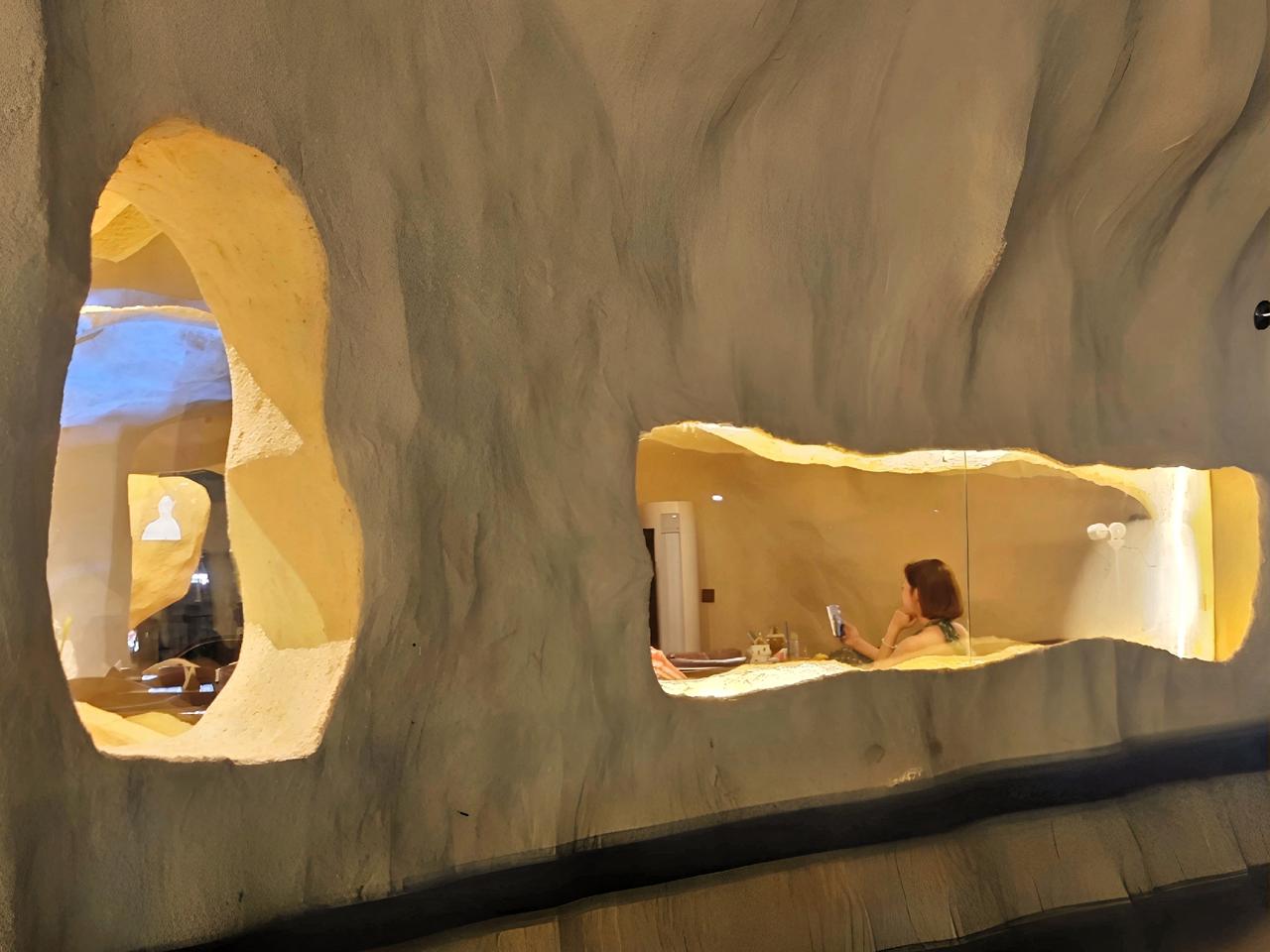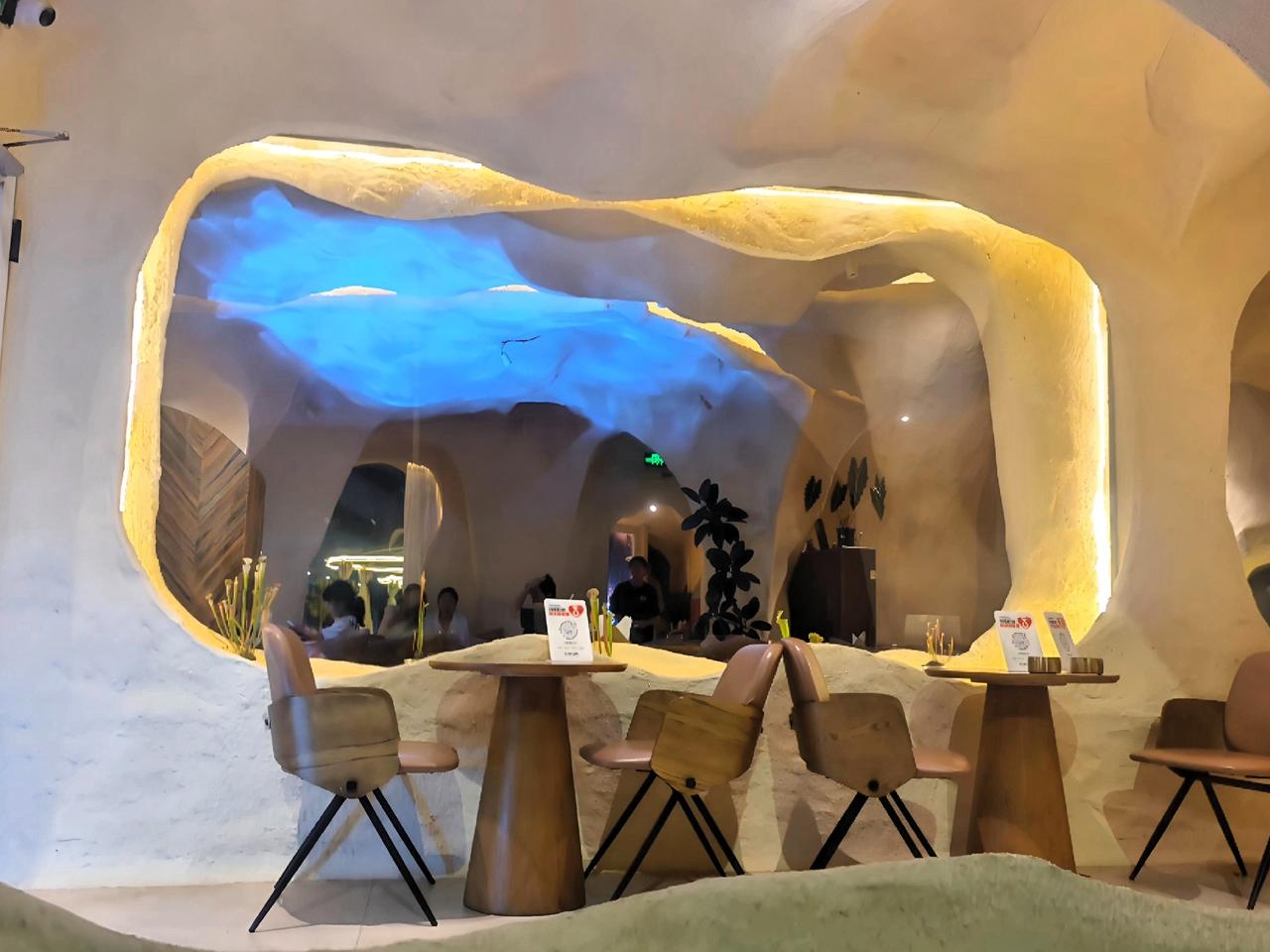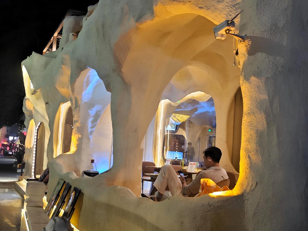 当暖色灯光从肌理墙面缓缓漫出,洞穴建筑粗犷质朴的轮廓,变得越发柔和安静。