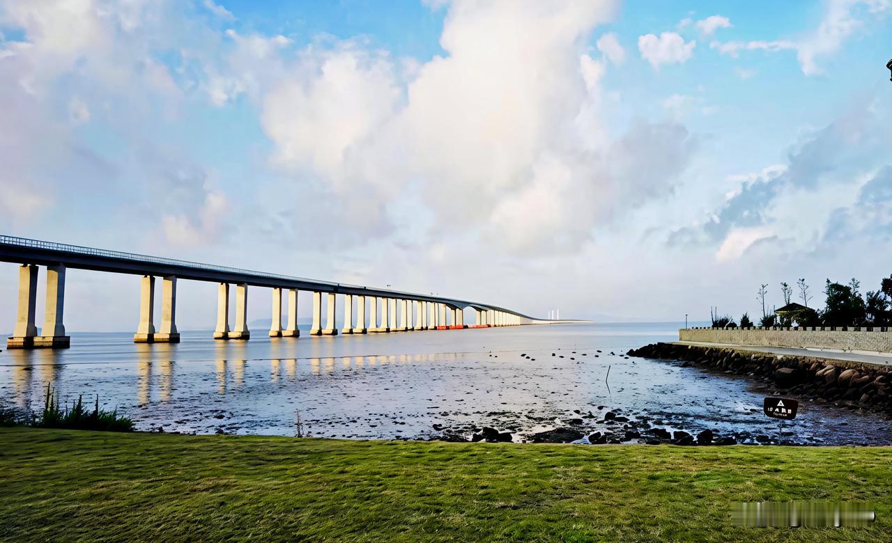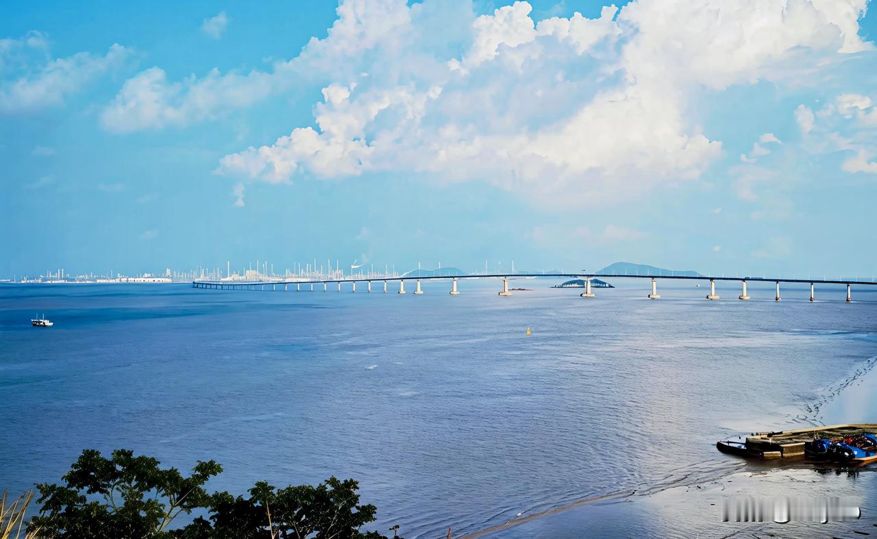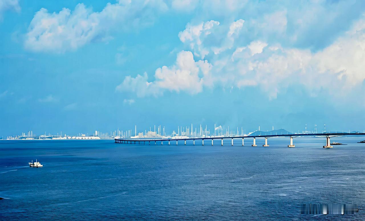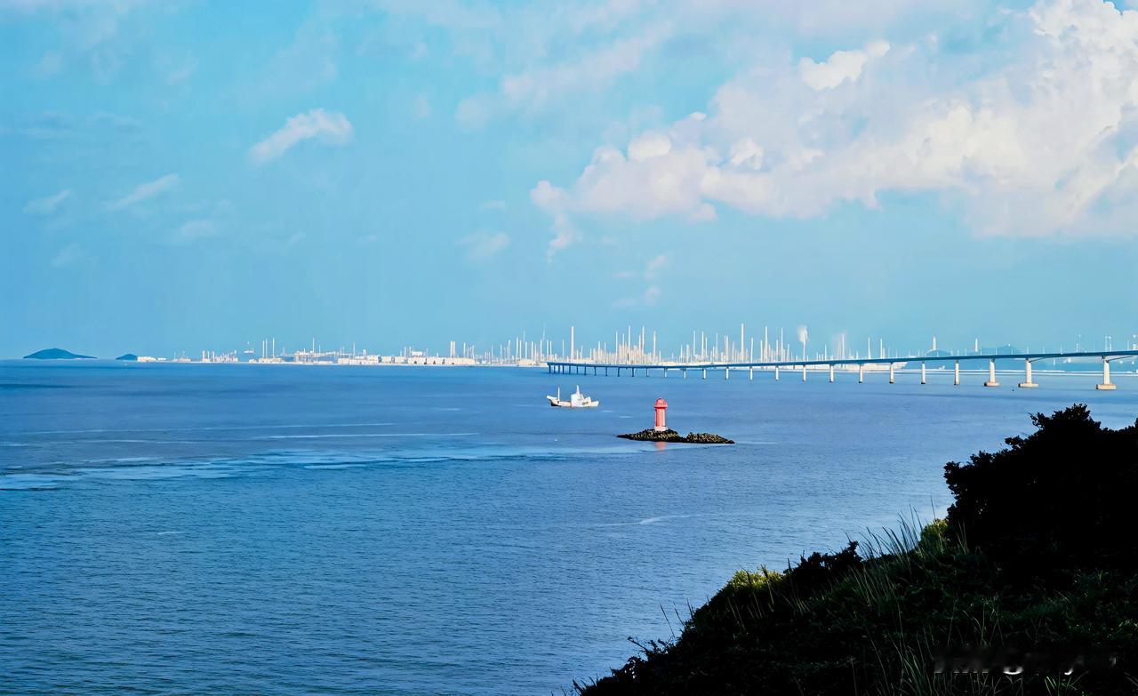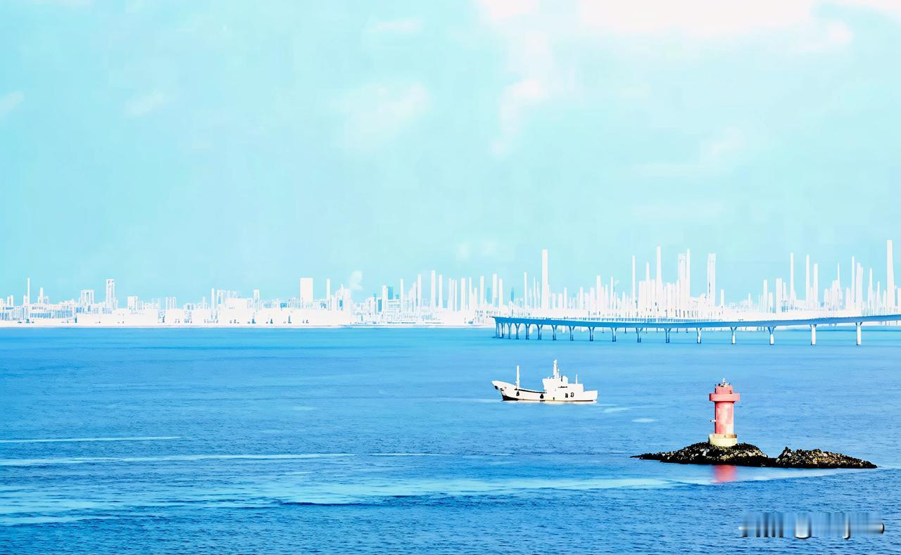 碧海之上,长桥卧波,舟岱大桥如银龙横亘海天。白墩列阵,红标映浪,三塔遥指云端。晴