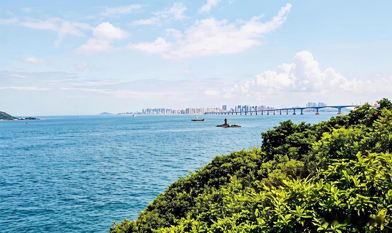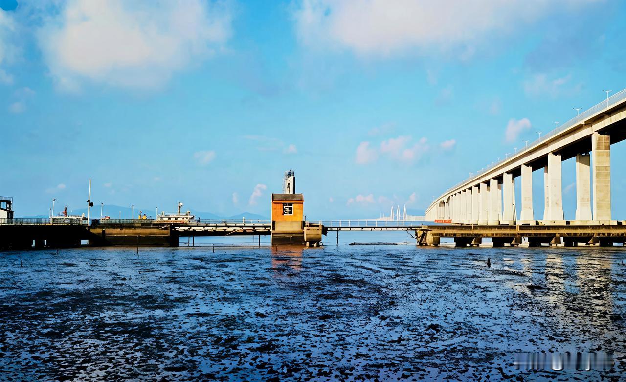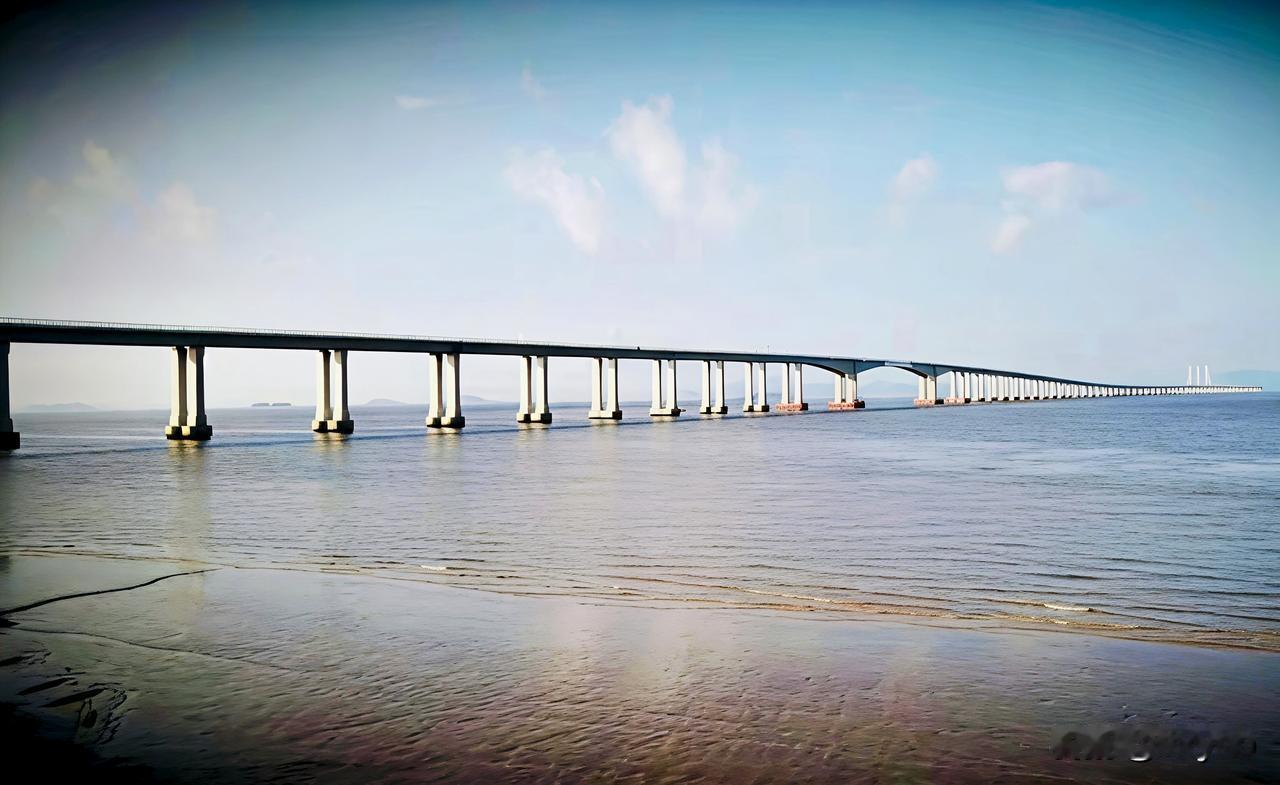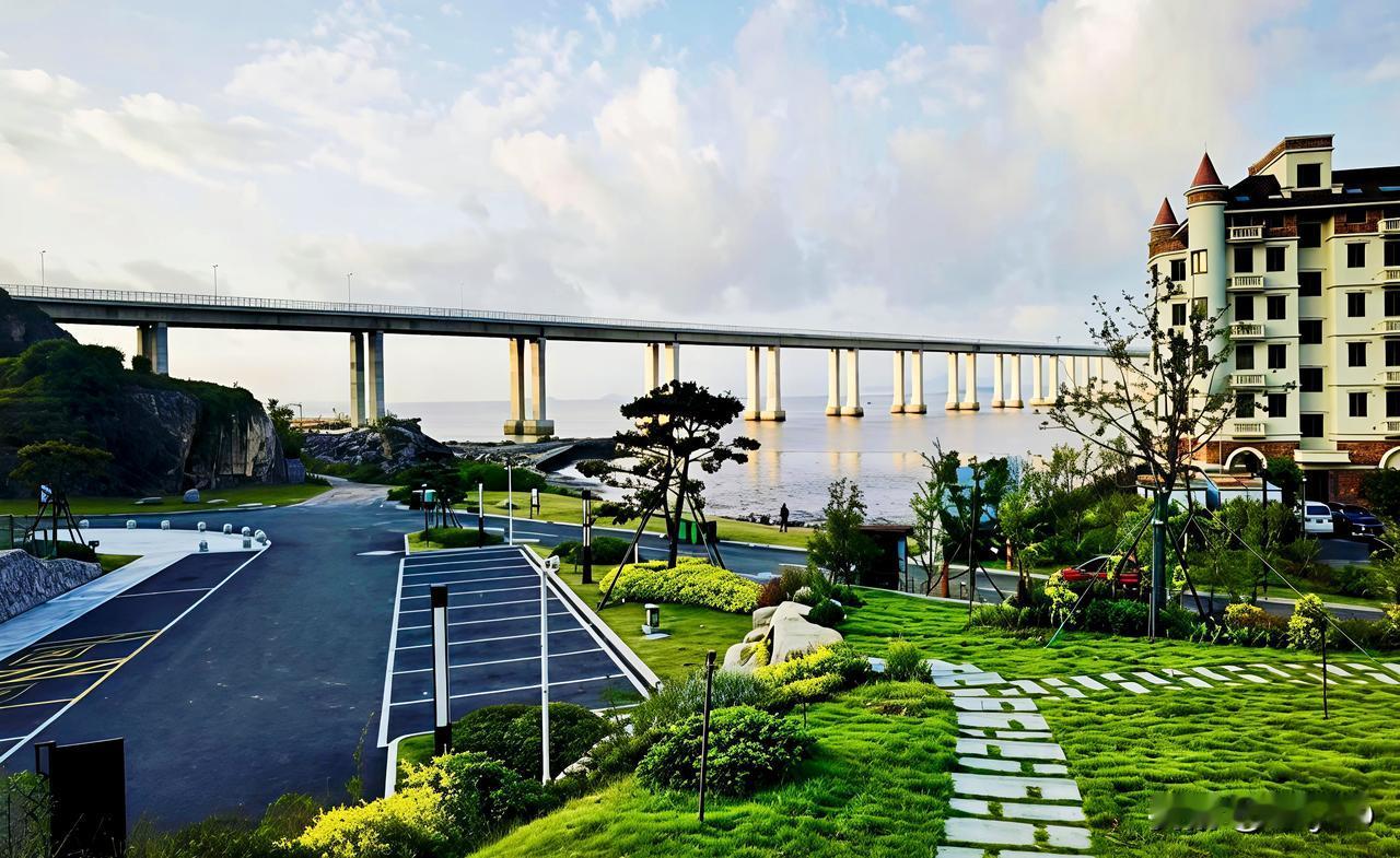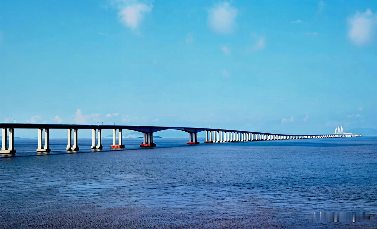 碧海之上,长桥卧波,舟岱大桥如银龙横亘海天。白墩列阵,红标映浪,三塔遥指云端。晴