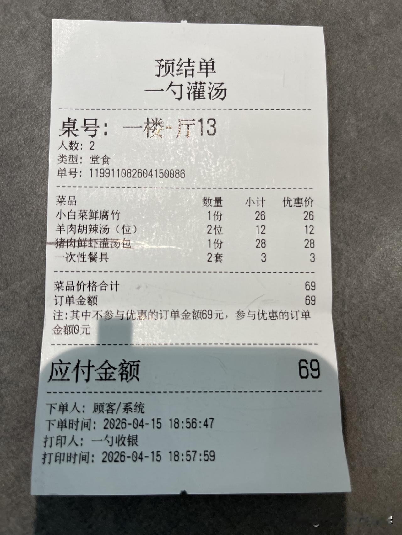 这一餐总共花费69元,价格实惠,性价比颇高。