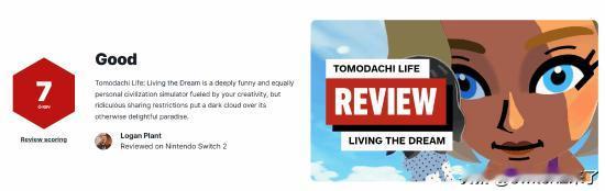 IGN为任天堂新作《朋友收集:梦想生活》打出7分的评价,测评人认为本作是一款极其有趣且极具个人色彩的文明社会模拟器,由你的创造力驱动,但荒谬的分享限制给它原本愉悦的天堂蒙上了一层阴影。