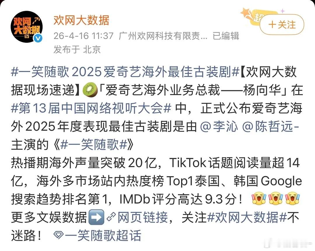 一笑随歌2025爱奇艺海外最佳古装剧,恭喜陈哲远李沁!