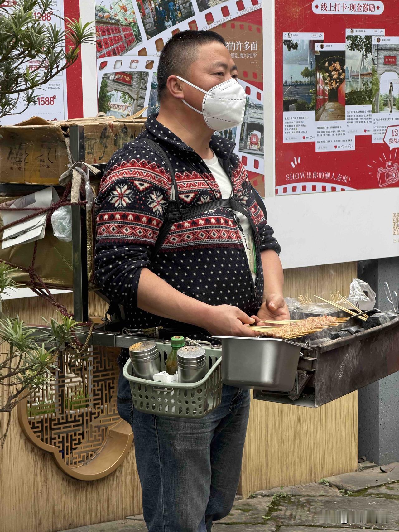 这种站着的烧烤摊你见过吗,感觉应该特别重吧,这个摊主为了生活也太不容易了,也太拼了吧,不知道挣不挣钱,反正就凭着这身行头就很吸引人,想去买两串试试