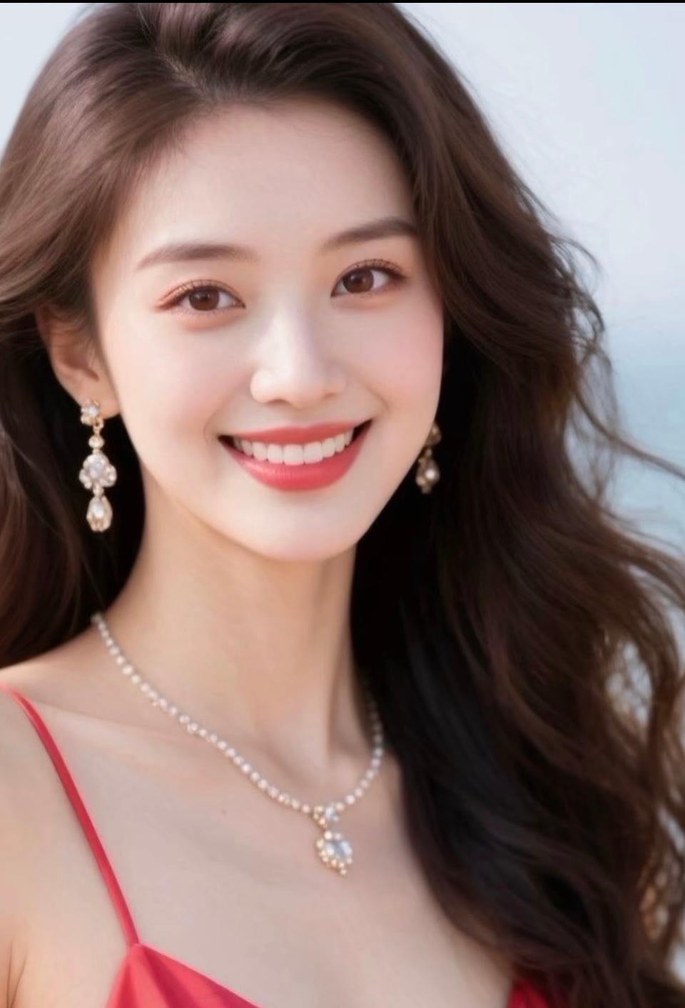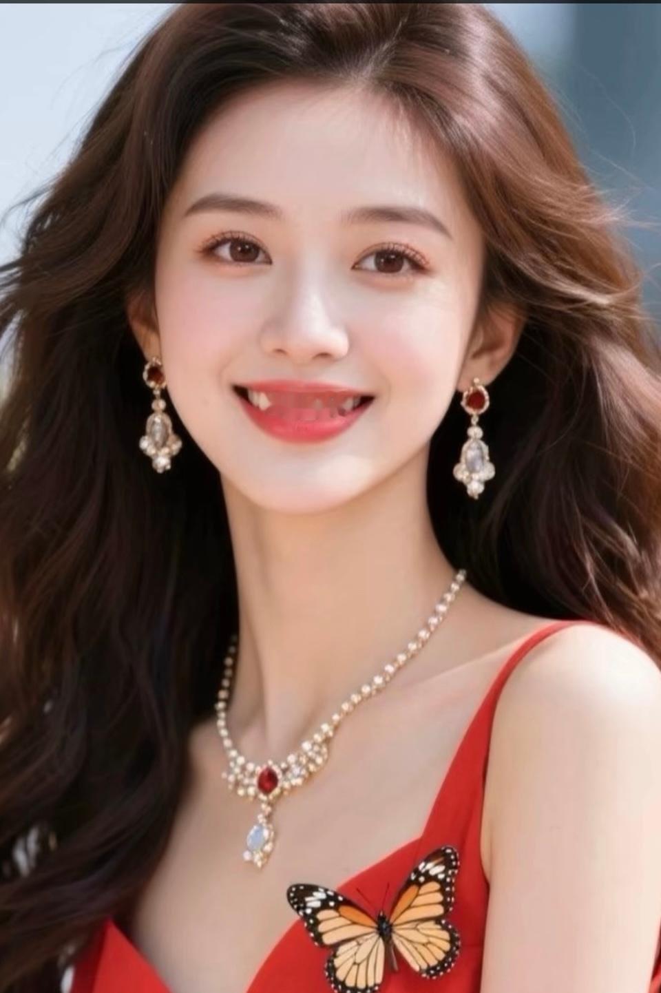 甜美微笑,优雅珠宝,红裙飘逸,宛如蝴蝶翩翩起舞。