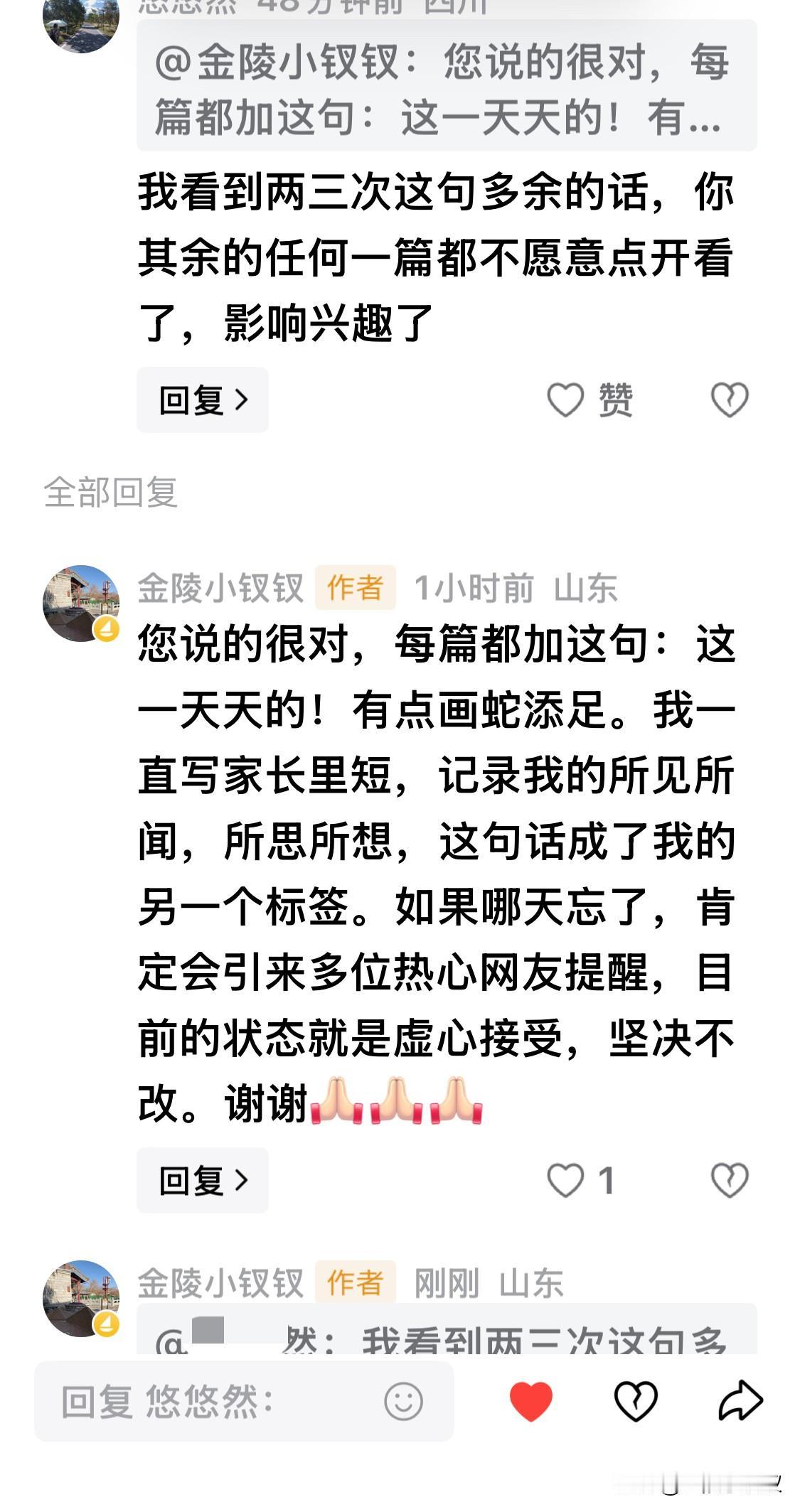 我没有去他(她)的主页浏览,同样还是那句话,我尊重每一位给我留言的朋友,无论是大咖还是小白,所以我马上给他回复了一条,并且用了您字,因为我不知道他是男是女,有多大年纪。我写的如下:您说的很对,每篇都加这句:这一天天的!有点画蛇添足。我一直写家长里短,记录我的所见所闻,所思所想,这句话成了我的另一个标签。如果哪天忘了,肯定会引来多位热心网友提醒,目前的状态就是虚心接受,坚决不改。谢谢[祈祷][祈祷][祈祷]