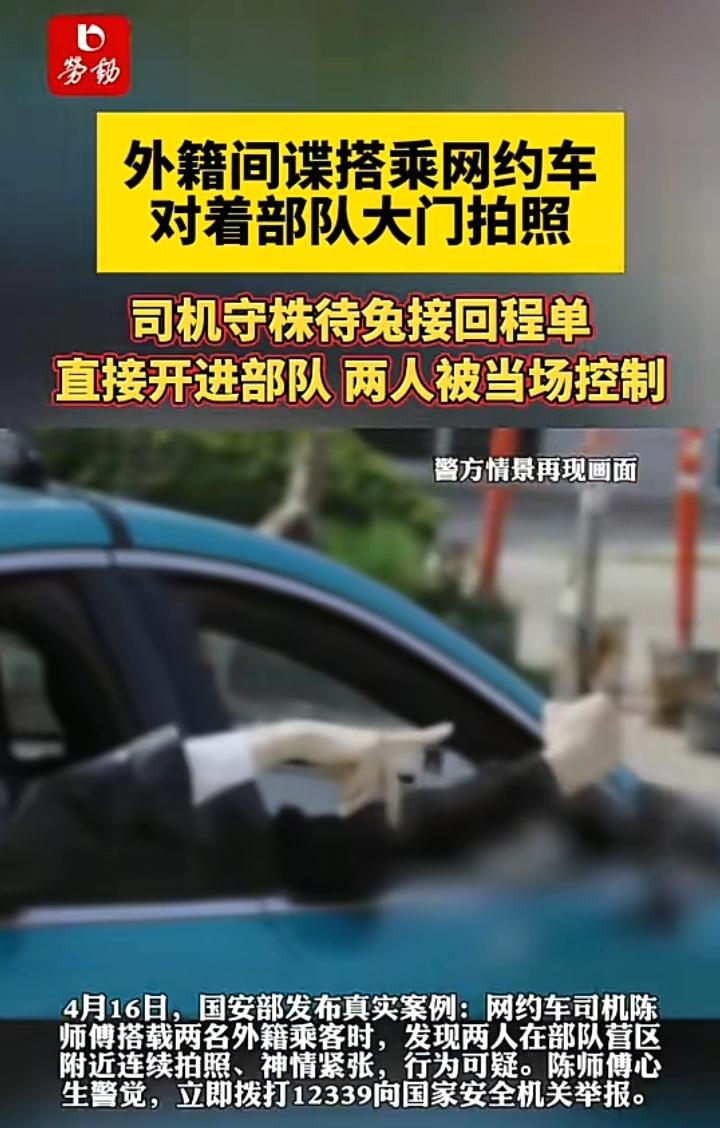 心有余悸的陈师傅准备离开,可他越想越不对劲,于是他心生一计,这个地方网约车比较少,他们回去一定会再搭车,于是他假装离开实则打开了所以的网约车平台,果不其然那两名外籍乘客通过其他平台再次打车,可他们不知道此时还是陈师傅的车,当他们坐上车后要去某部队的训练基地,此时陈师傅嘴上说好,可他悄悄的改变了行程路线,直奔某部队的哨兵处,两名外籍人员立刻慌了神,拿出手机狂删照片,可还是留下了痕迹,经过仔细搜索他们手机里都是机要部门的位置和入口图片,经过询问确实是外籍间谍。