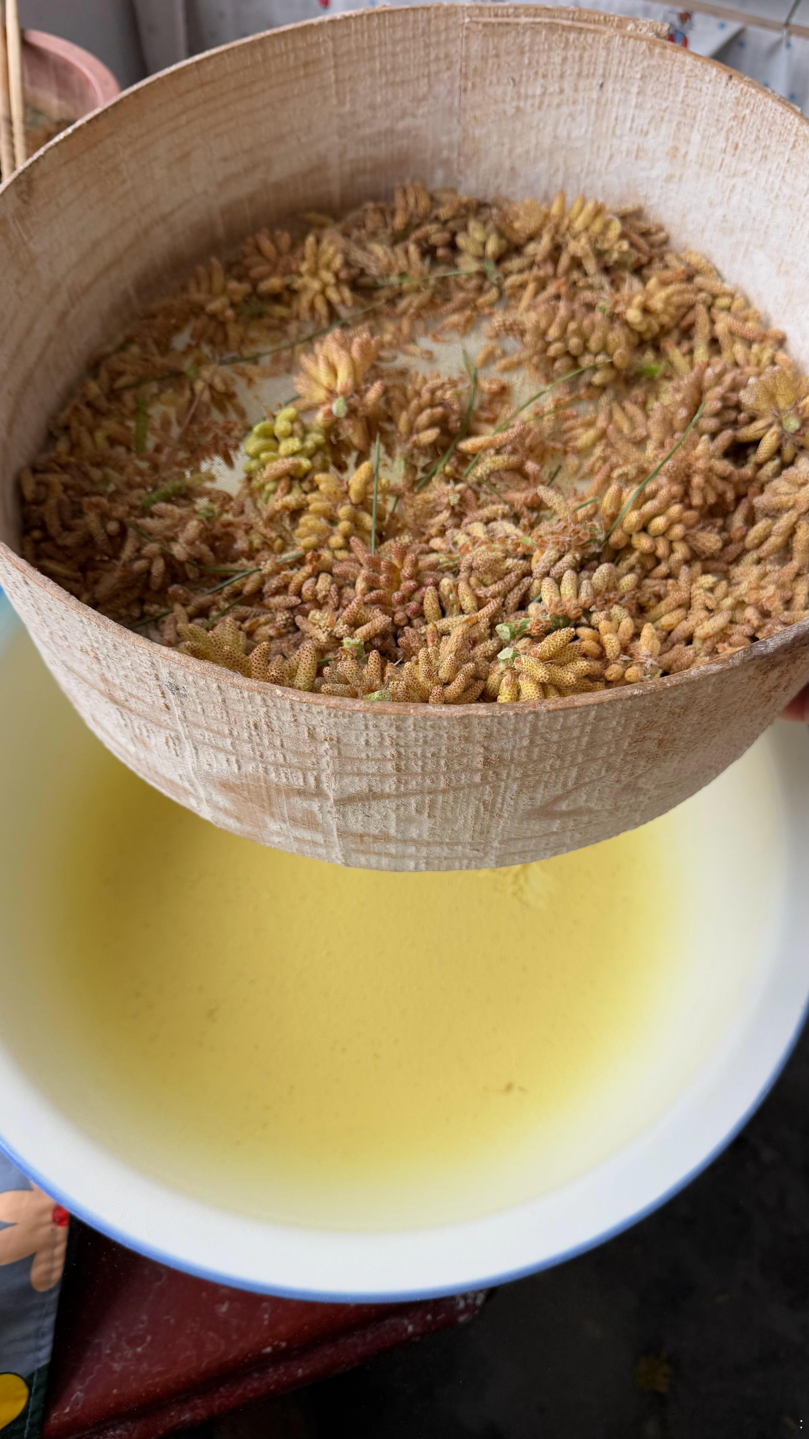队友的超强执行力:中午我发给他松花糕视频,随口一说我没吃过,不知道好不好吃。午饭后他就上山了,俩小时后下山、采粉、过筛,中间洗了个车,然后做豆沙底、冲粉、进模具。现在我已经吃上了结论是好吃但是太费事了,还好我只是在家躺着就能吃到……