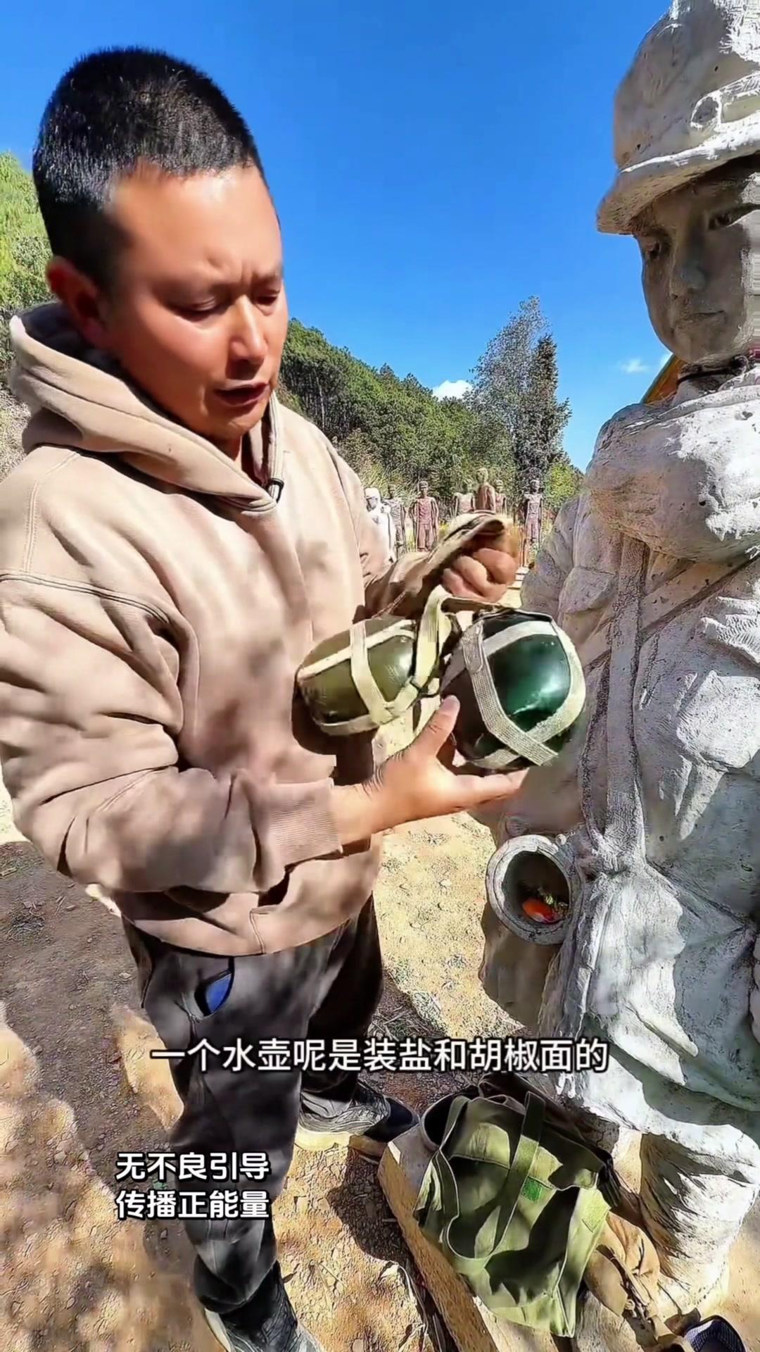 为什么有两个水壶?一个装水,一个装盐和胡椒面。潮湿天气里,干粮容易霉变,必须拌了调料才能下咽。这些9-15岁的孩子,穿着大人的衣服,营养不良却要扛起责任,绑腿裹住小腿,斗笠遮风挡雨。