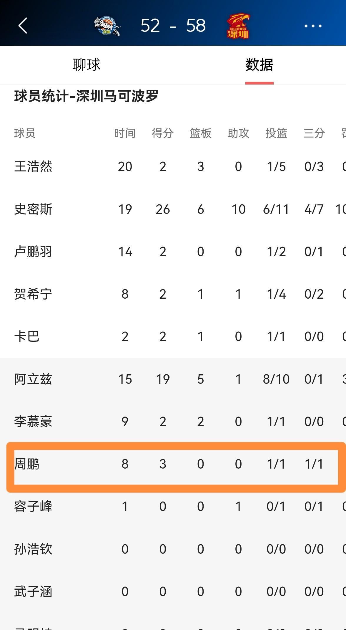 周鹏今晚只在场上停留了8分钟,这个时间在整场比赛里不过是短暂的片段,但就是这不到一节的出场时间,他用一次精准的三分出手完成了得分,1投1中的效率让他轻松收获3分,同时还抢下1个篮板,用实际行动为球队的半场领先贡献了自己的力量。