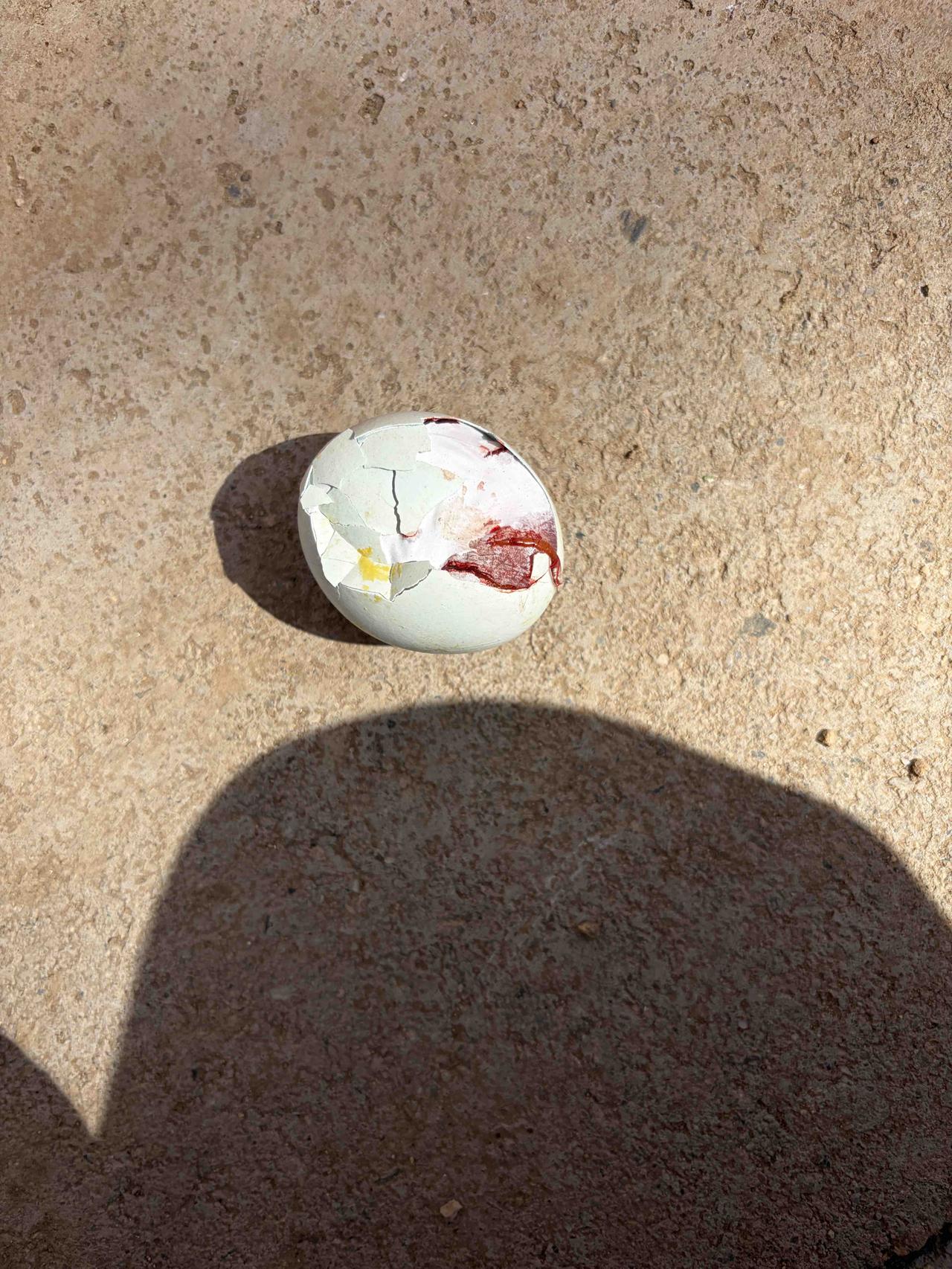 早踩烂的两枚,有点臭了,我把烂鸡蛋捡出来。投放的24枚种蛋,还剩21枚了。
