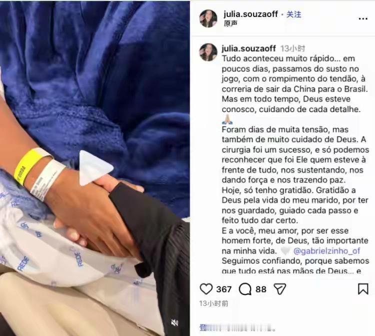 加布里埃尔手术成功!申花球迷送祝福!期待加布里埃尔能够赶上下一回合上海德比!这是来自加布里埃尔家人的消息!手术非常成功!现在就开始康复了!期待能够尽快回到赛场!加布里埃尔是和申花比赛中受伤的!而且抢的非常严重!所以还是有些遗憾的!