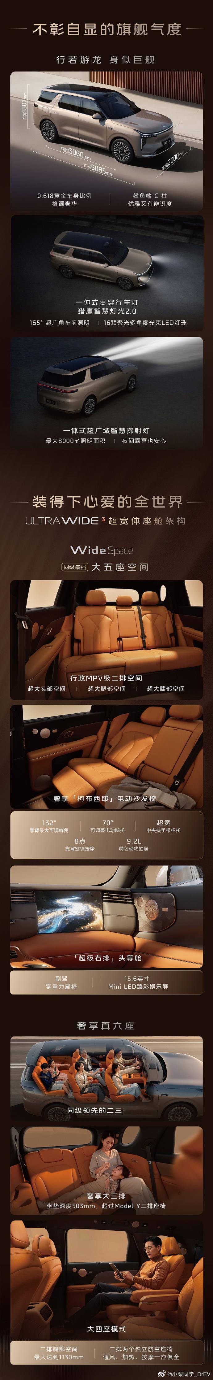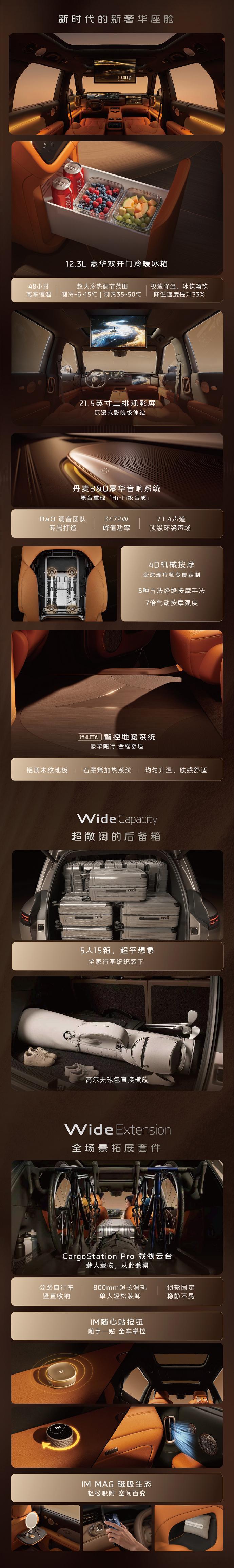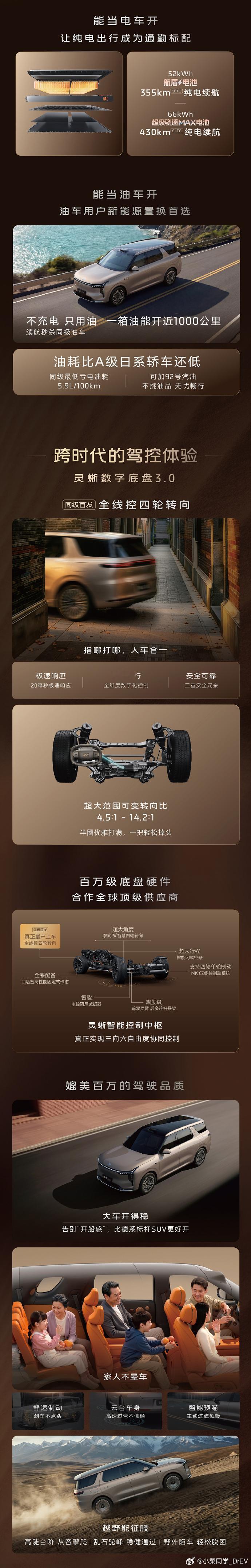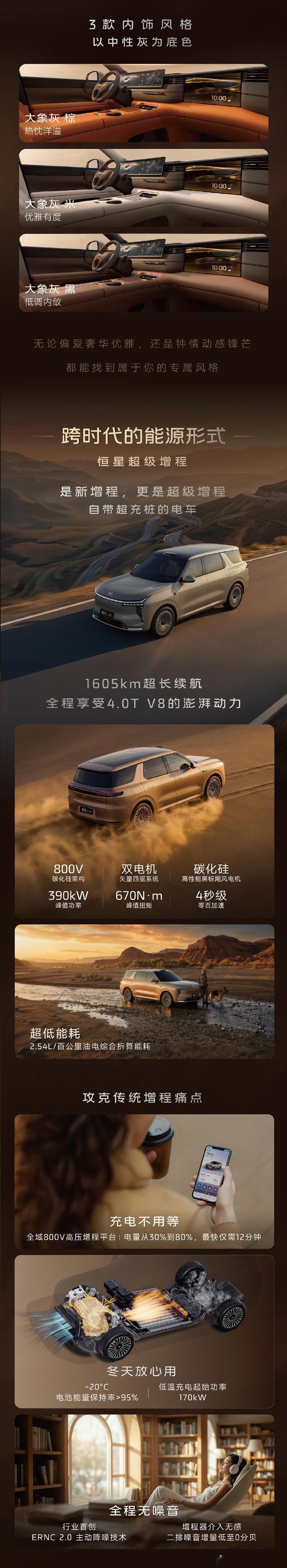 智己LS8上市24.98万起,标配空气悬架+四轮转向指导价26.18-31.18万;上市权益价24.98-29.98万。增程 中大型SUV车长5085,轴距为3060800V超快充平台52度/66度增程大电池CLTC纯电续航355km/430km综合续航1573km/1605kmUltra版零百加速4.7秒智已LS8今日正式上市智己LS8震撼上市24.98万起
