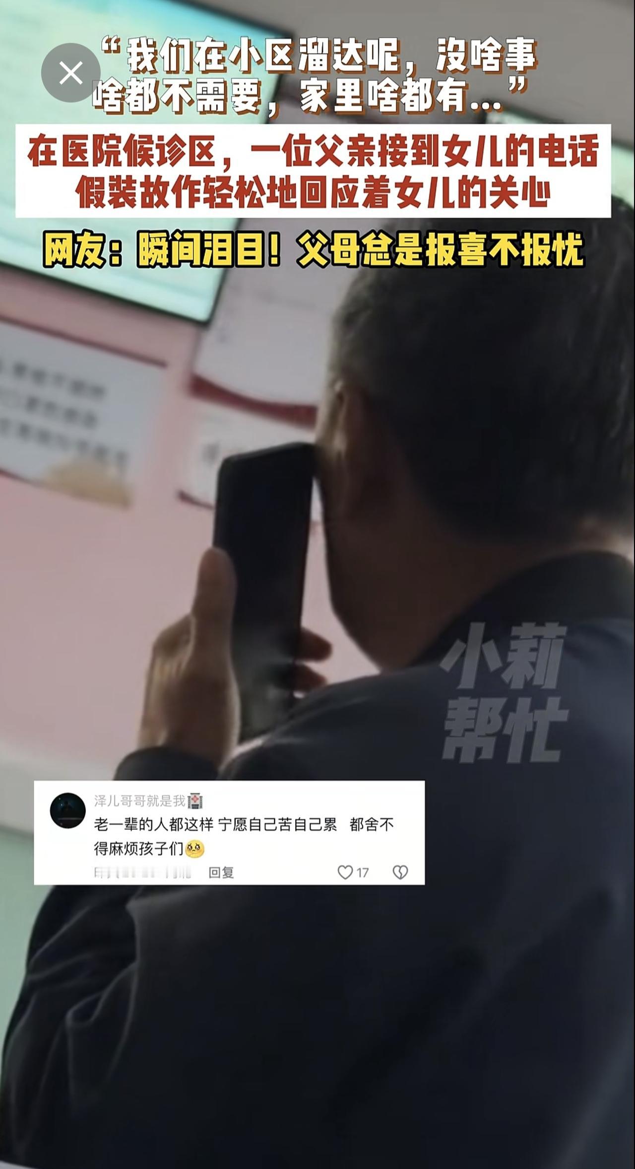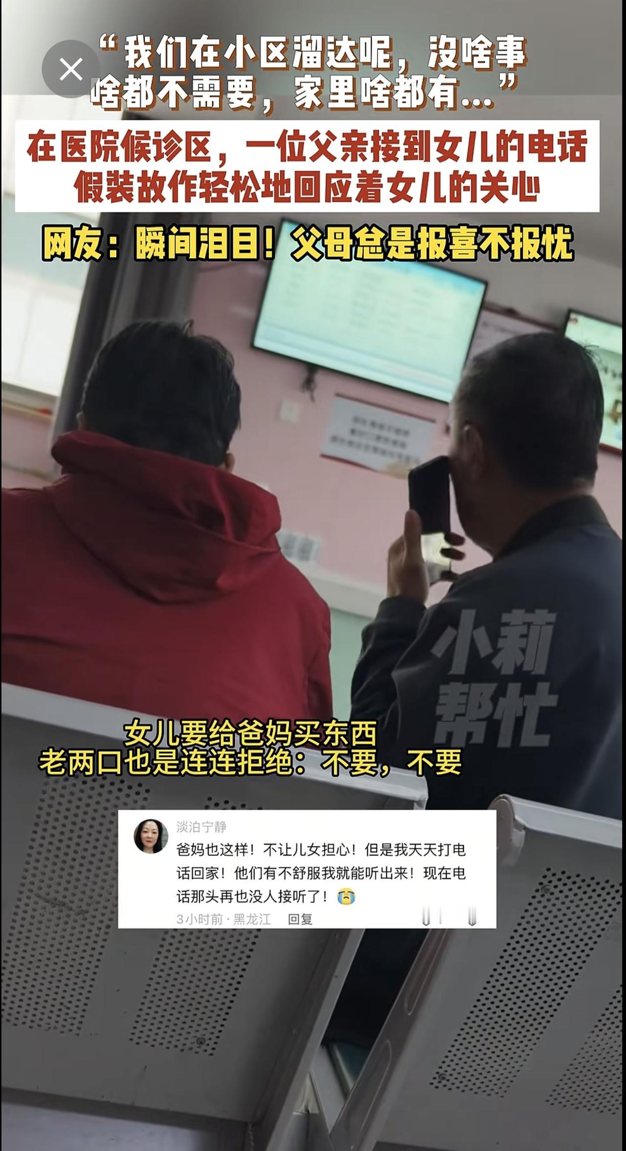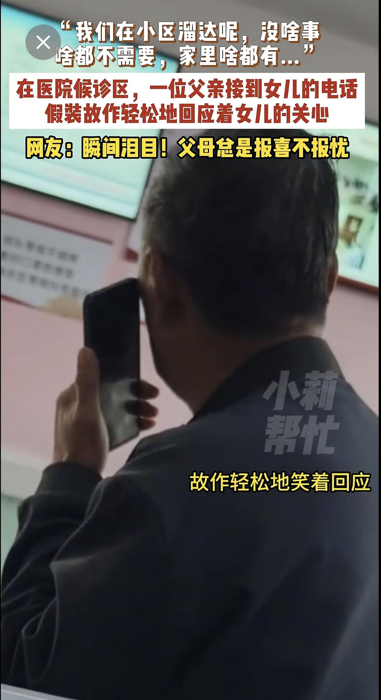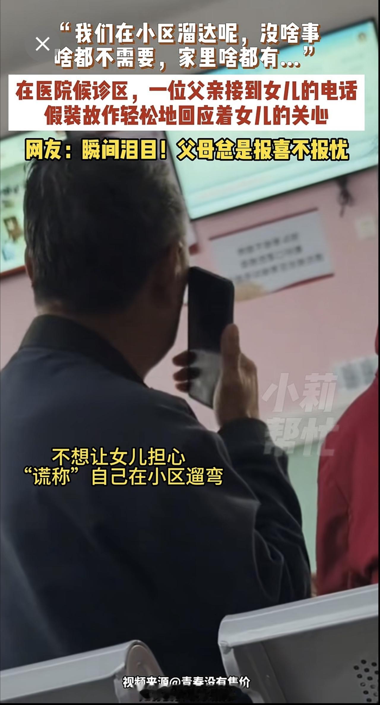 4月15日,河南洛阳,“我们在小区溜达呢,没啥事,啥都不需要,家里啥都有...”在医院候诊区,一位父亲接到女儿的电话,假装故作轻松地回应着女儿的关心,网友:瞬间泪目!父母总是报喜不报忧。