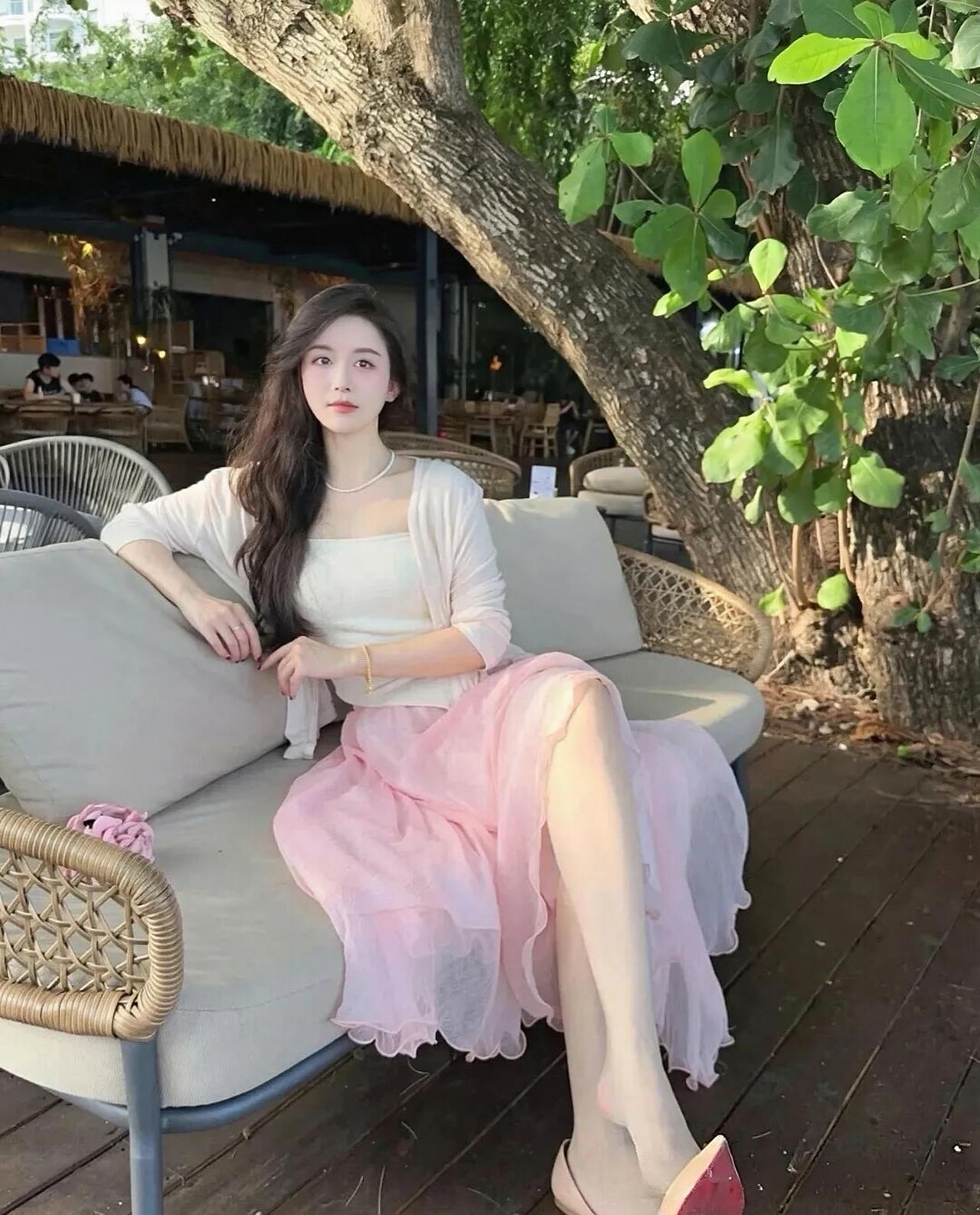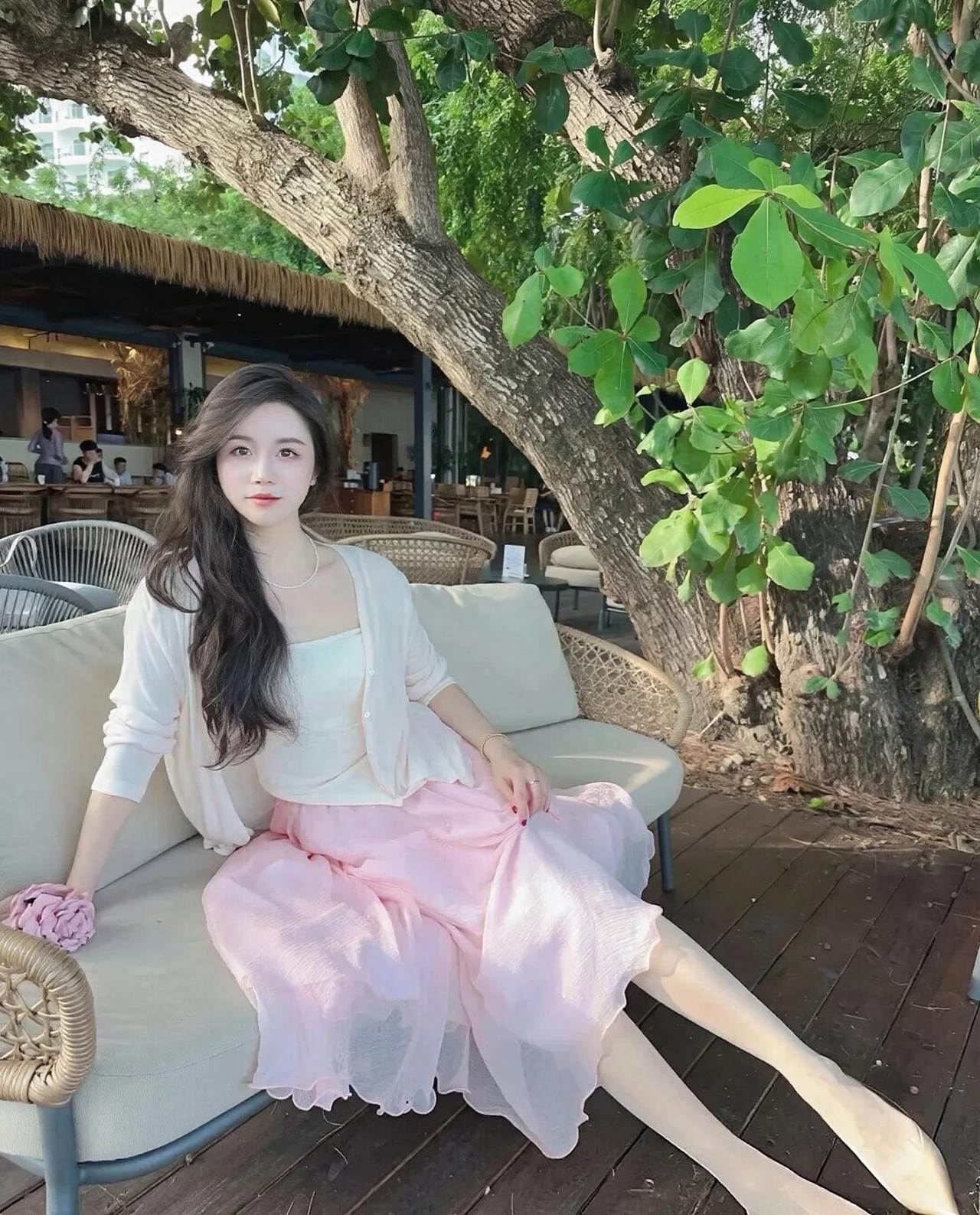 大树绿植+木质露台的户外度假场景,自然光柔和通透,慵懒松弛的坐姿把春日温柔氛围感拉满,清甜韩系女神气质拉满,温柔又灵动。