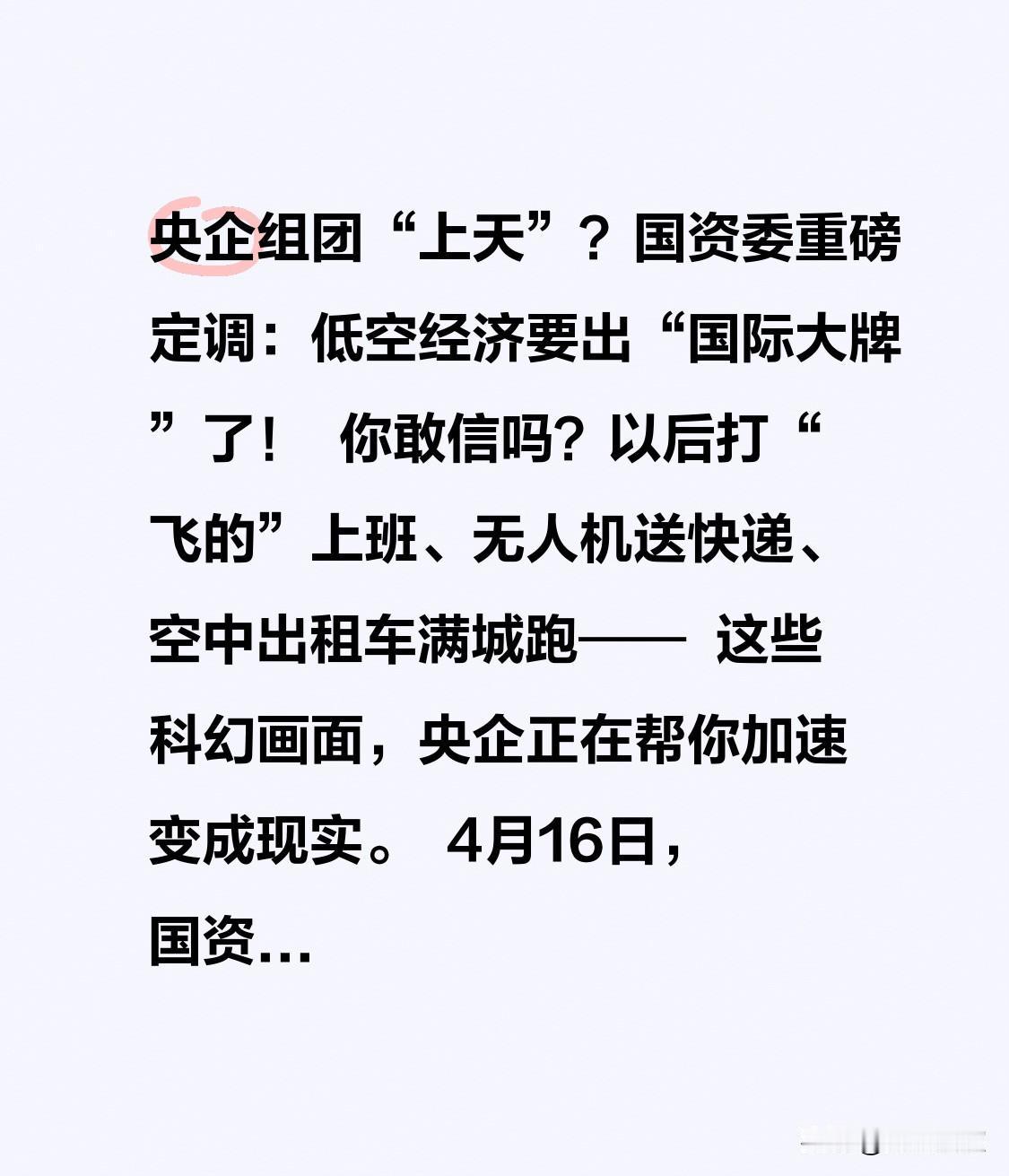 4月16日,国资委专门开了场“低空经济”专题会,给各大央企划了重点: