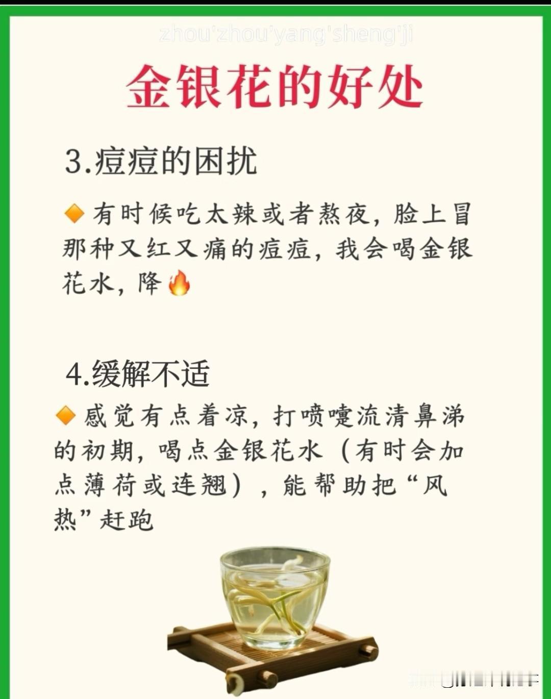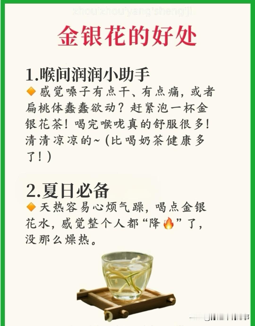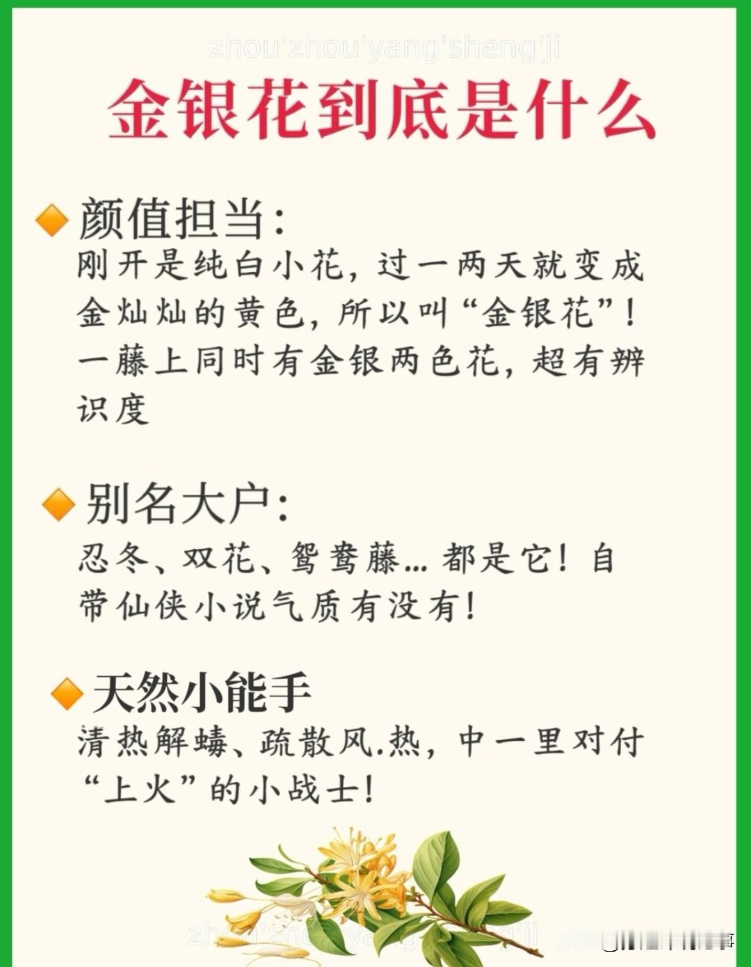 咽喉肿痛?金银花一上,红肿热痛很快就消。皮肤长疖子、长痘?金银花既能内服,还能外敷,直接消肿散痈。风热感冒、温病发热?