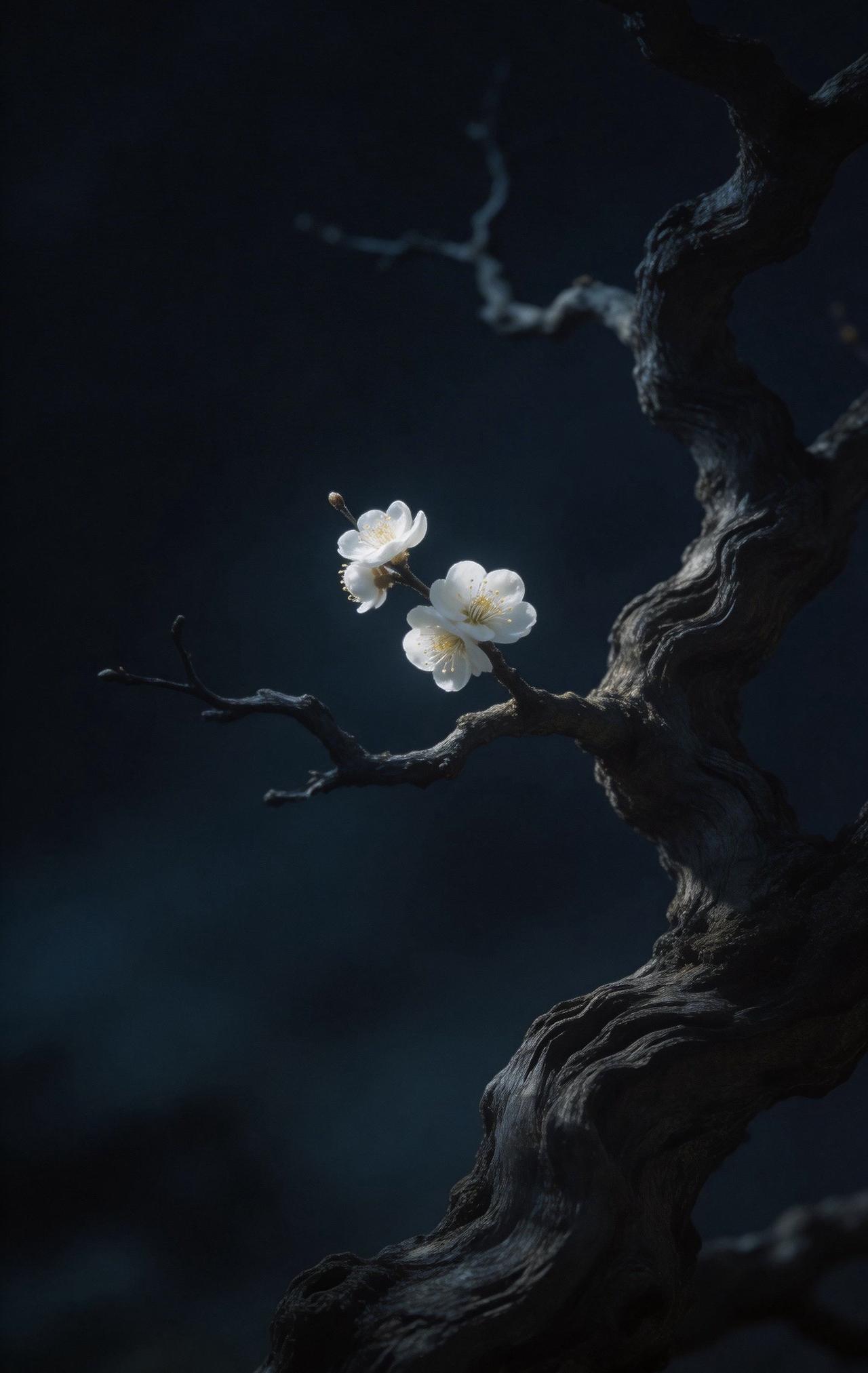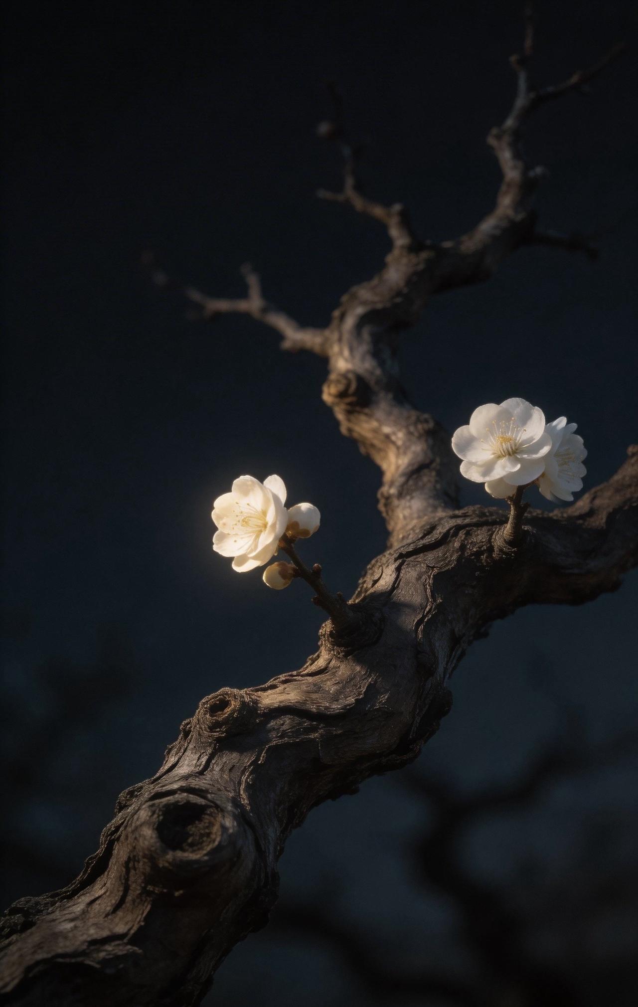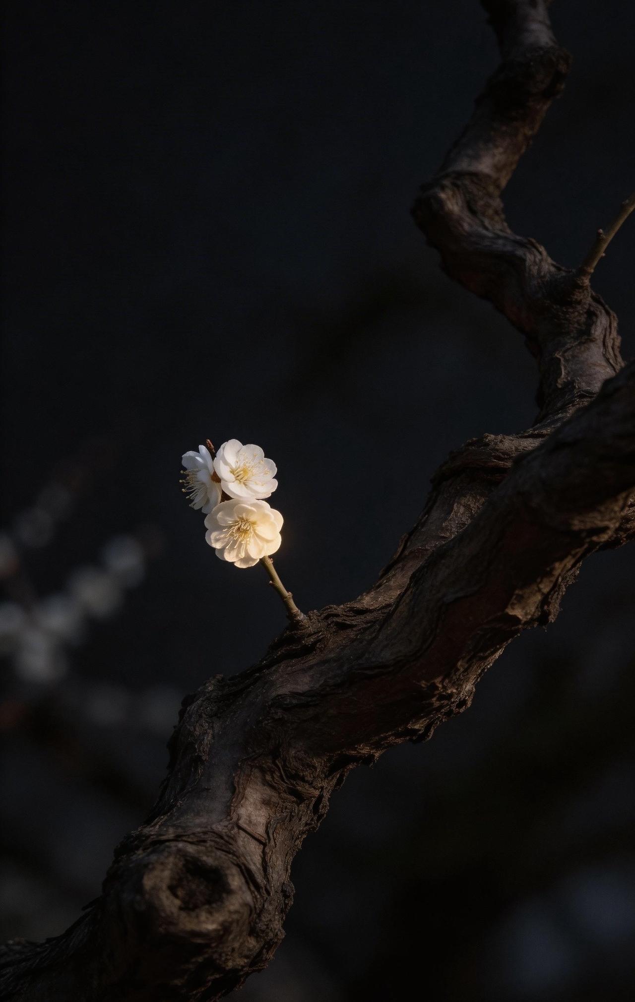 老树枝干扭曲苍劲,如虬髯般纵横交错,带着岁月的沧桑。枝头孤零零开着两三朵梅花,不艳不闹,却在微弱光影里静静舒展。花瓣清瘦,暗香淡淡,一点微光落在上面,反倒衬得它清冷又坚韧。