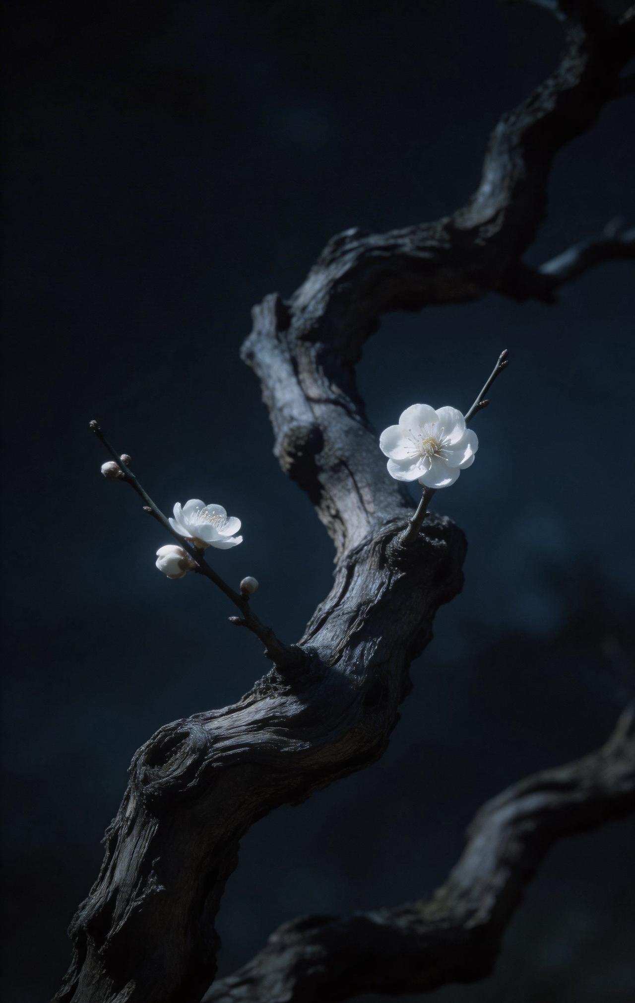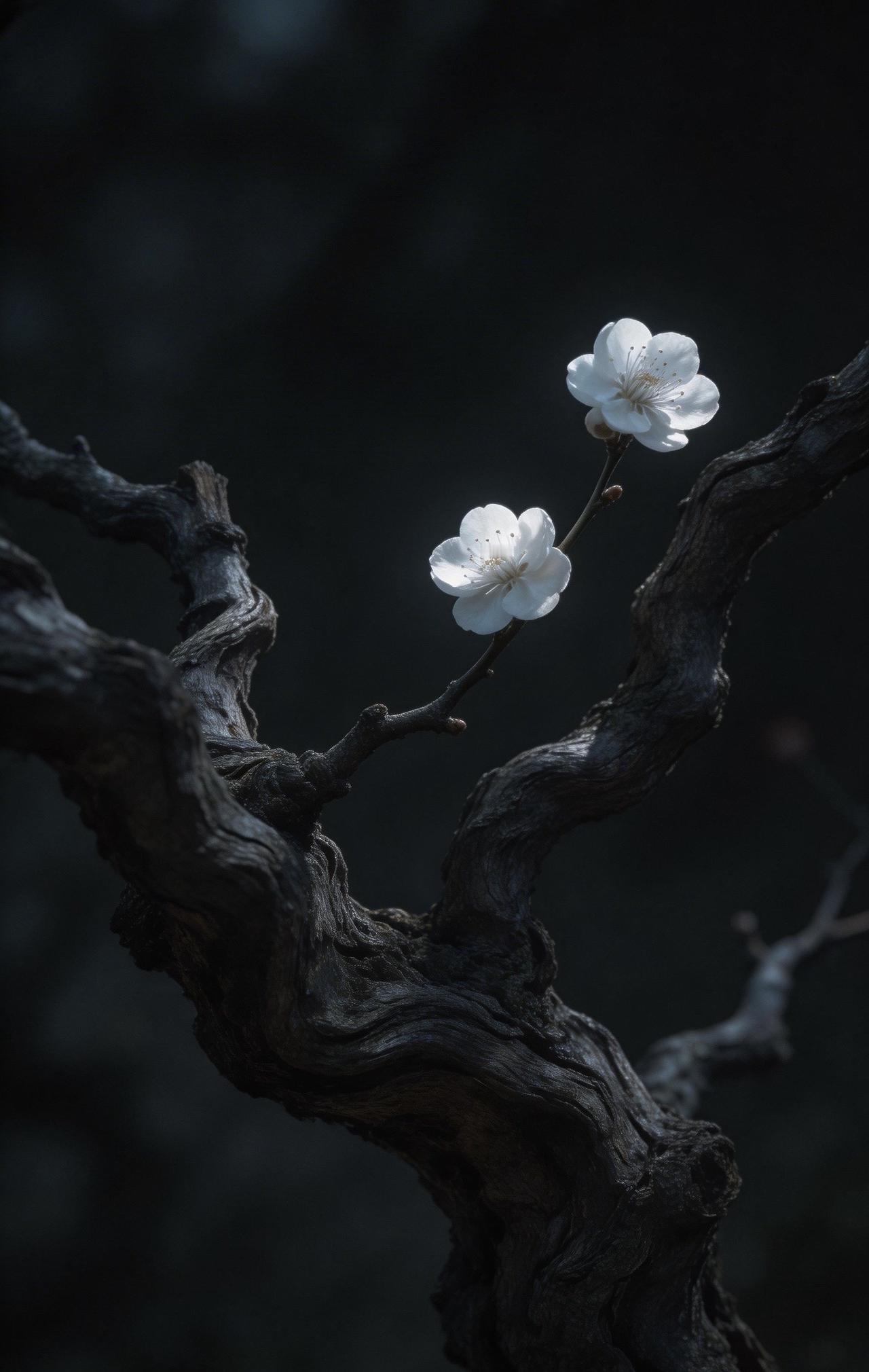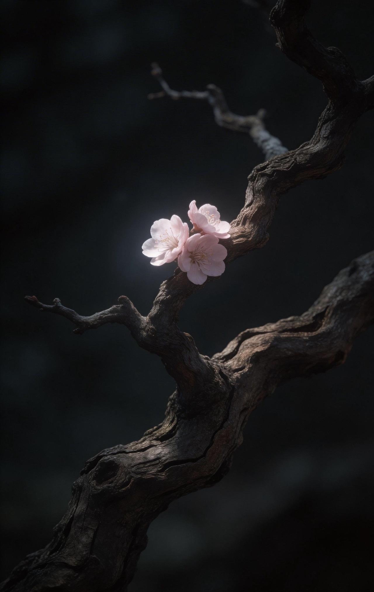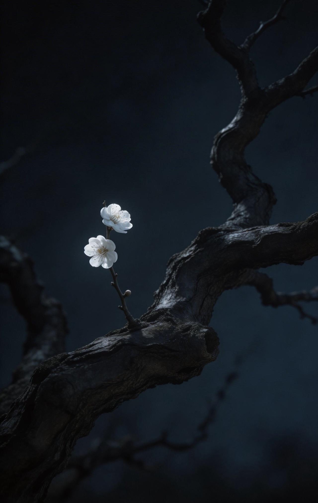 老树枝干扭曲苍劲,如虬髯般纵横交错,带着岁月的沧桑。枝头孤零零开着两三朵梅花,不艳不闹,却在微弱光影里静静舒展。花瓣清瘦,暗香淡淡,一点微光落在上面,反倒衬得它清冷又坚韧。