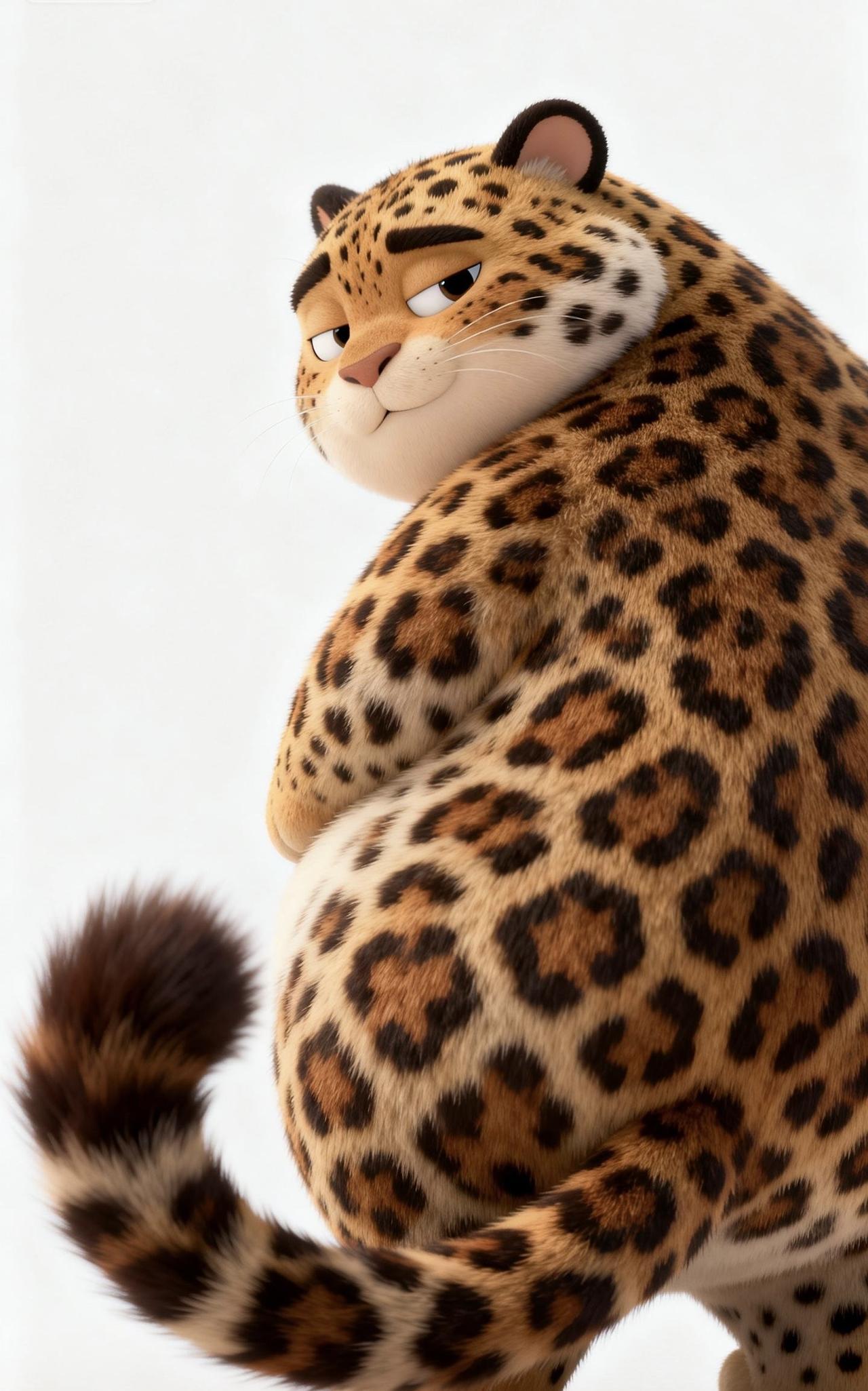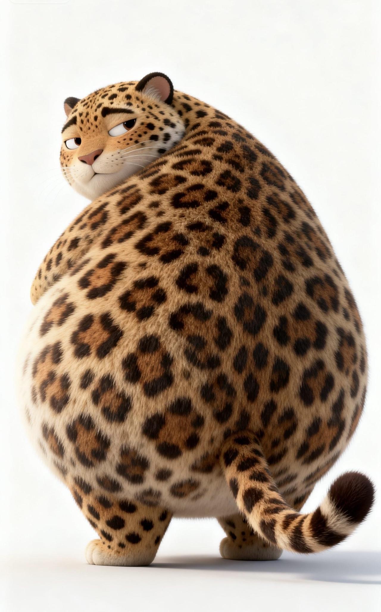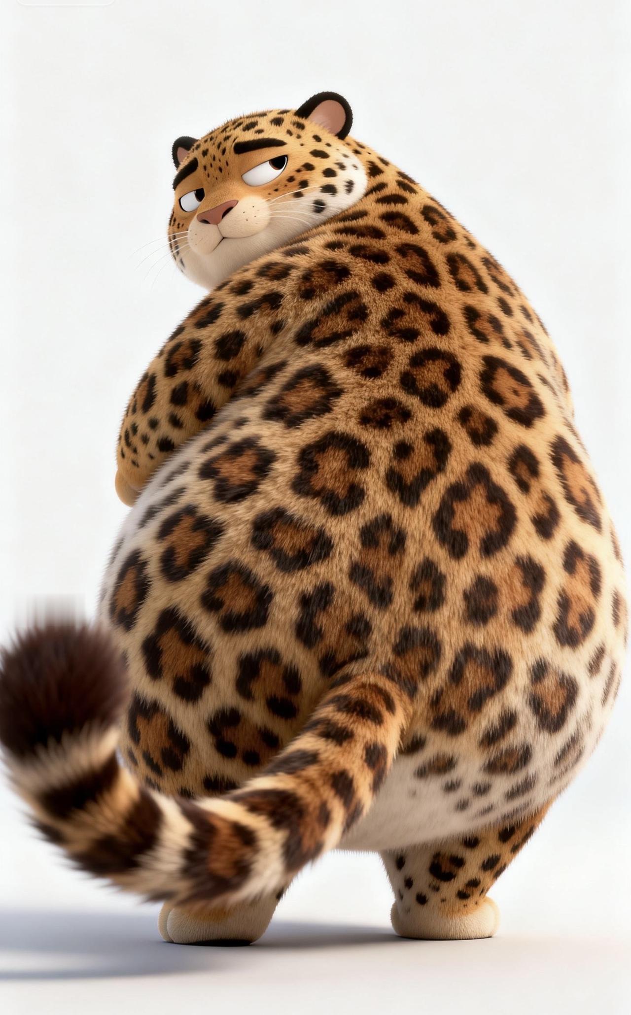📝纯白干净背景里,3D渲染出一只Q萌胖嘟嘟的花豹,只拍硕大圆润的背部。