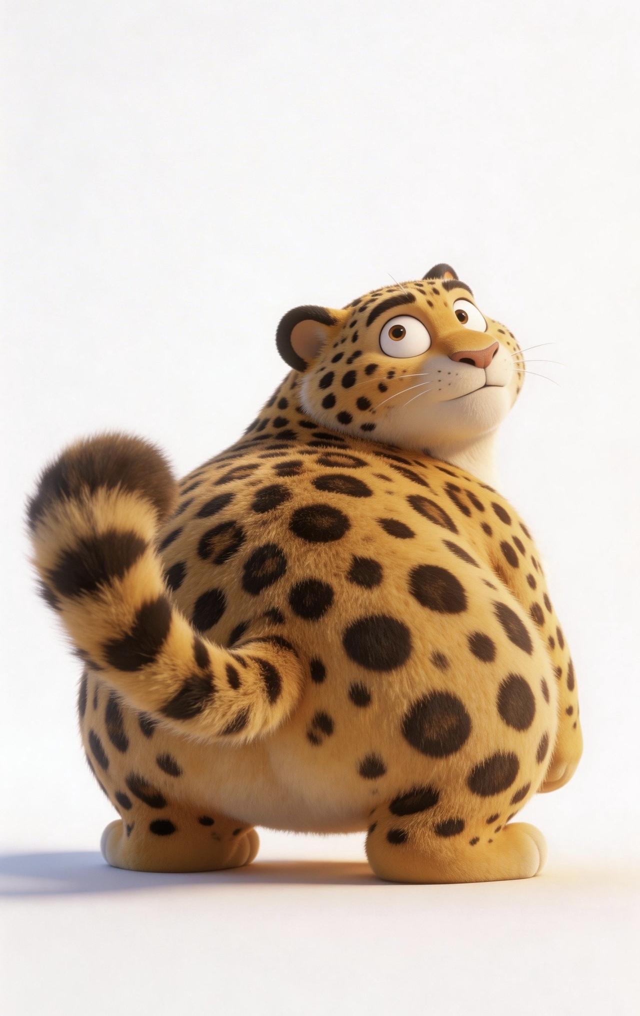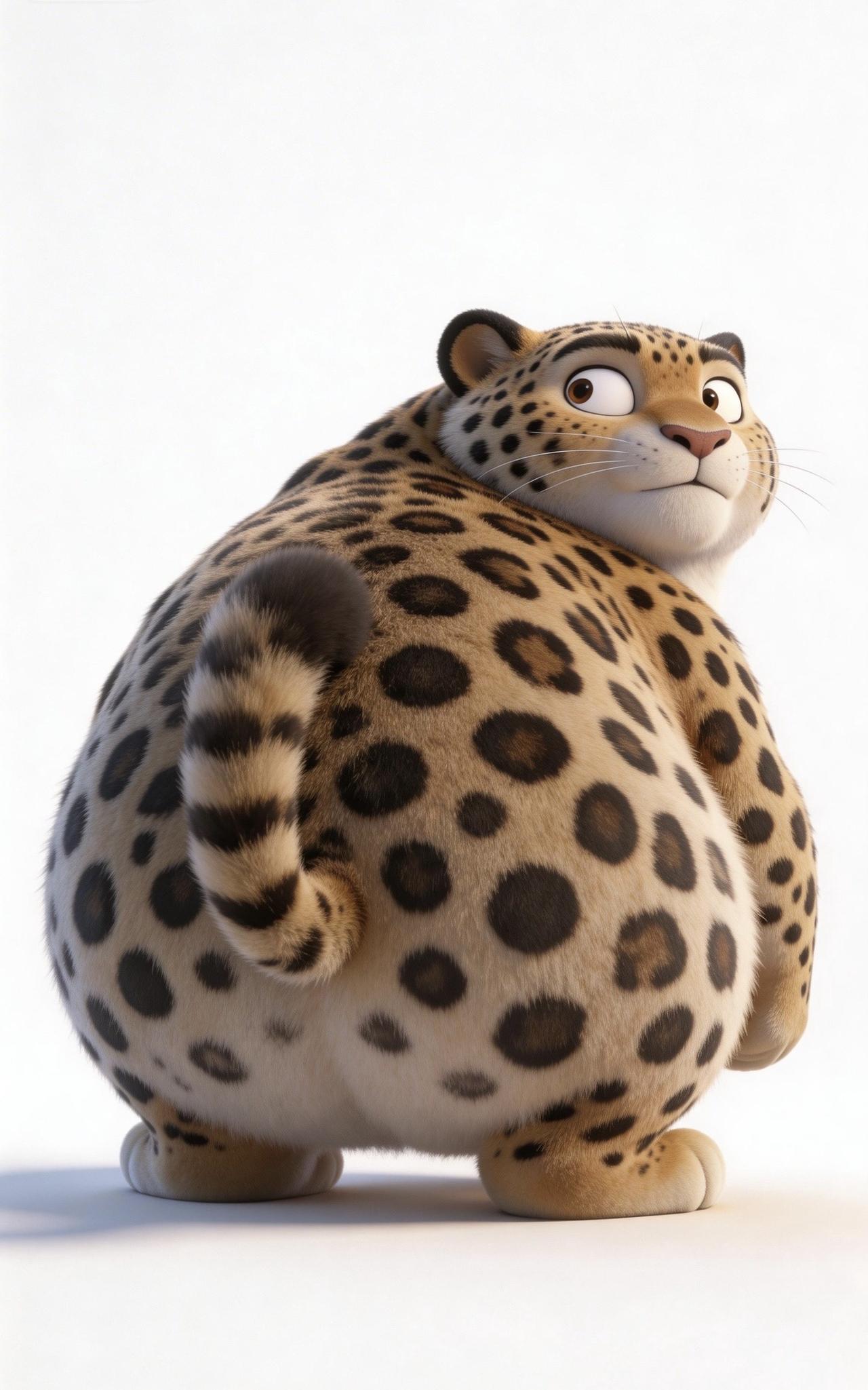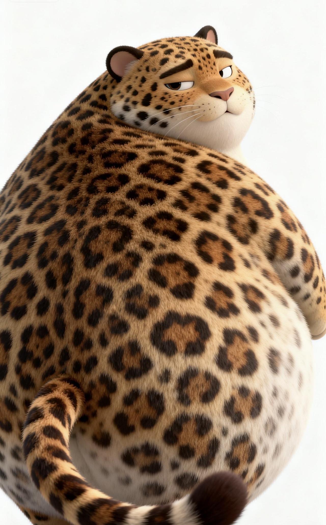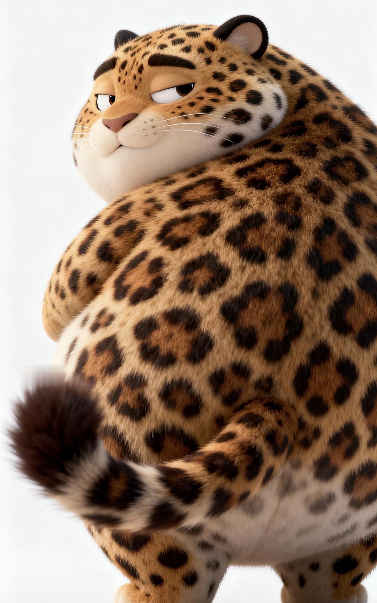 📝纯白干净背景里,3D渲染出一只Q萌胖嘟嘟的花豹,只拍硕大圆润的背部。