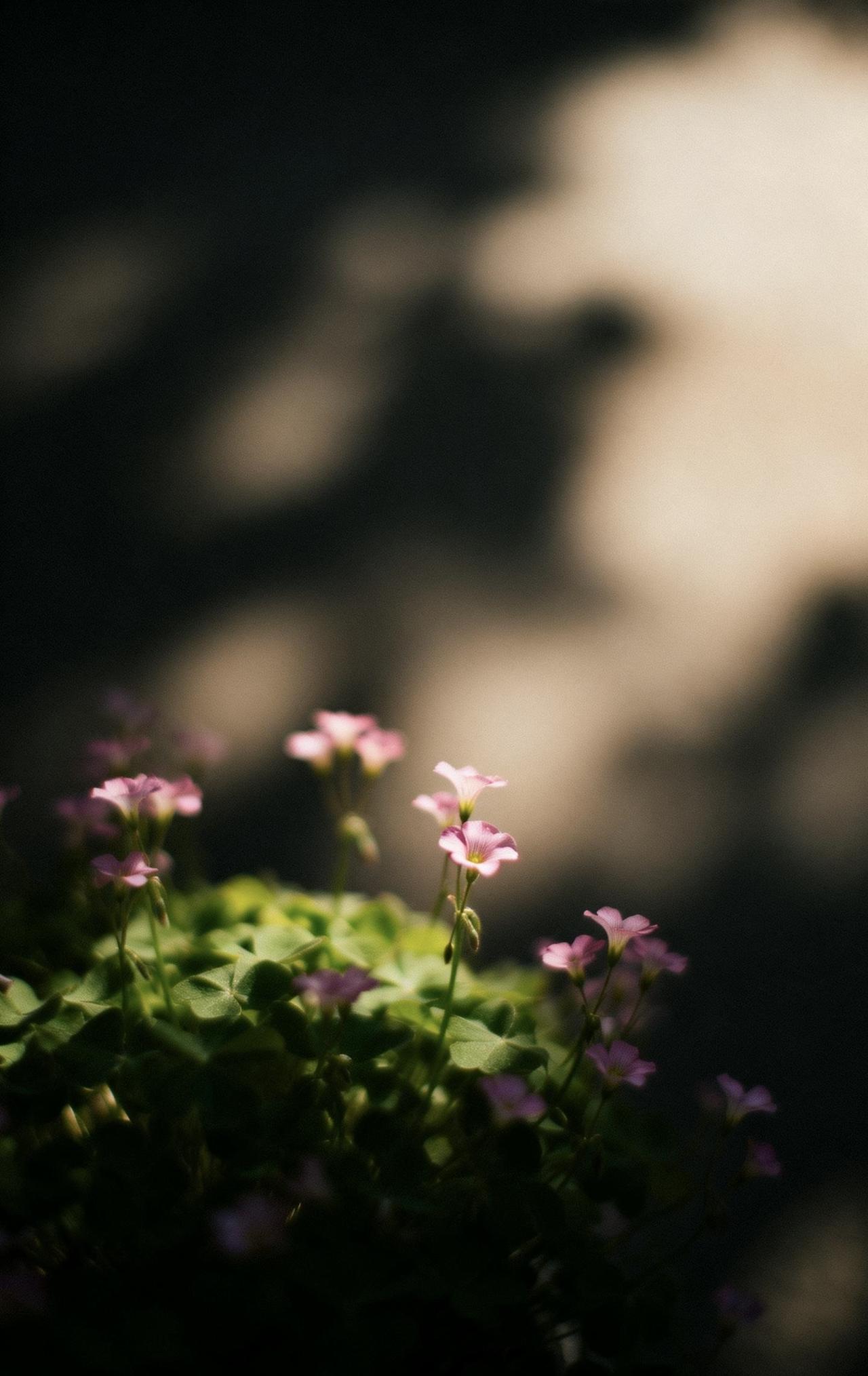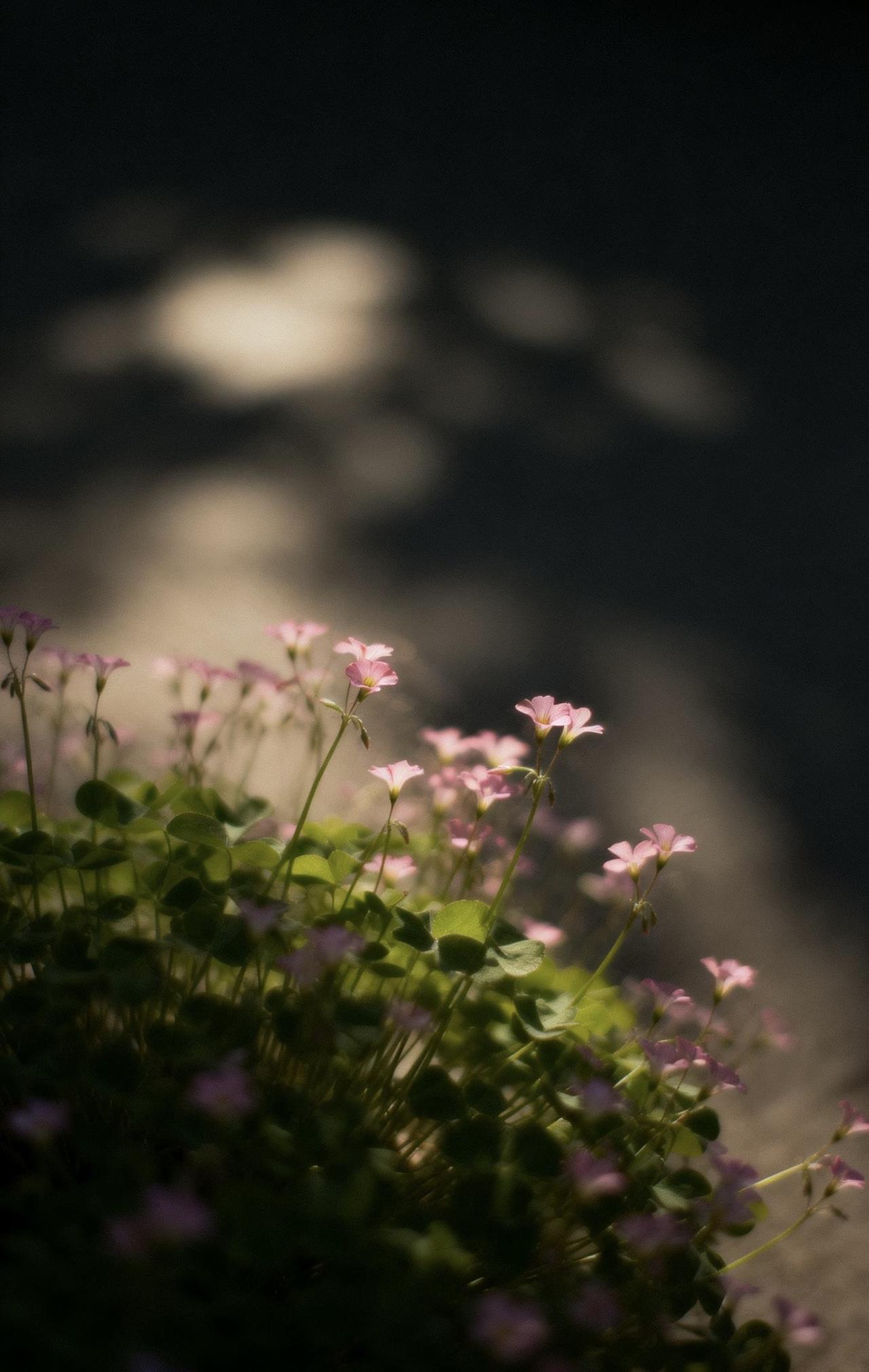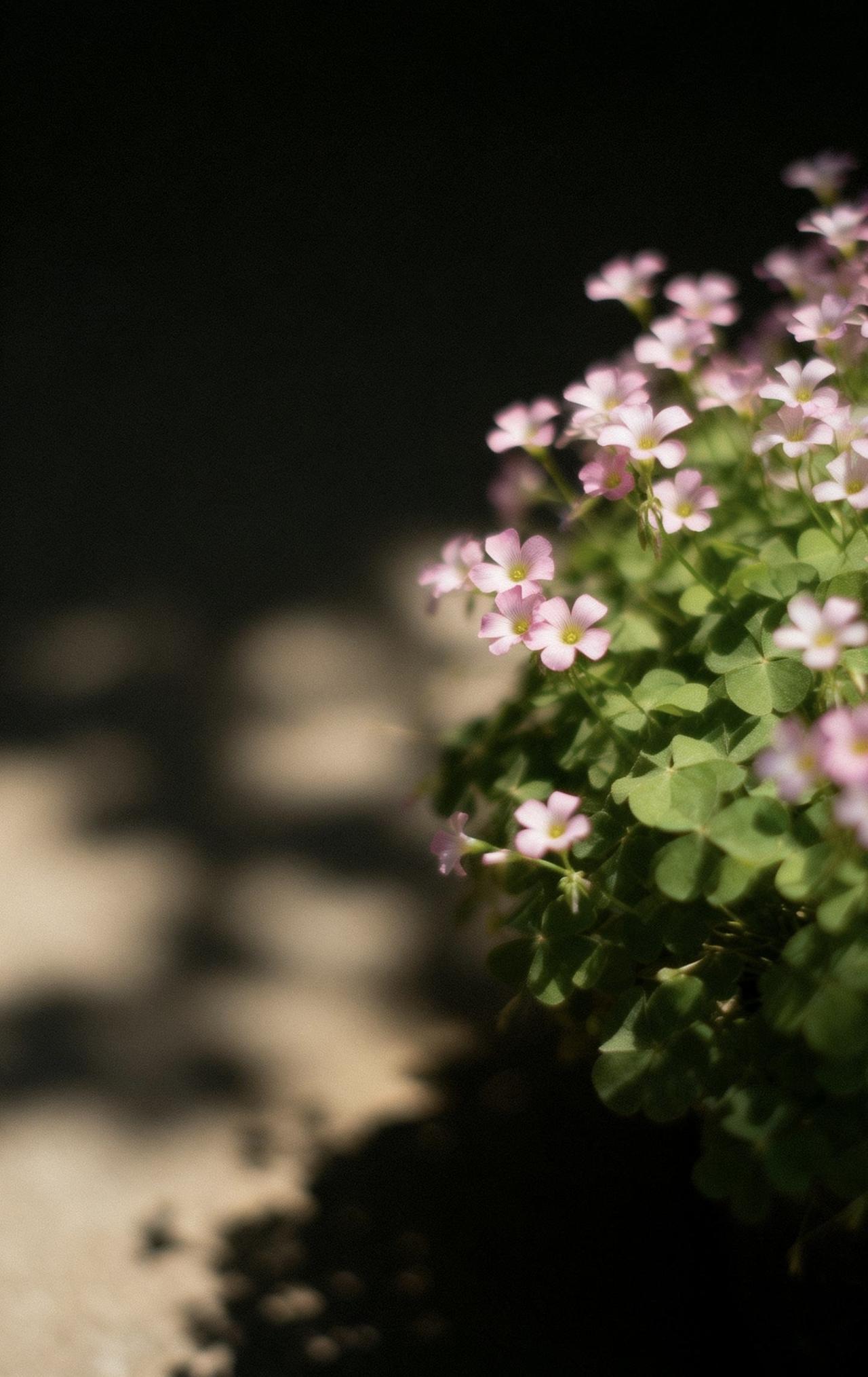 📝画面以大留白极简构图,中远景里一蓬酢浆草舒展飘逸,细小花朵清新温柔,叶片自然灵动。采用伦勃朗光搭配暗色朦光,高反差强暖光交织出斑驳弥散的迷离光影,氛围感朦胧诗意。