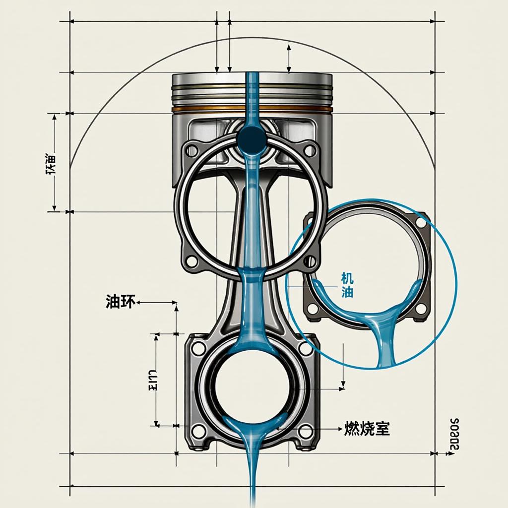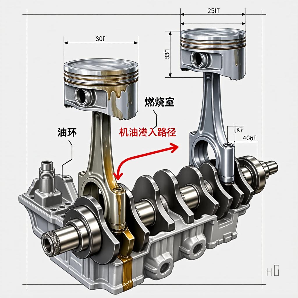 -活塞环与气缸壁间隙:正常情况下,油环负责刮除气缸壁上的多余机油。若活塞环磨损或断裂(常见于高里程或冷启动频繁的发动机),窜气(含燃油蒸汽的废气)会携带机油进入燃烧室燃烧。