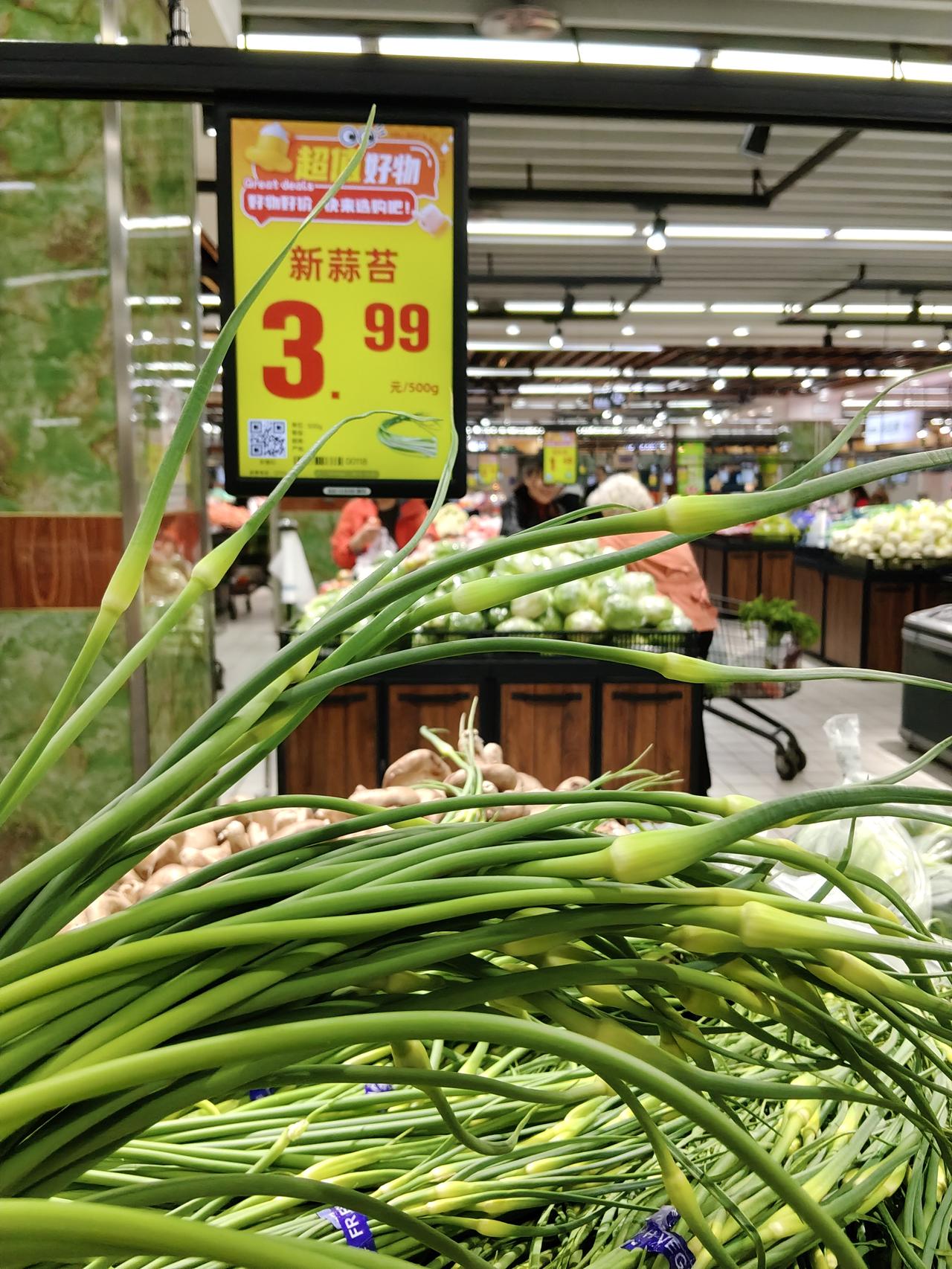 在超市里看见,新蒜苔已下来,挺新鲜的。蒜苔是两种,一种标着"新蒜苔",另一种标着"红头苗"。我拿起对比一下,红头苗是上面多了一抹儿红,而且长度短一些,价格每斤便宜一块。一位大姐挑了一把红头苗的蒜苔,跟我说红头苗是紫皮蒜的蒜苔,炒着好吃。我对买菜做饭的知识有些不太了解,这超市里标着"红头苗"卖蒜苔倒是头回看见。[捂脸]