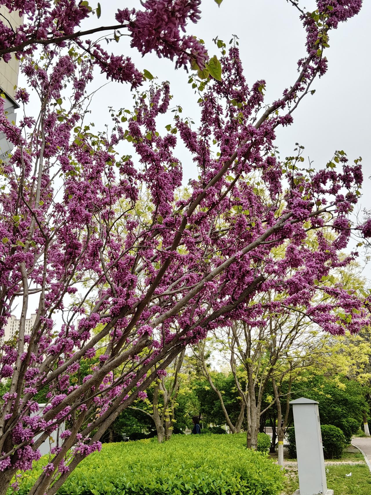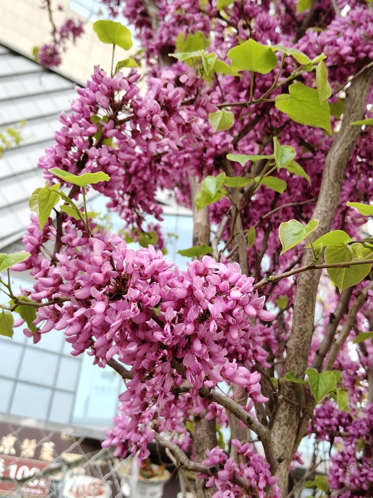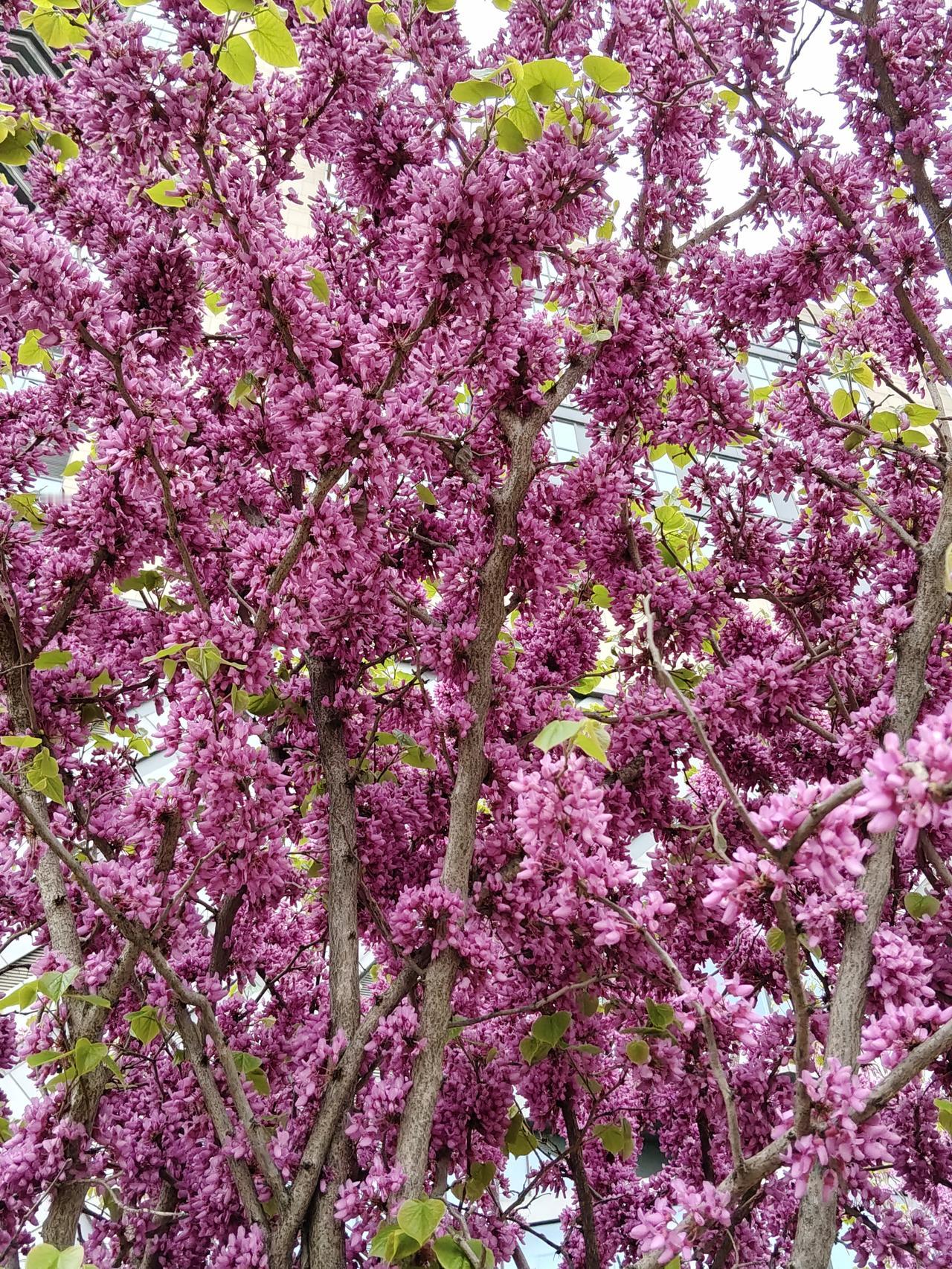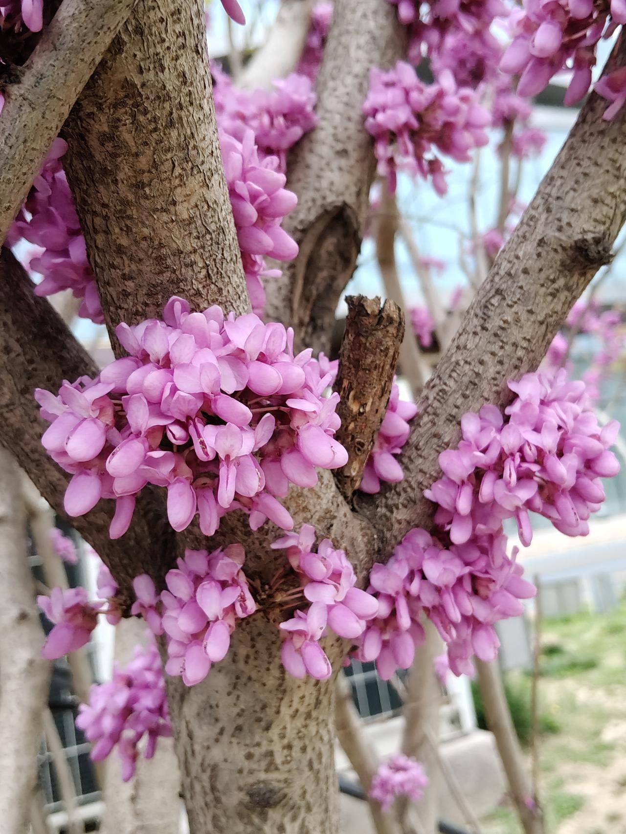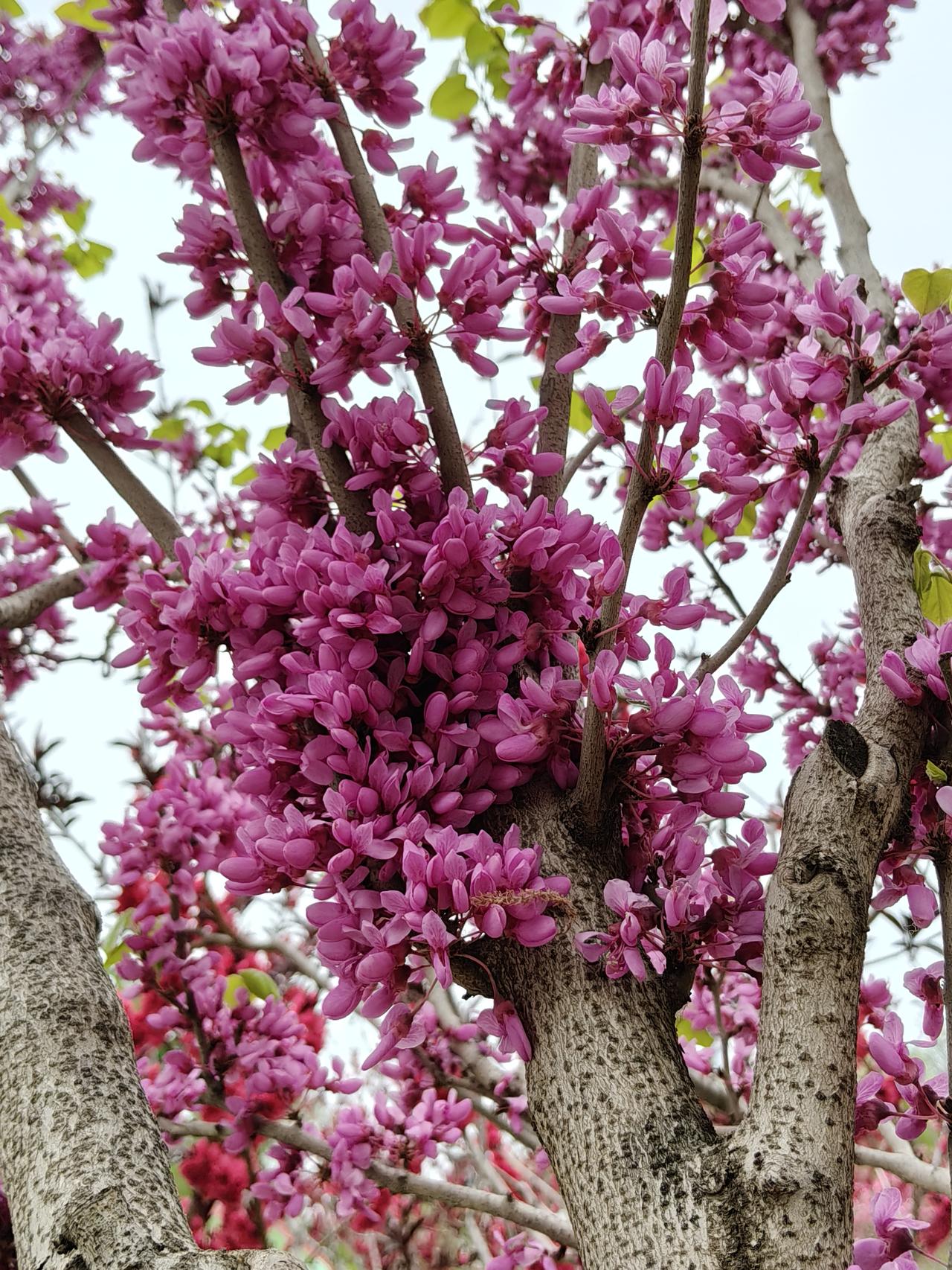 春天里百花次第绽放,姹紫嫣红热闹非凡。在这满城春色里,紫荆花却很少成林成片,通常在路上或公园里走着,偶然看见一两棵,是做为园艺的点缀。紫荆花不张扬不妩媚,不孤芳自赏,苍老的枝干上迸发出一串串、一簇簇紫色的小花朵,密密麻麻紧凑在一起,仿佛把春天紫色的颜料都泼满了树枝。