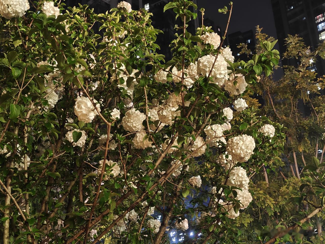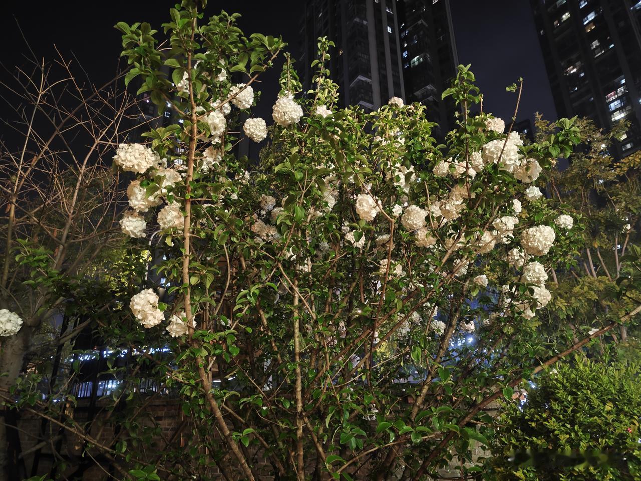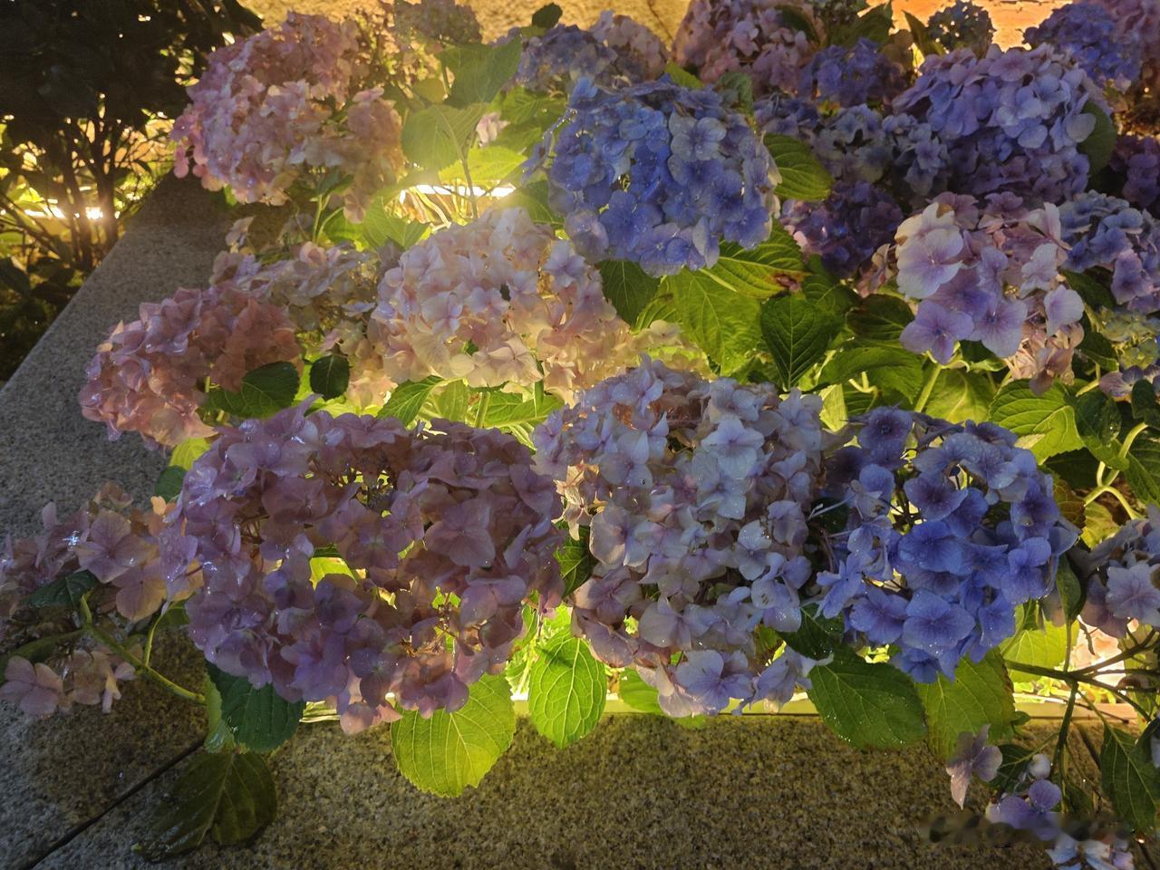 粉、蓝、紫渐变花团层层叠叠,哪怕是夜晚也能看出它的艳丽,雪白的木绣球在牌坊旁边,中式浪漫十足,花期正盛,别错过这份春日美好。