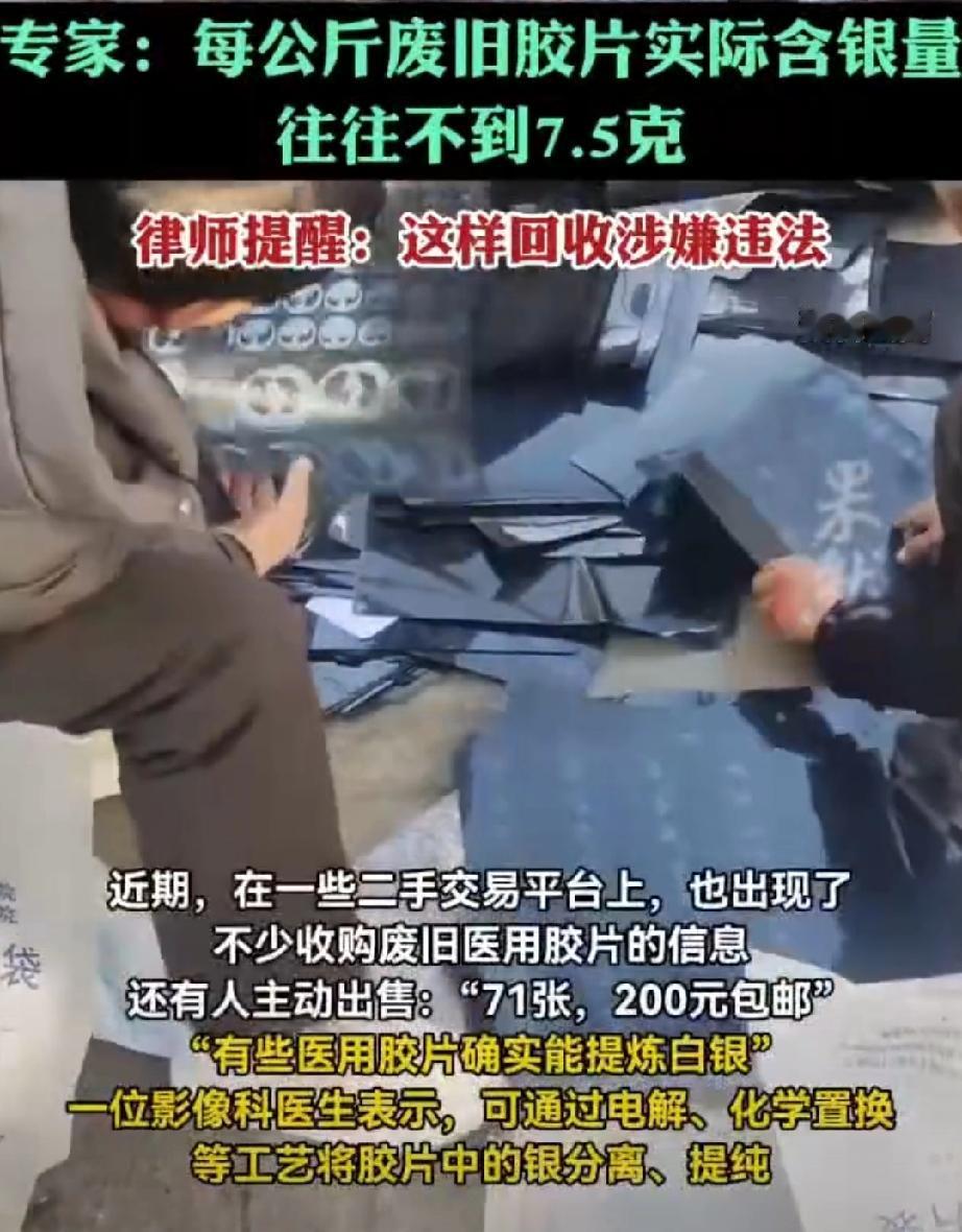 【律师称商贩回收废胶片炼银或违法 | 昨夜今晨大家都在看啥议啥】随着白银价格波动,含银废旧医用胶片身价倍增。不少小区周边出现了,专门回收旧胶片的商贩。据了解,医用胶片提炼过程不仅会使用强酸、强碱等化学药水,还会产生有毒废液、废气,处置不当不仅会严重污染水体和土壤,而且会造成人体中毒、致癌等损害。律师表示,街头商贩未取得经营许可证,以营利为目的,面向社会不特定公众收购、集中贮存并转卖废旧医用胶片的行为,虽然不涉及加工提炼,但仍属于典型的非法收集、贮存危险废物的行政违法行为,情节严重的,如造成环境污染,还可能构成刑法规定的污染环境罪。商贩回收医用胶片提炼白银