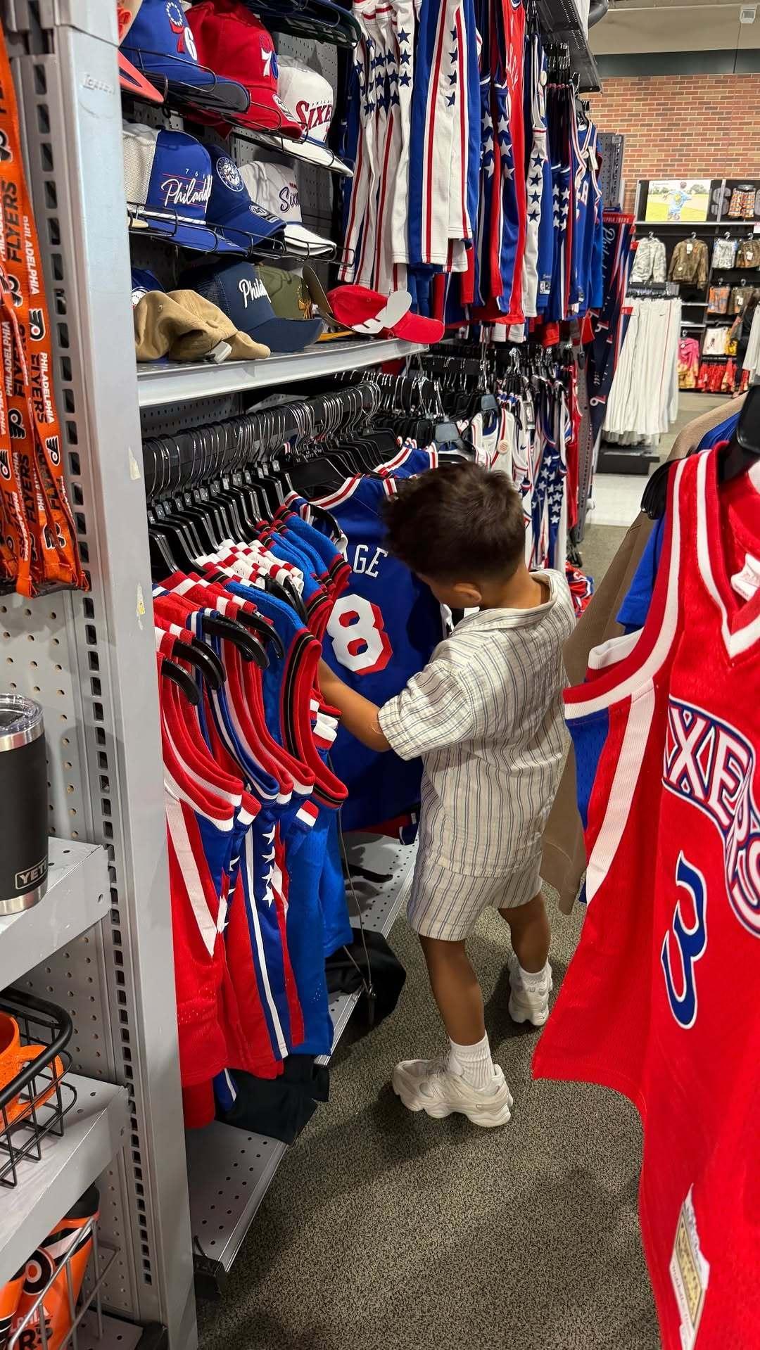 分享今日份帅气的小武克~去逛商场看到了老爸的球衣!费城76人NBA点赞成金Pau