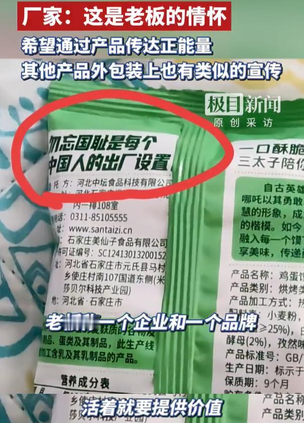 17日上午,记者联系河北中坛食品科技有限公司,工作人员表示,这款产品为孜然味的鸡蛋馍丁。外包装上写的“勿忘国耻是每个中国人的出厂设置”是老板的一种情怀,“我们老板说,一个企业和一个品牌活着就要提供价值,我们感恩这个时代,我们希望能通过产品传达一些正能量的主张。”该工作人员介绍,其公司生产的其他产品外包装上也有类似的宣传。(极目新闻)