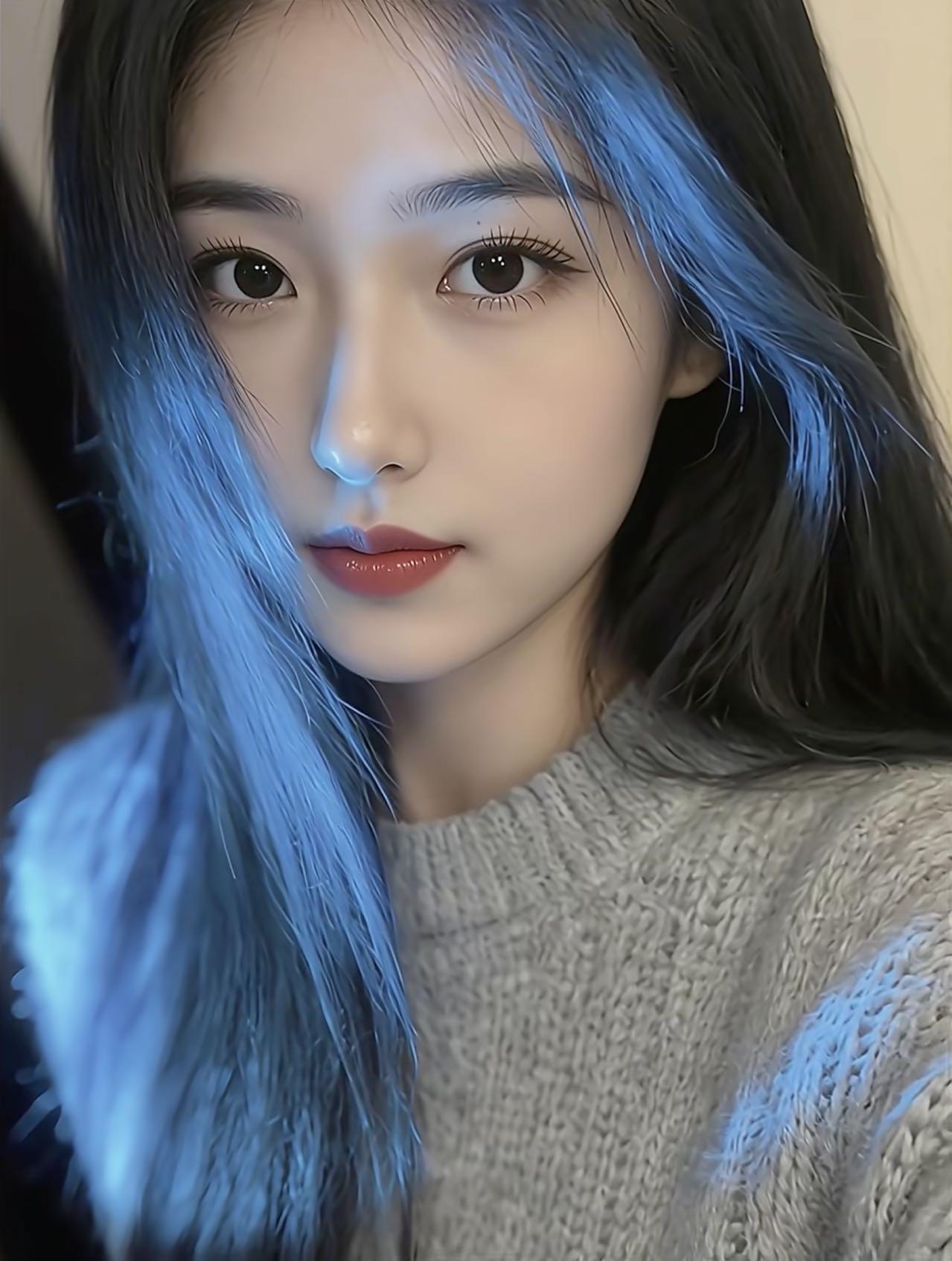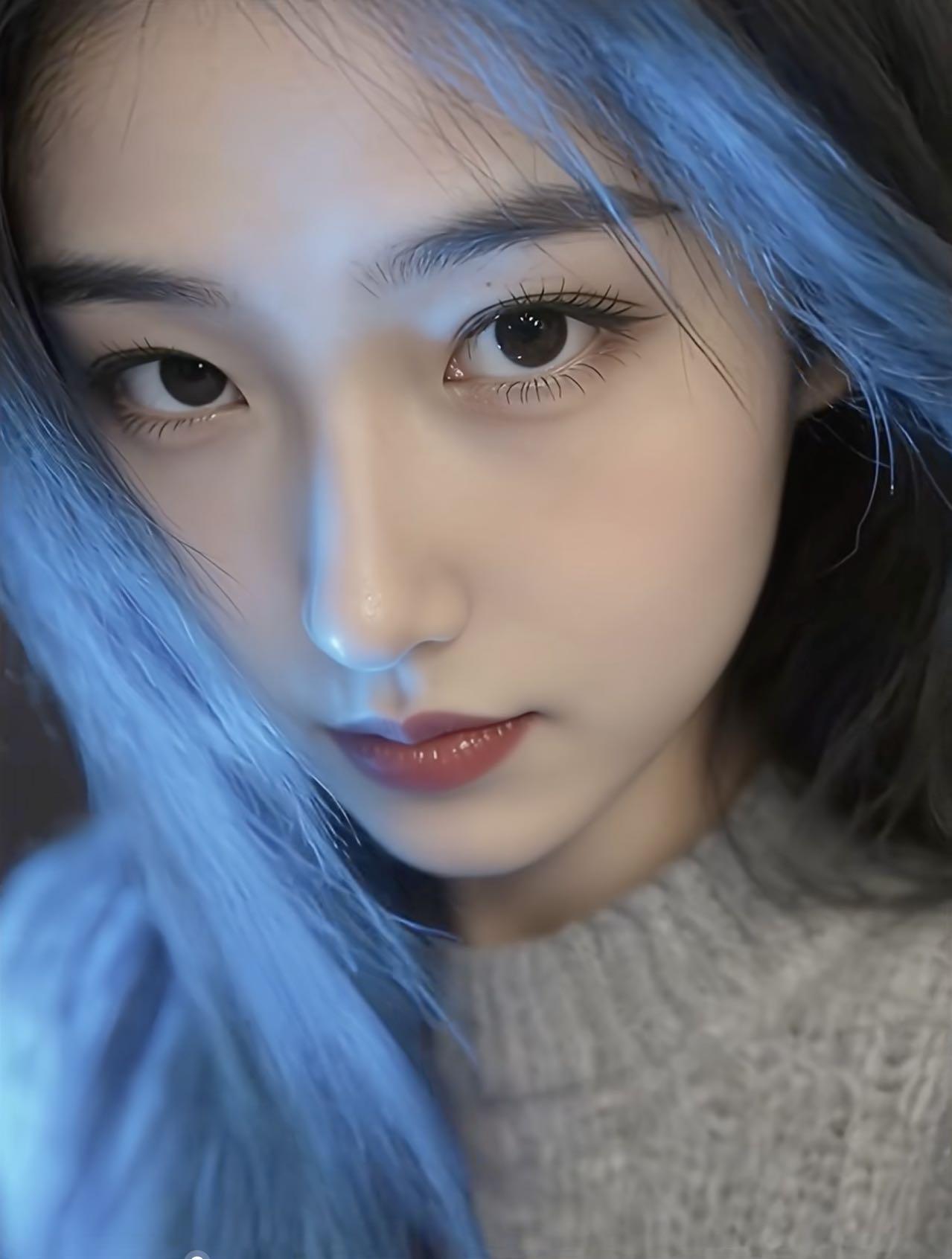 梦幻蓝发少女,温柔眼神,唯美自拍