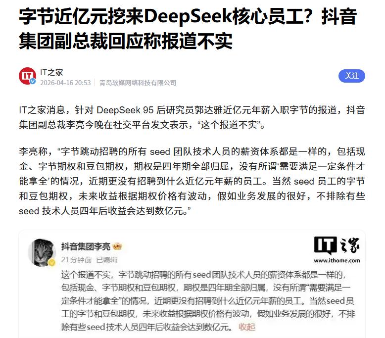 针对近期网上流传的“字节跳动开出近亿年薪,挖走DeepSeek核心员工”等消息,抖音集团副总裁李亮在个人主页上表示:“这个报道不实”。