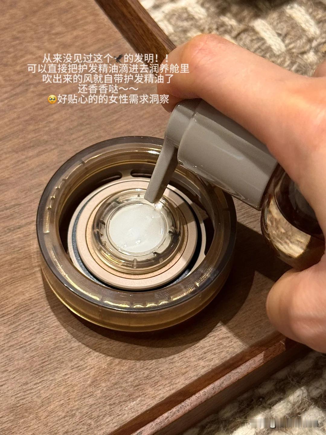 把精油滴进润养舱,再磁吸到吹风机上,