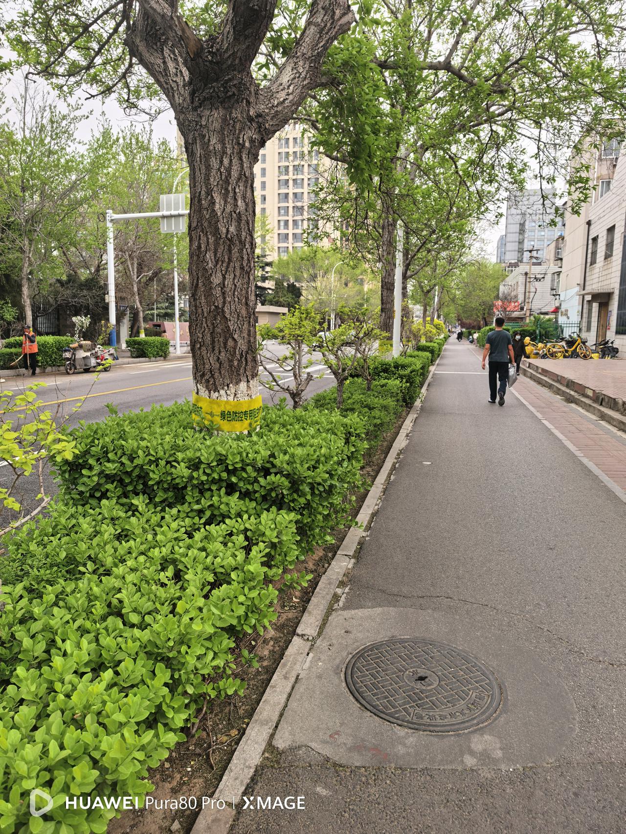 我说的这个“新景色”是利用科技手段对市区内行道树进行防病治虫(见附图)[大笑]目前市中心道路两侧行道树半腰上都缠着黄腰带,上面写着“绿色防控专用阻虫带”字样。在我的认知里这大概是“第一家”,也是我第一次看到用这种方法治虫。单独看没什么景象可言,但是如果纵向观寨,就像拉了一条黄色警戒线在行道树上,而且是在入冬前刷的防冻防病白石灰上沿同一水平线上,非常醒目。