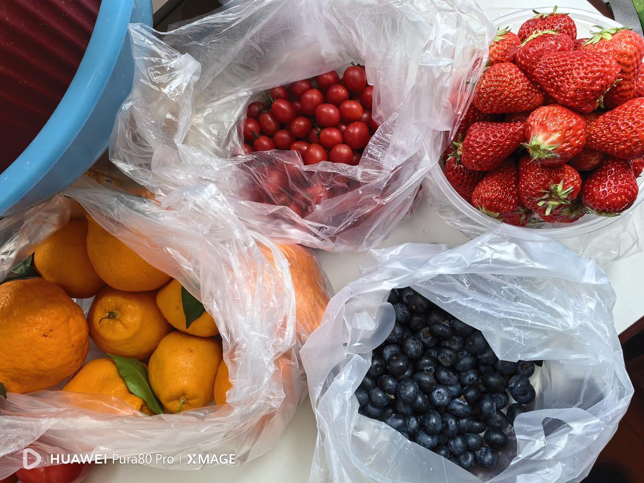 刚从早市买来的四种水果,其中海南千禧西红柿10元一斤,花了15元;耙耙柑10元3斤,两项合计32.5元。