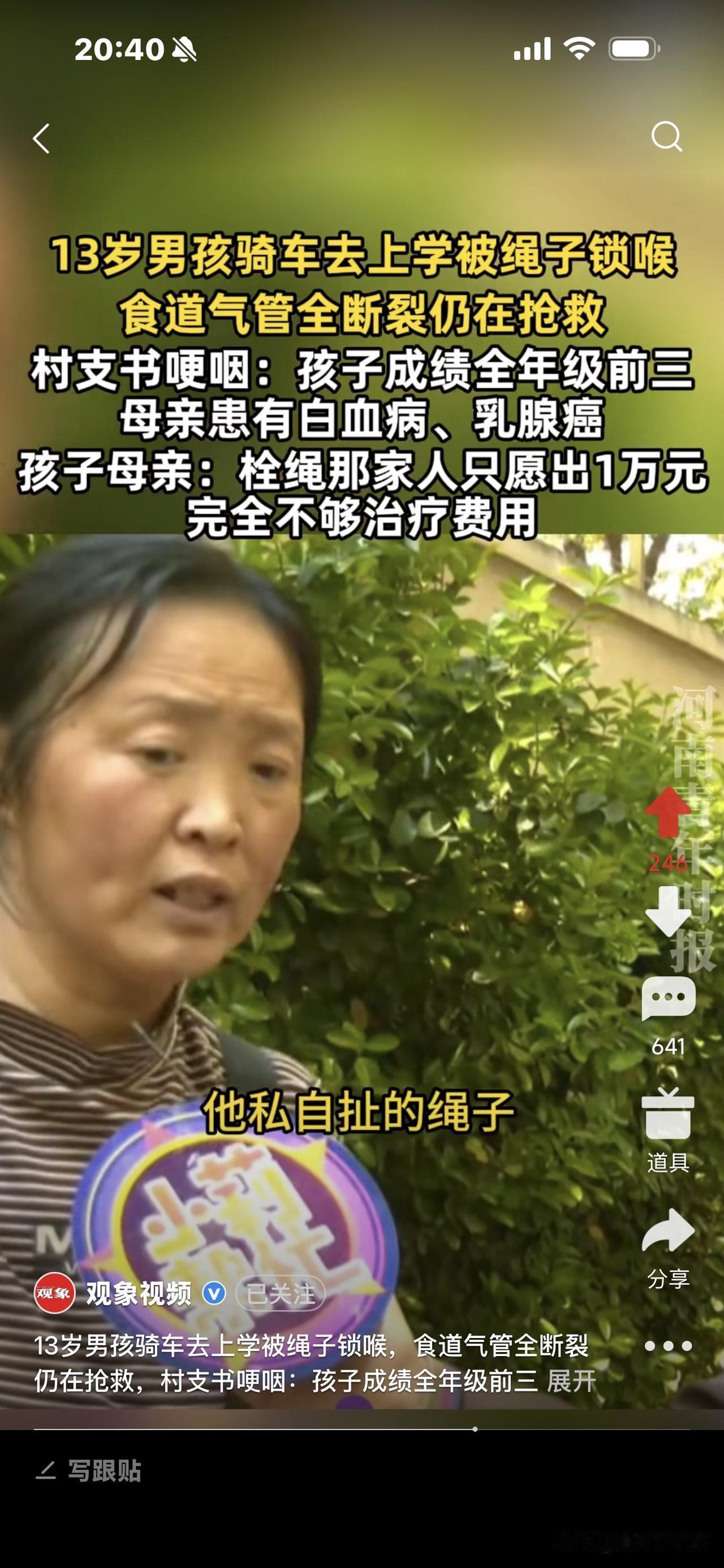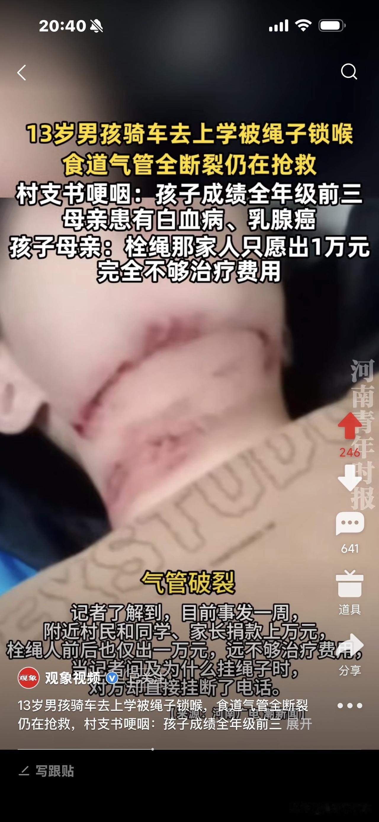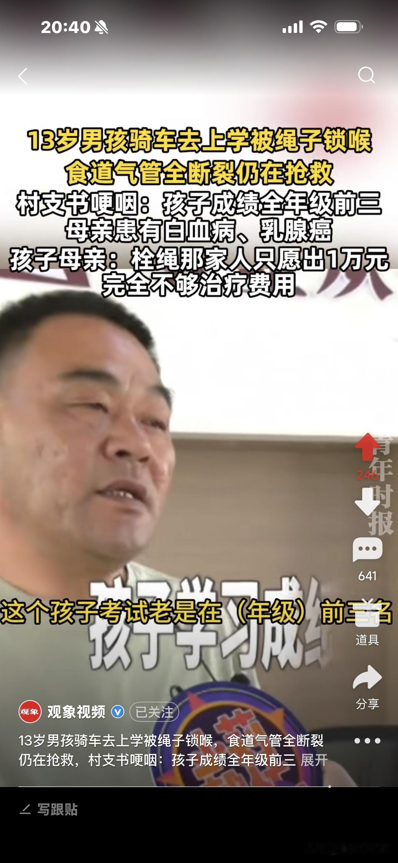 如今,牵绳子那家人只愿赔偿1万块钱,当地人募捐了1万块,但男孩的家境困难,他还在抢救中。