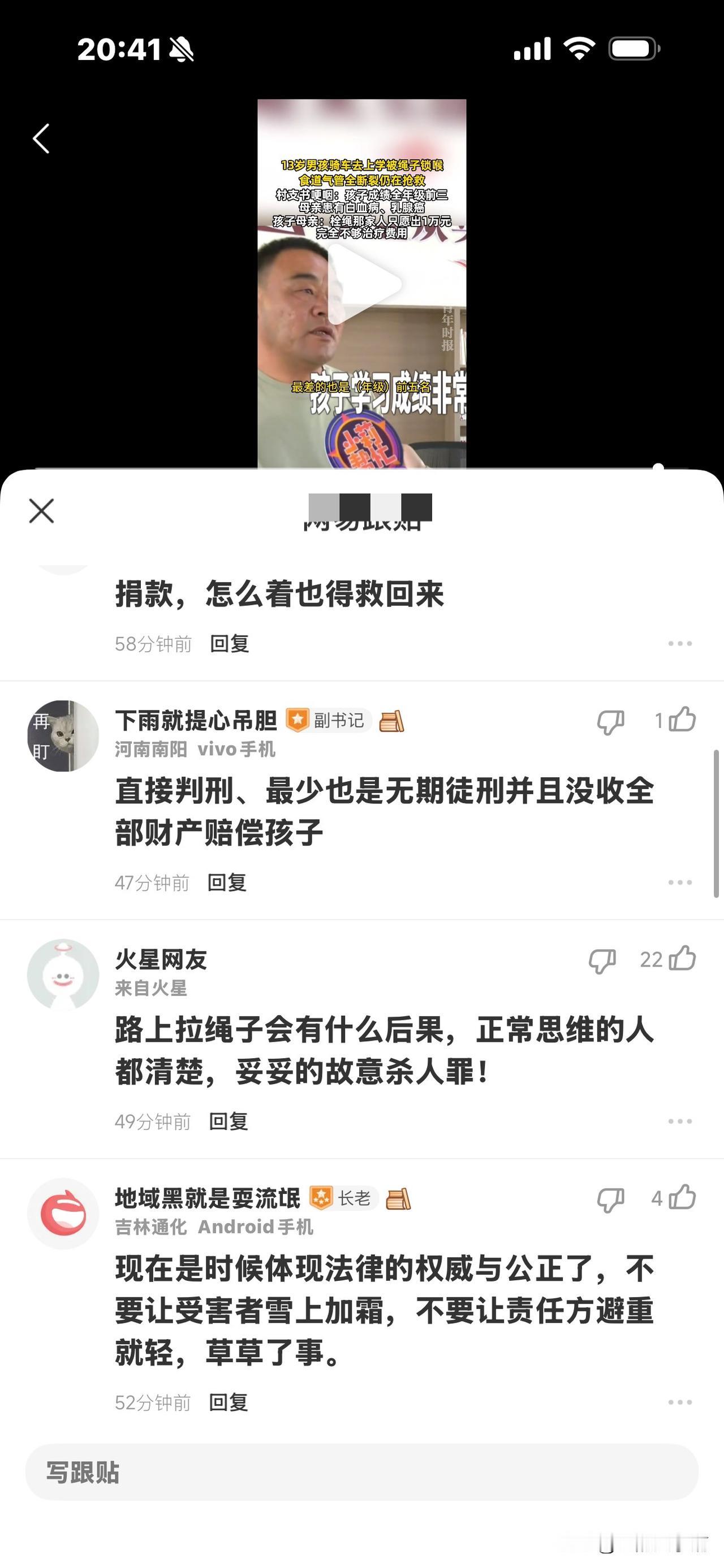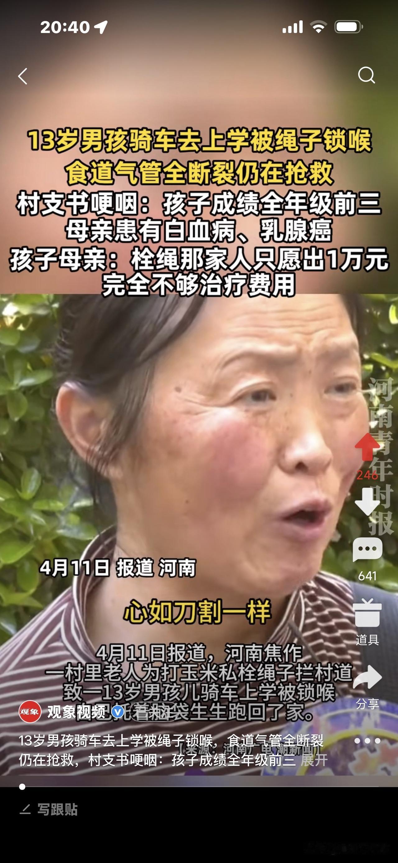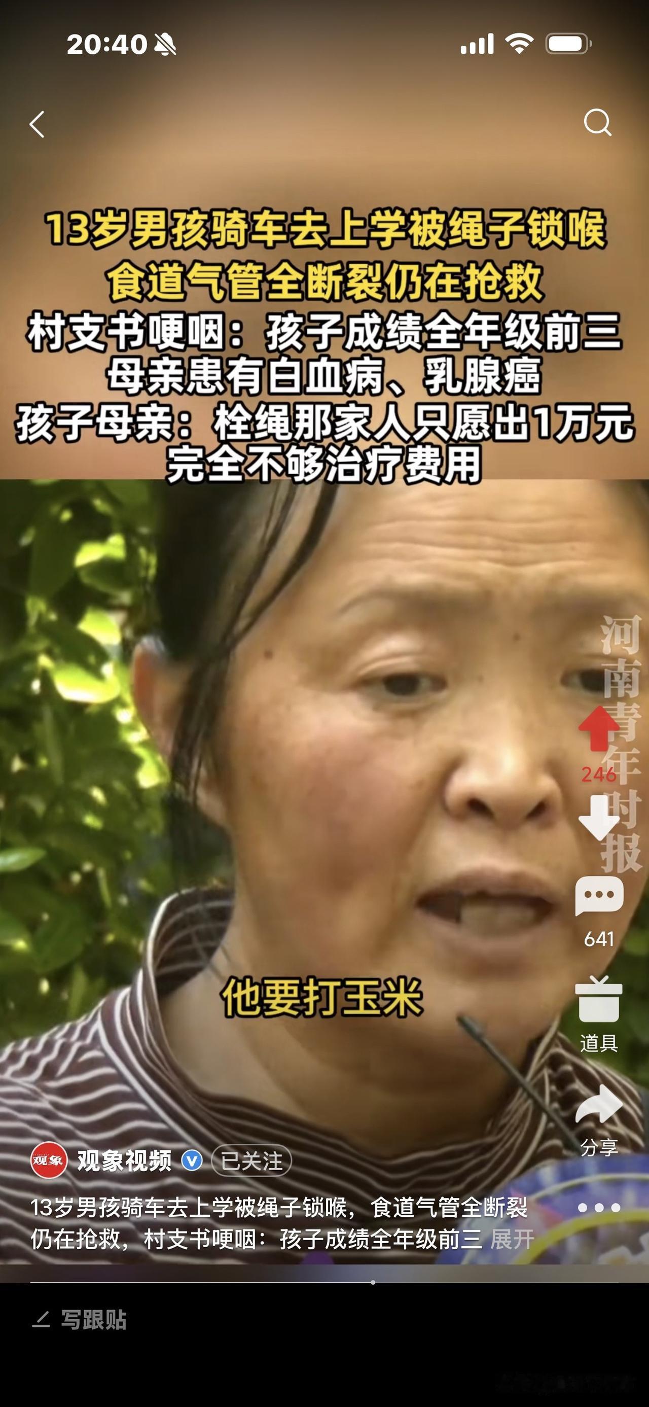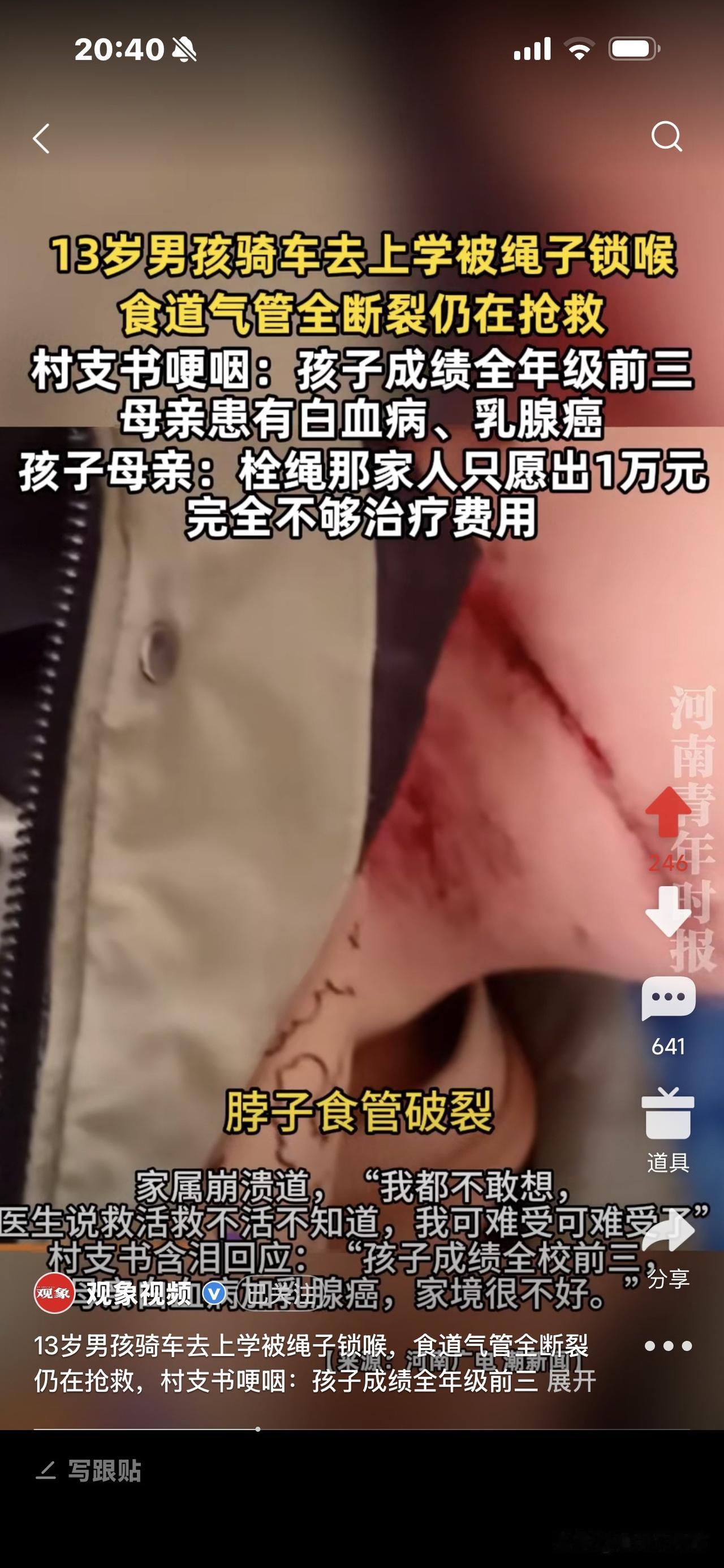如今,牵绳子那家人只愿赔偿1万块钱,当地人募捐了1万块,但男孩的家境困难,他还在抢救中。