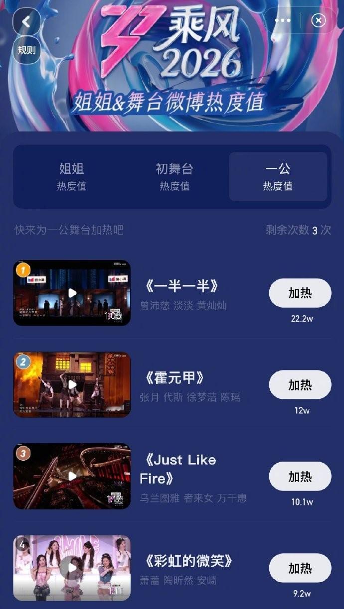 【曾沛慈一公舞台热度断层第一】一公后曾沛慈热度断层第一 4月17日,在《乘风2026》第一场公演中,演员李小冉以926分的个人乘风值夺得第一名,引发广泛讨论。据了解,截至4月17日14:00,曾沛慈在热度值榜单上,热度值超61w,排名断层第一。一公舞台《一半一半》热度超22w,排名第一。