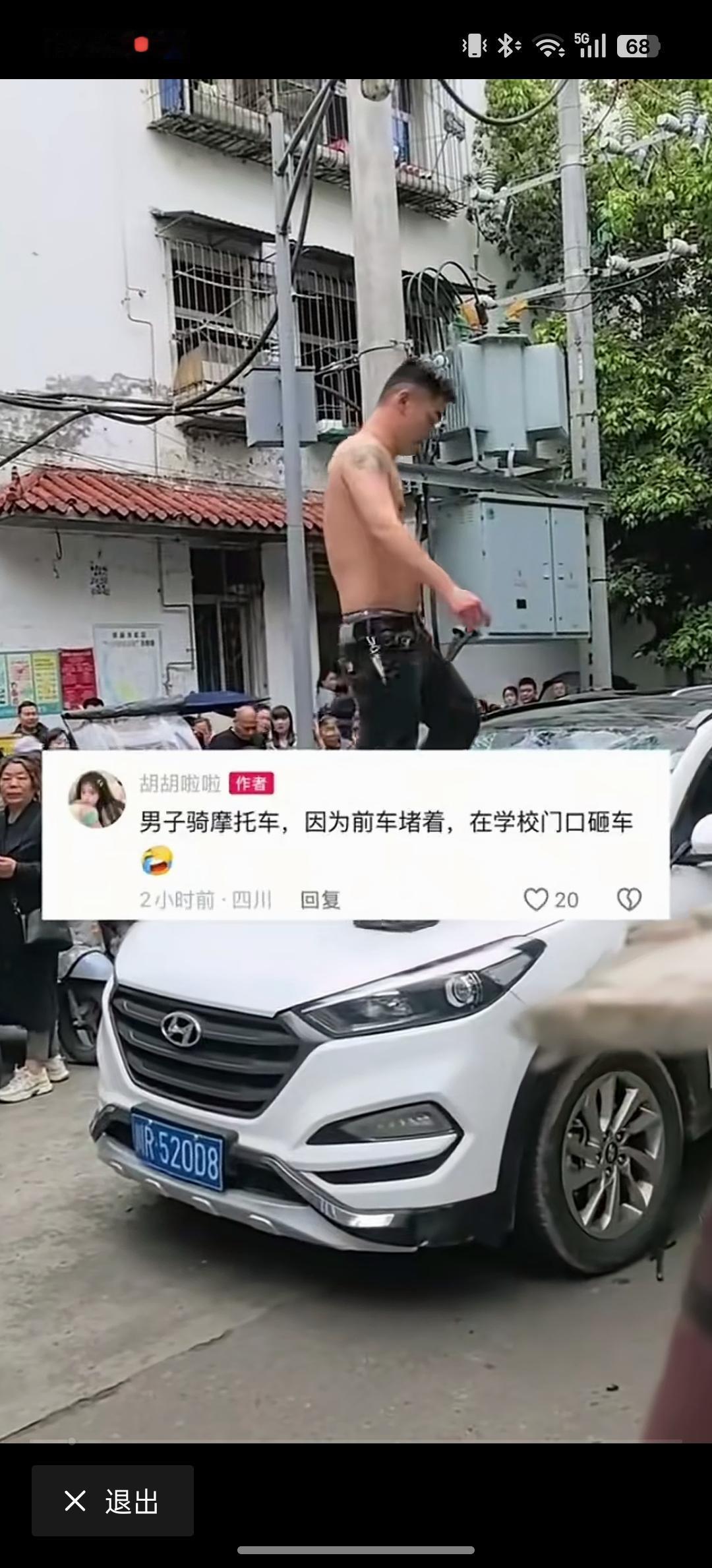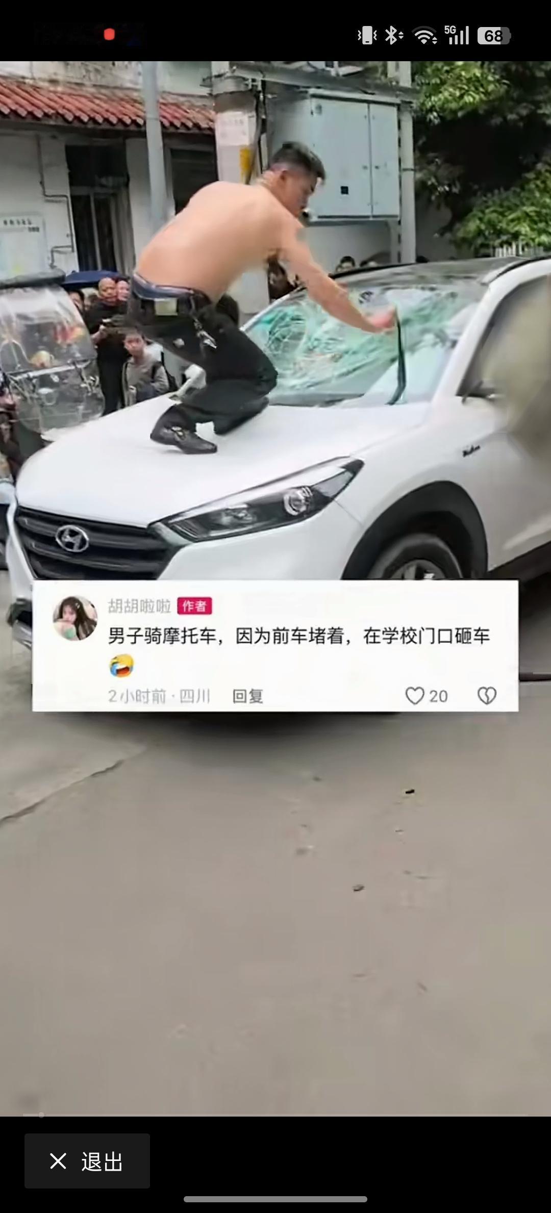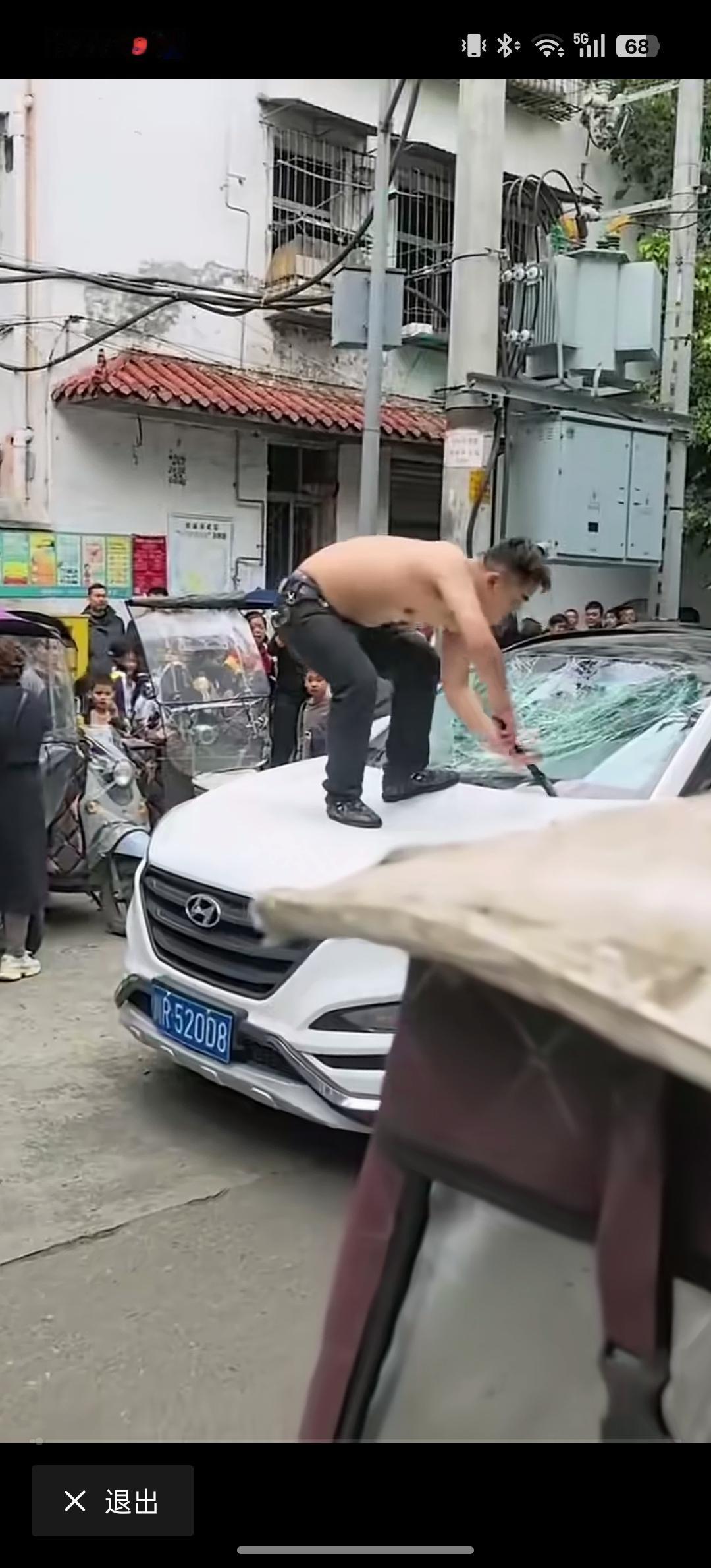 徐某上到了现代车的引擎盖上,在引擎盖上跳动,又把现代车的车玻璃给剁碎了,甚至他也把雨刮器给掰断。上到车顶把天窗也给砸碎,整个车刹时间被毁的不成样子,周围有非常多的人在那里拍照。